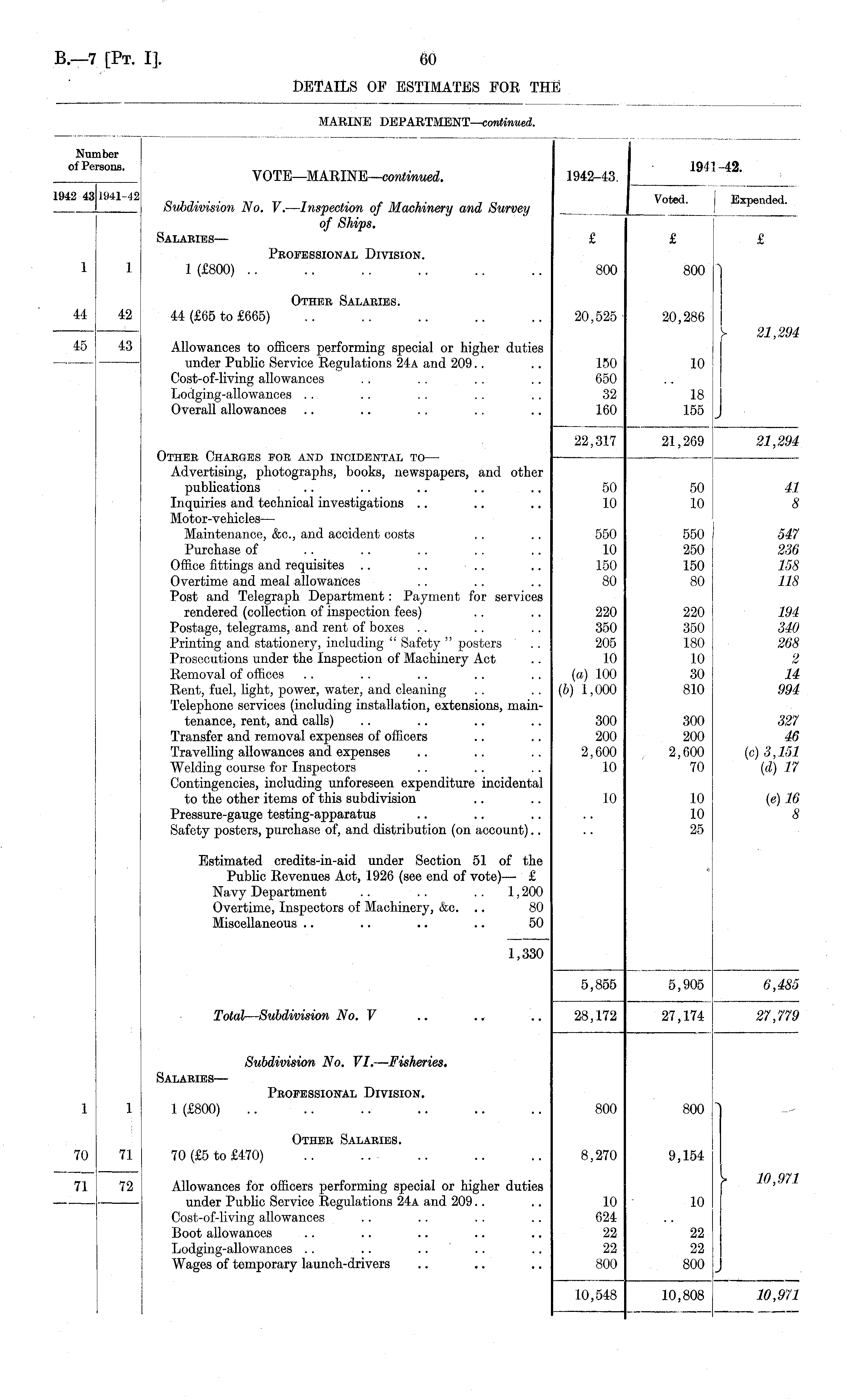 Number of Persona. VOTE—MAKINE— continued. 1942-43. _ 1942 43 1941-42 . . , Voted Expended . Subdivision No. V. — Inspection of Machinery and Survey of Ships. Salaries— £ £ £ Professional Division. 1 1 1 (£800) 800 800 ' Other Salaries. 44 42 44 (£65 to £665) .. .. .. .. .. 20,525 20,286 Y 21,294 45 43 Allowances to officers performing special or higher duties under Public Service Regulations 24a and 209.. .. 150 10 j Cost-of-living allowances .. .. .. .. 650 Lodging-allowances . . .. . . . . .. 32 18 Overall allowances .. .. .. .. .. 160 155 22,317 21,269 21,294 Other Charges for and incidental to — Advertising, photographs, books, newspapers, and other publications .. .. .. .. .. 50 50 41 Inquiries and technical investigations .. .. .. 10 10 8 Motor-vehicles — Maintenance, &c, and accident costs .. .. 550 550 547 Purchase of .. .. .. .. .. 10 250 236 Office fittings and requisites .. .. .. .. 150 150 158 Overtime and meal allowances .. .. .. 80 80 118 Post and Telegraph Department: Payment for services rendered (collection of inspection fees) .. .. 220 220 194 Postage, telegrams, and rent of boxes . . .. .. 350 350 340 Printing and stationery, including " Safety " posters . . 205 180 268 Prosecutions under the Inspection of Machinery Act .. 10 10 2 Removal of offices .. .. .. .. (a) 100 30 14 Rent, fuel, light, power, water, and cleaning . . . . (b) 1,000 810 994 Telephone services (including installation, extensions, maintenance, rent, and calls) .. .. .. .. 300 300 327 Transfer and removal expenses of officers .. .. 200 200 46 Travelling allowances and expenses .. .. .. 2,600 2,600 (c) 3,151 Welding course for Inspectors .. .. .. 10 70 (d) 17 Contingencies, including unforeseen expenditure incidental to the other items of this subdivision .. .. 10 10 (e) 16 Pressure-gauge testing-apparatus .. .. .. .. 10 8 Safety posters, purchase of, and distribution (on account).. .. 25 Estimated credits-in-aid under Section 51 of the Public Revenues Act, 1926 (see end of vote) — £ Navy Department .. .. .. 1,200 Overtime, Inspectors of Machinery, &c. .. 80 Miscellaneous .. .. .. .. 50 1,330 5,855 5,905 6,485 Totalr-Subdwision No. V .. .. .. 28,172 27,174 27,779 Subdivision No. VI. — Fisheries. Salaries— Professional Division. 1 1 1 (£800) .. .. .. .. .. .. 800 800 ' Other Salaries. 70 71 70 (£5 to £470) .. .. .. 8,270 9,154 — ... > 10 971 71 72 Allowances for officers performing special or higher duties f ' under Public Service Regulations 24a and 209.. .. 10 10 Cost-of-living allowances .. .. . . .. 624 Boot allowances .. .. .. .. .. 22 22 Lodging-allowances .. .. .. .. .. 22 22 Wages of temporary launch-drivers .. .. .. 800 800 10,548 10,808 10,971