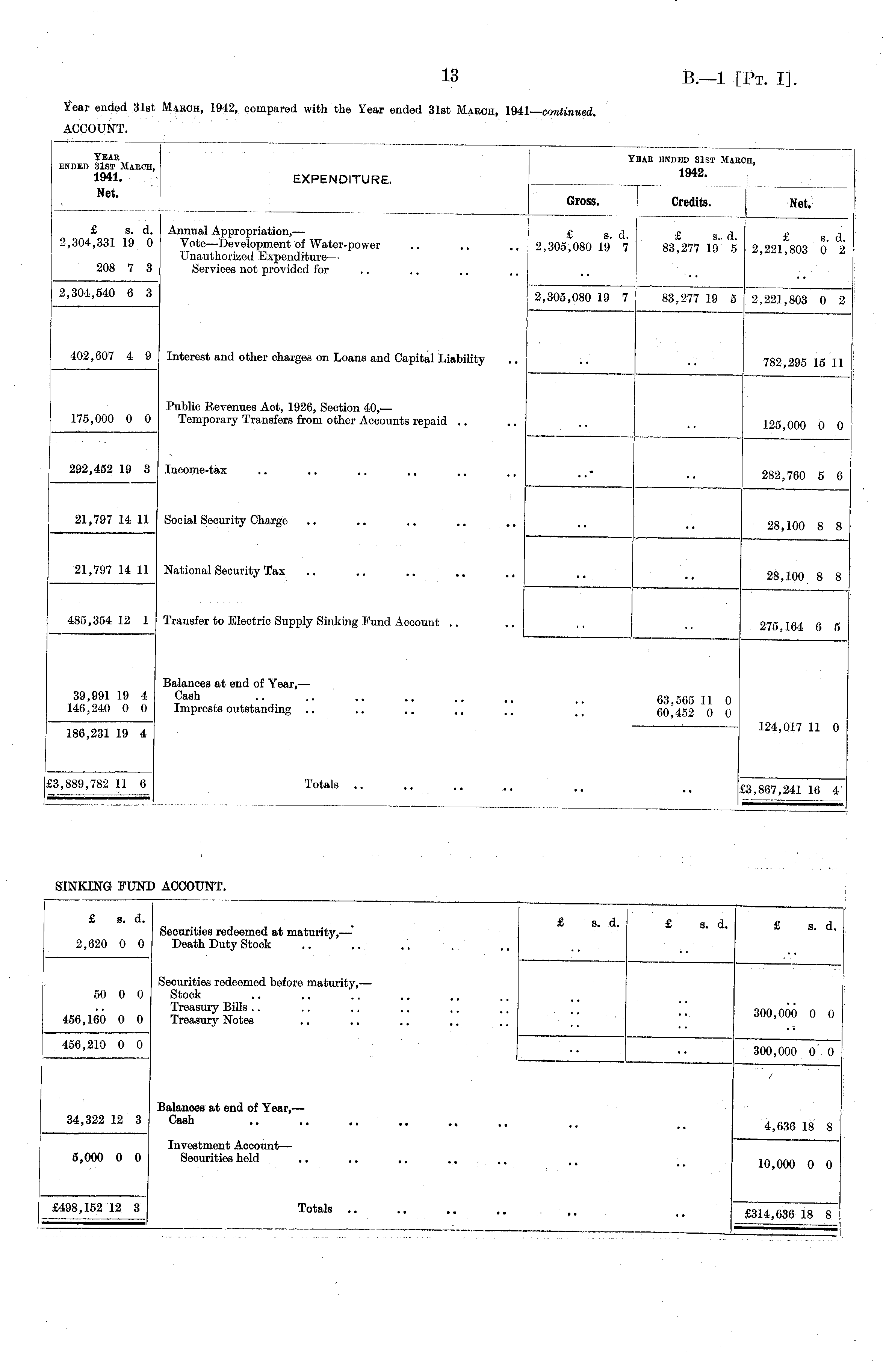 ACCOUNT. YEAE . Yeak ended 81st March, ended 31st March, ' 1941. EXPENDITURE. Net _> Gross. Credits. Net. £ s. d. Annual Appropriation,—■ £ s. d. £ s d £ s d 2,304,331 19 0 Vote—Development of Water-power .. .. .. 2,305,080 19 7 83,277 19 5 2 221 803 0 2 Unauthorized Expenditure— ' ' 208 7 3 Services not provided for 2,304,540 6 3 2,305,080 19 7 83,277 19 5 ~2,221,803 0 2 402,607 4 9 Interest and other charges on Loans and Capital Liability .. .. .. 782 295 15 11 Public Revenues Act, 1926, Section 40, — 175,000 0 0 Temporary Transfers from other Accounts repaid .. .. .. 125 000 0 0 292,452 19 3 Income-tax .. .. .. .. .. 282 760 5 6 21,797 14 11 Social Security Charge .. .. .. .. ,, 28 100 8 8 21,797 14 11 National Security Tax .. .. .. .. .. it _ 28 100 8 8 485,354 12 1 Transfer to Electric Supply Sinking Fund Acoount .. .. .. 275 164 6 5 Balances at end of Year, — 39,991 19 4 Cash .. .. .. ,, 1( t t 63,565 11 0 146,240 0 0 Imprests outstanding .. .. .. .. ,, i ' 60 452 0 0 186,231 19 4 124,017 11 0 £3,889,782 11 6 j Totals .. .. .. .. £3,867,241 16 4 SINKING FUND ACCOUNT. £ b. d. £sd £sd £ d Securities redeemed at maturity,—* " ' s. . 2,620 0 0 Death Duty Stock Securities redeemed before maturity,— 50 0 0 Stock 456,160 0 0 Treasury Notes " 300,000 0 0 456,210 0 0 300,000 0 0 / Balances at end of Year,— 34 ' 32212 3 Cash .. 4,636 18 8 Investment Account— 5,000 0 0 Securities held .. .. .. .. .. _ jq qqq q £498,152 12 3 Totals .. .. .. .. .. £314,636 18 8