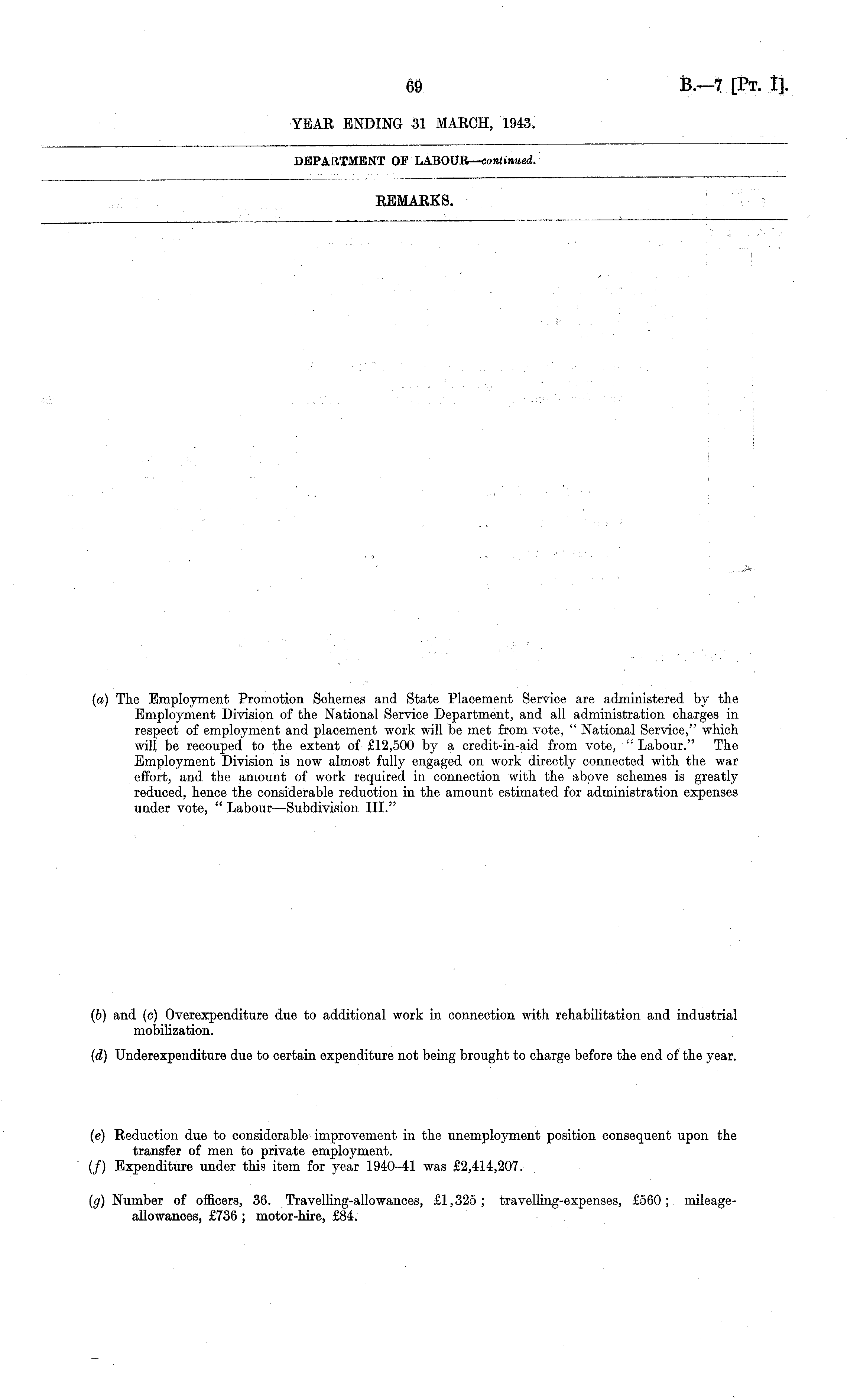 DEPARTMENT OF LABOUR— continued. REMAKES. \ _____ —— — - i -—' —h-—-—■—' i 1 ' ! (a) The Employment Promotion Schemes and State Placement Service are administered by the Employment Division of the National Service Department, and all administration charges in respect of employment and placement work will be met from vote, " National Service," which will be recouped to the extent of £12,500 by a credit-in-aid from vote, " Labour." The Employment Division is now almost fully engaged on work directly connected with the war effort, and the amount of work required in connection with the above schemes is greatly reduced, hence the considerable reduction in the amount estimated for administration expenses under vote, " Labour —Subdivision III." (b) and (o) Overexpenditure due to additional work in connection with rehabilitation and industrial mobilization. (d) Underexpenditure due to certain expenditure not being brought to charge before the end of the year. (e) Reduction due to considerable improvement in the unemployment position consequent upon the transfer of men to private employment. (/) Expenditure under this item for year 1940-41 was £2,414,207. (g) Number of officers, 36. Travelling-allowances, £1,325 ; travelling-expenses, £560 ; mileageallowances, £736 ; motor-hire, £84.