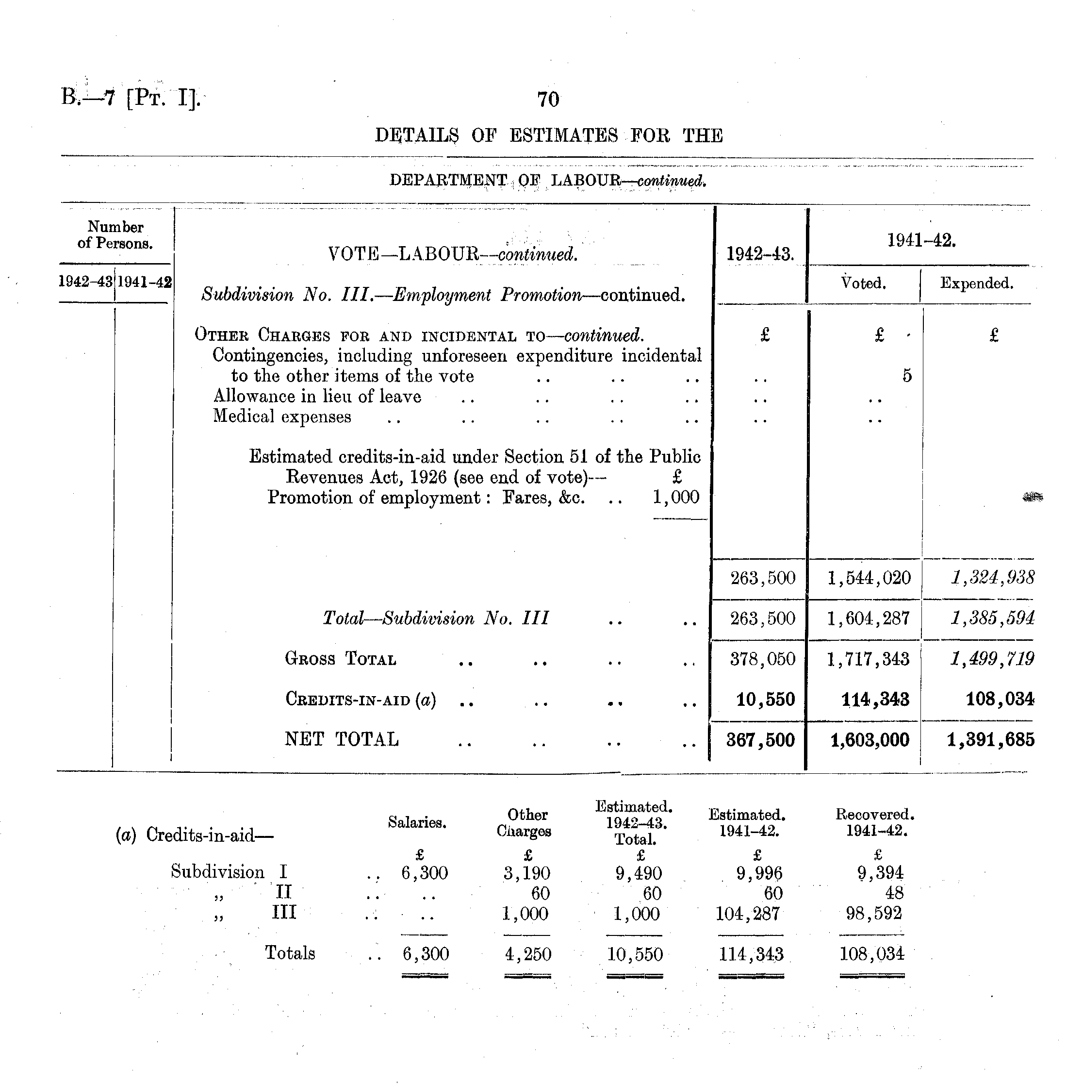 Number ° fPer8On8 - VOTE-LABOUR~- C 1942-43. 1941 ~ 42 ' 1942-43 1941-42 . . ... ' . Voted. Expended. subdivision No. III. — Employment Promotion —continued. Other Charges for and incidental to — continued. £ £ £ Contingencies, including unforeseen expenditure incidental to the other items of the vote .. .. .. .. 5 Allowance in lieu of leave Medical expenses Estimated credits-in-aid under Section 51 of the Public Revenues Act, 1926 (see end of vote) — £ Promotion of employment: Fares, &c. .. 1,000 i 263,500 1,544,020 J 1,324,938 Total—Subdivision No. Ill .. .. 263,500 1,604,287 1,385,594 Gross Total .. .. .. .. 378,050 1,717,343 1,499,719 Credits-in-aid (a) .. .. .. .. 10,550 114,343 108,034 NET TOTAL .. .. .. .. 367,500 1,603,000 1,391,685 1 • I