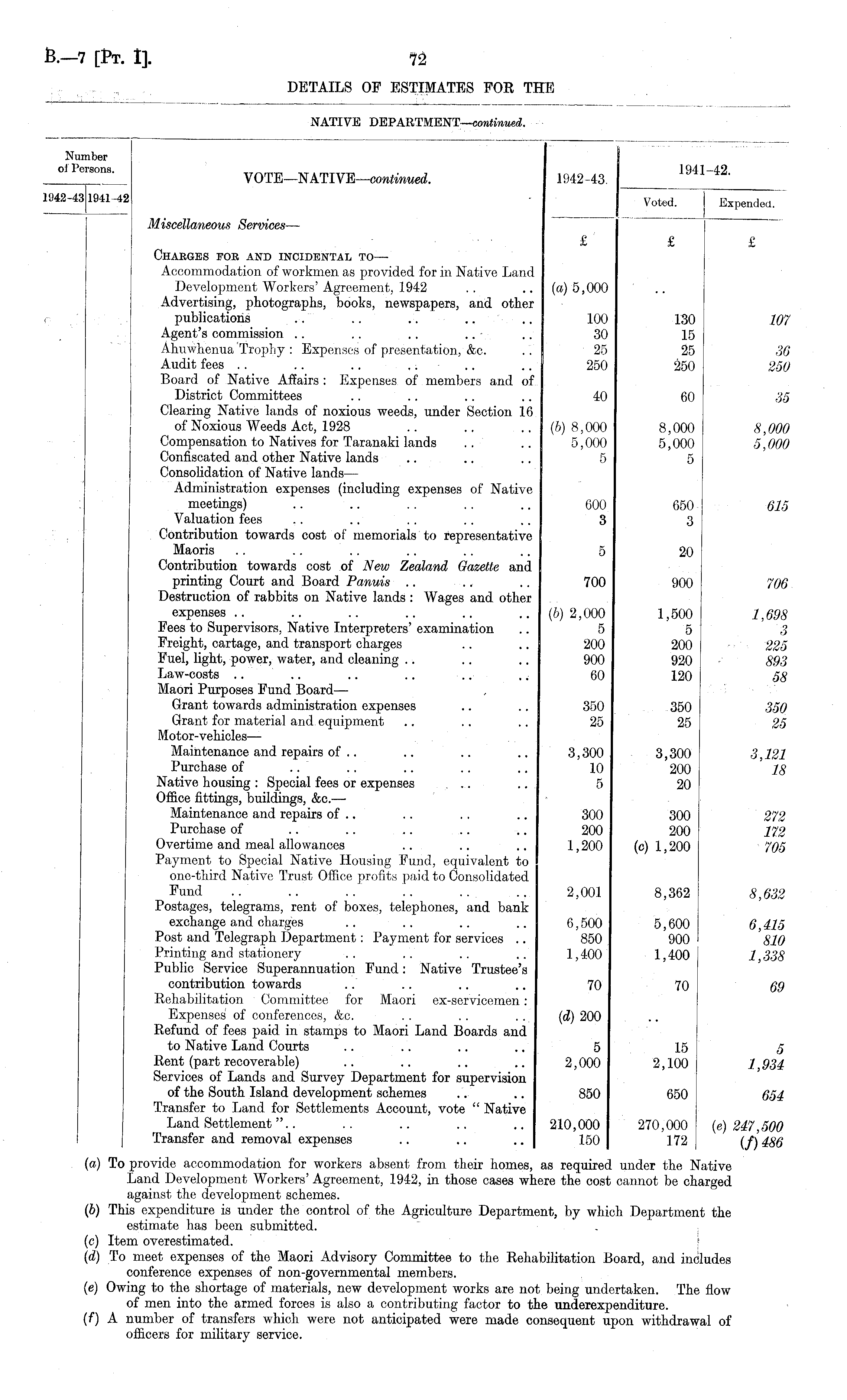 (a) To provide accommodation for workers absent from their homes, as required under the Native Land Development Workers' Agreement, 1942, in those cases where the cost cannot be charged against the development schemes. (b) This expenditure is under the control of the Agriculture Department, by which Department the estimate has been submitted. (c) Item overestimated. | (d) To meet expenses of the Maori Advisory Committee to the Rehabilitation Board, and includes conference expenses of non-governmental members. (e) Owing to the shortage of materials, new development works are not being undertaken. The flow of men into the armed forces is also a contributing factor to the underexpenditure. (f) A number of transfers which were not anticipated were made consequent upon withdrawal of officers for military service.