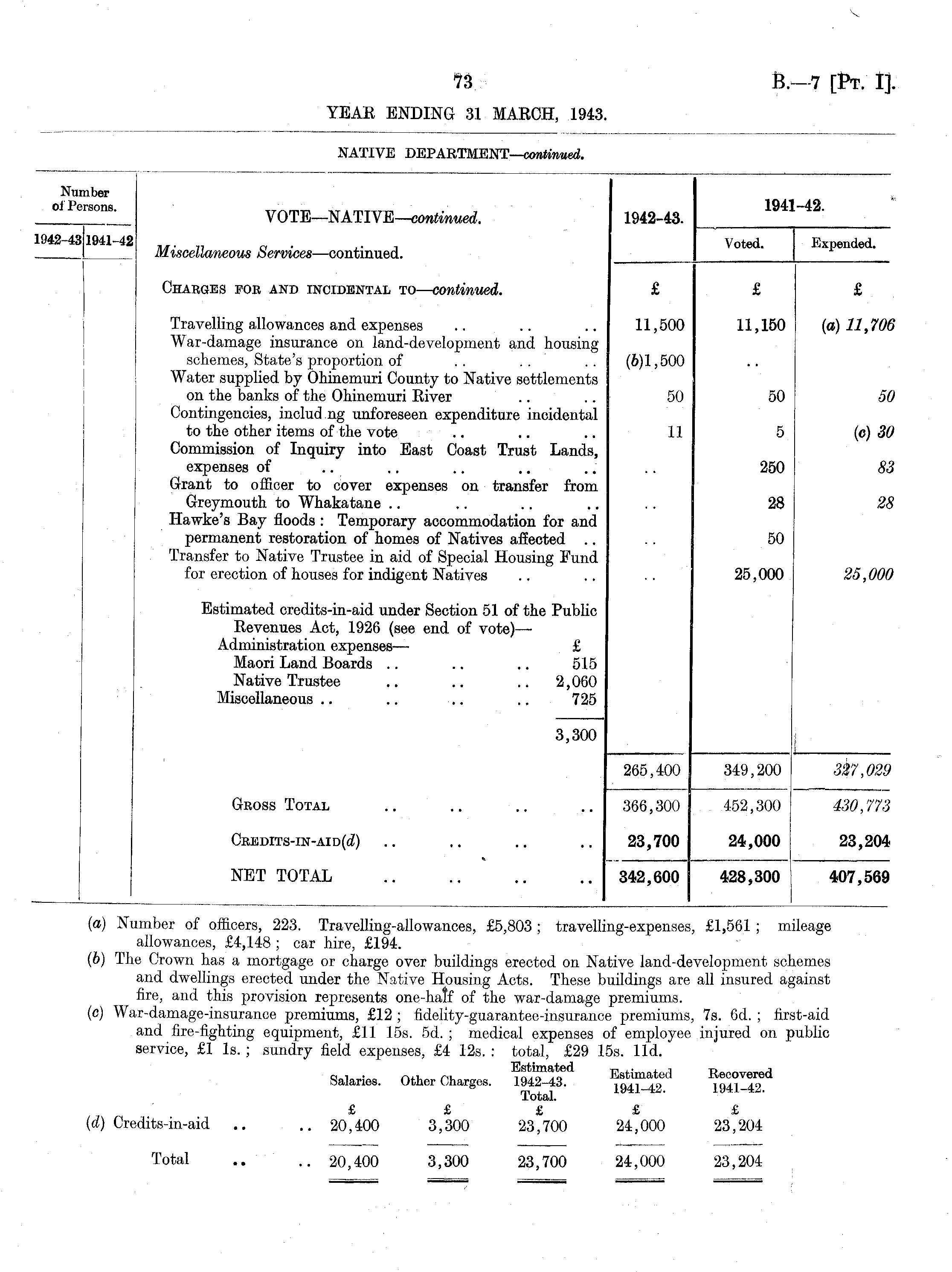 (a) Number of officers, 223. Travelling-allowances, £5,803 ; travelling-expenses, £1,561 ; mileage allowances, £4,148 ; oar hire, £194. (6) The Crown has a mortgage or charge over buildings erected on Native land-development schemes and dwellings erected under the Native Housing Acts. These buildings are all insured against fire, and this provision represents one-half of the war-damage premiums. (c) War-damage-insurance premiums, £12 ; fidelity-guarantco-insurance premiums, 7s. 6d. ; first-aid and fire-fighting equipment, £11 15s. sd. ; medical expenses of employee injured on public service, £1 Is. ; sundry field expenses, £4 12s. : total, £29 15s. lid. <s i • Ati, rn, ■fn^ E lo ed Estimated Recovered Salaries. Other Charges. 1942-43. 1941-42 1941-42 Total. £ £ £ £ £ (d) Credits-in-aid .. .. 20,400 3,300 23,700 24,000 23,204 Total .. .. 20,400 3,300 23,700 24,000 23,204