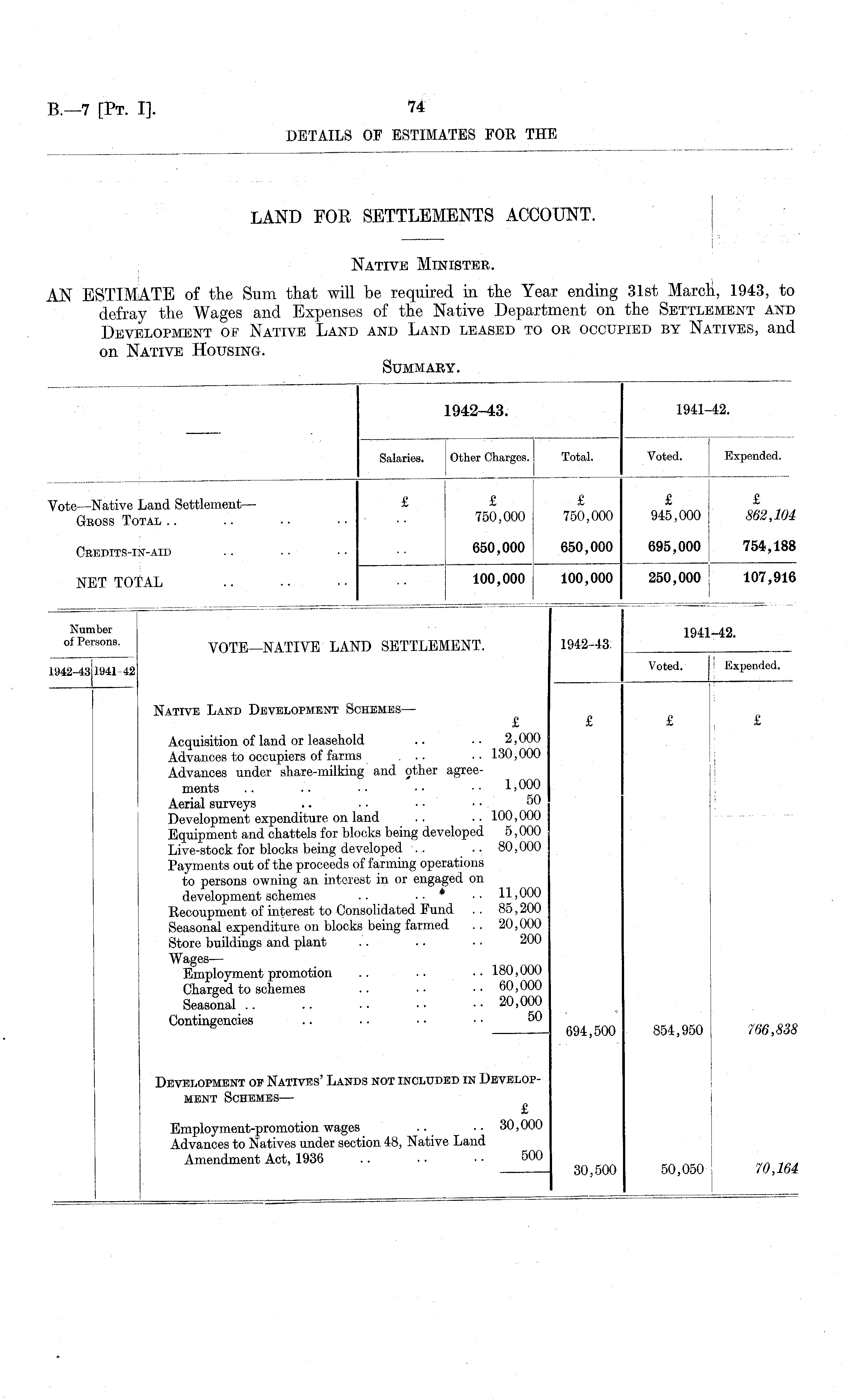 Native Minister. AN ESTIMATE of the Sum that will be required in the Year ending 31st March, 1943, to defray the Wages and Expenses of the Native Department on the Settlement and Development of Native Land and Land leased to or occupied by Natives, and on Native Housing. Summary.