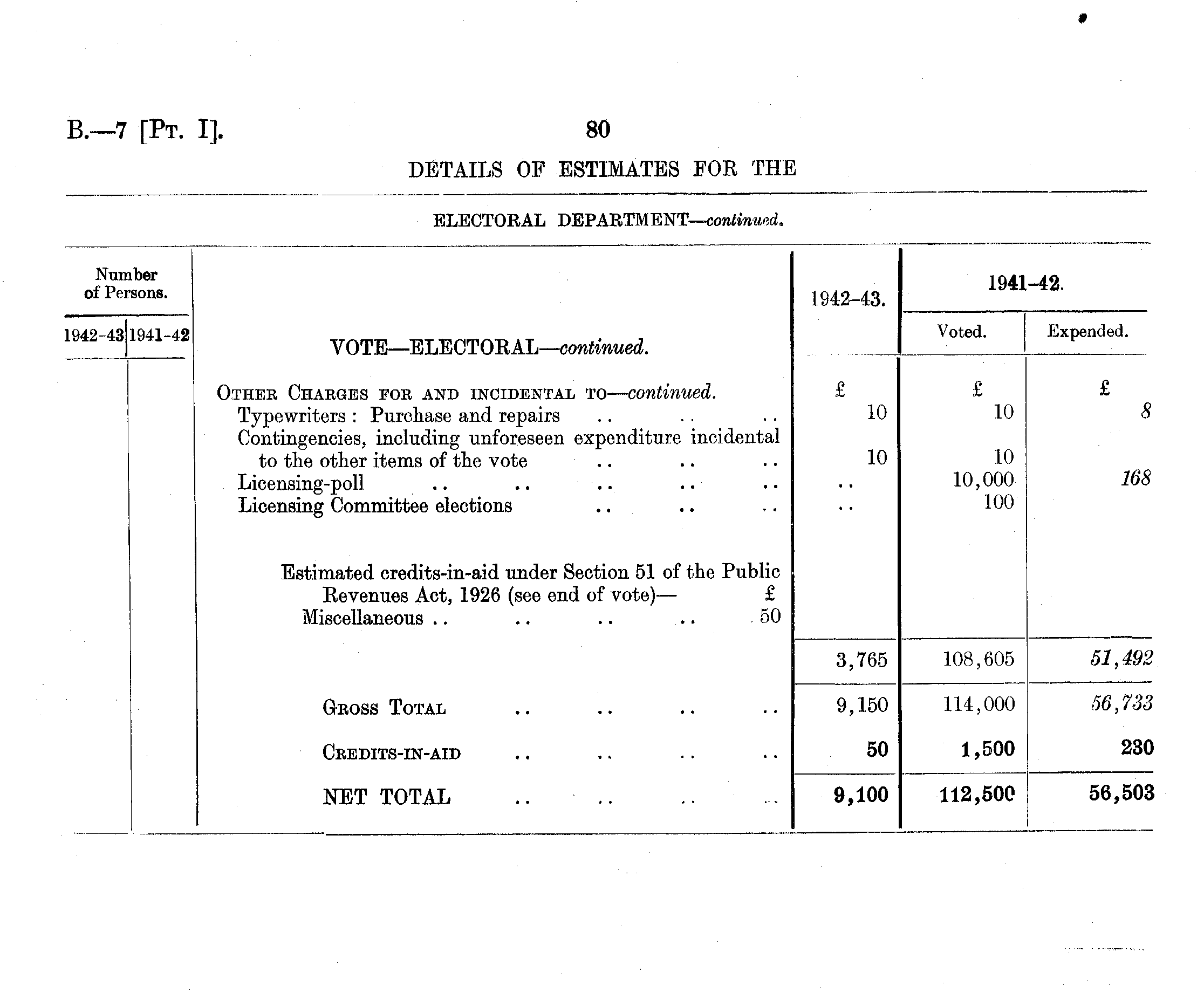 Number i in of Persons. 1942-43. 1W1-M-1Q42-43 1941-42 Voted. Kxpended. Zl!___l VOTE—ELECTOEAL— continued. 1 Other Chaeges for and incidental to — continued. £ £ £ Typewriters : Purchase and repairs .. . . . . 10 10 8 Contingencies, including unforeseen expenditure incidental to the other items of the vote .. .. .. 10 10 Licensing-poll .. .. .. .. .. •■ 10,000 168 Licensing Committee elections .. .. .. • • 100 Estimated credits-in-aid under Section 51 of the Public Kevenues Act, 1926 (see end of vote) — £ Miscellaneous .. .. .. .. 50 3,765 108,605 51,492 Geoss Total 9,150 114,000 56,733 Ceedits-in-aid .. .. .. .. 50 1,500 230 NET TOTAL ... 9,100 112,500 56,503