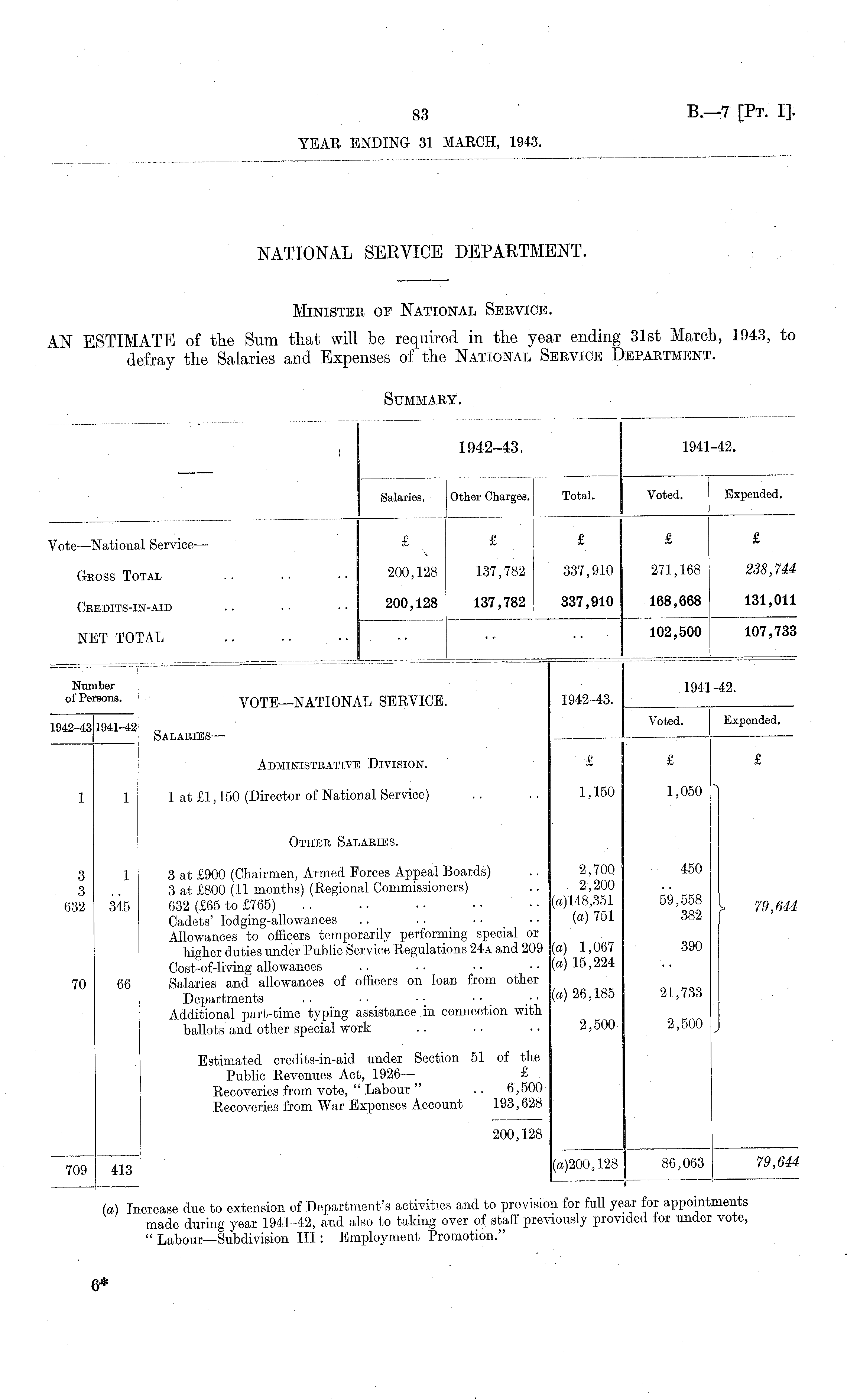 Minister of National Service. AN ESTIMATE of the Sum that will be required in the year ending 31st March, 1943, to defray the Salaries and Expenses of the National Service Department. Summary.