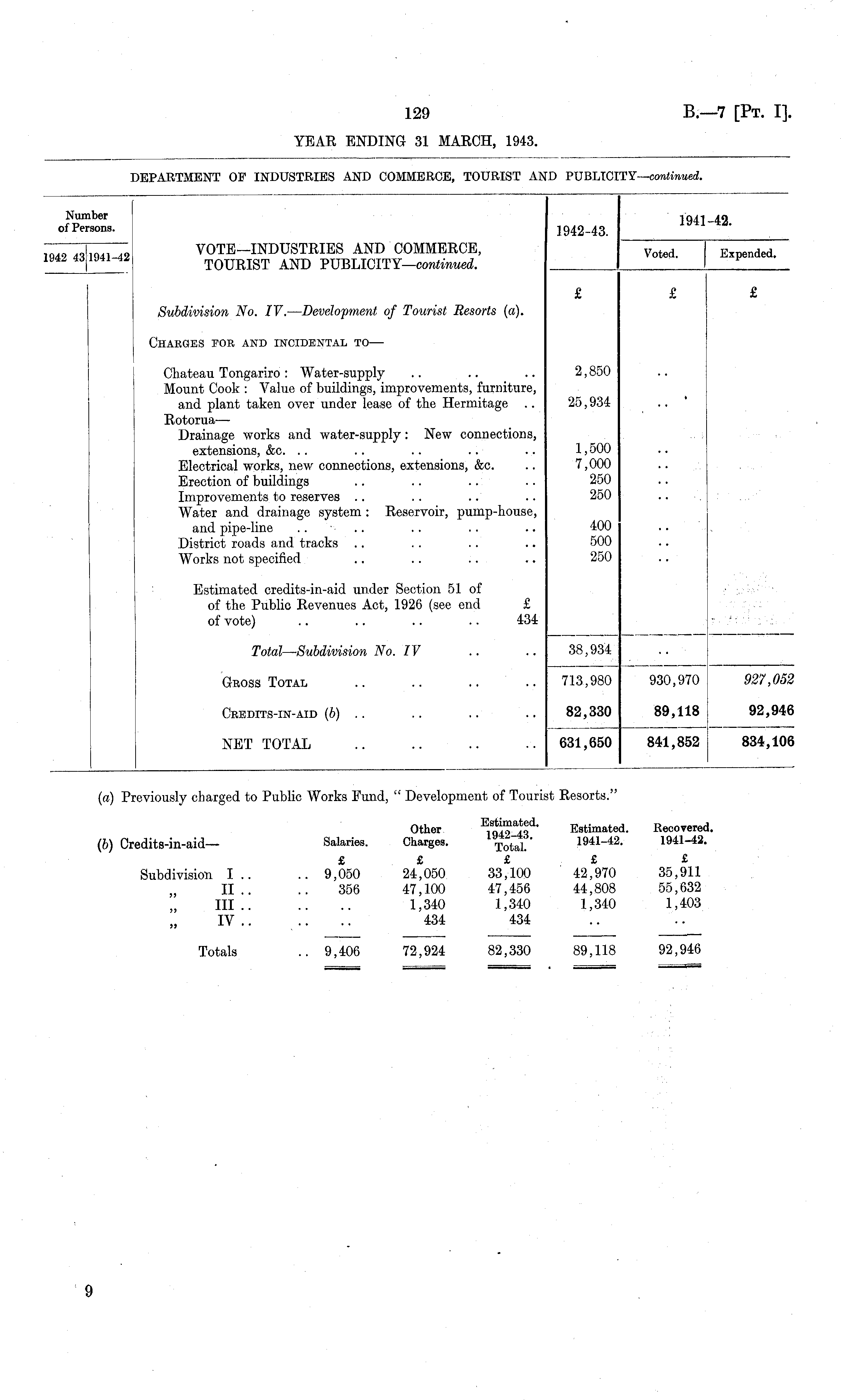 Number 1941-42 of Persons. 1942-43 VOTE-INDUSTRIES AND COMMERCE, Expended. TOURIST AND PUBLICITY—coniwraei. £ £ £ Subdivision No. IV. — Development of Tourist Resorts (a). Charges for and incidental to — Chateau Tongariro : Water-supply .. .. .. 2,850 Mount Cook : Value of buildings, improvements, furniture, and plant taken over under lease of the Hermitage .. 25,934 Rotorua — Drainage works and water-supply: New connections, extensions, &c. .. .. .. .. .. l> 500 Electrical works, new connections, extensions, &c. .. 7,000 Erection of buildings .. .. .. .. 250 Improvements to reserves .. .. .. .. 250 Water and drainage system : Reservoir, pump-house, and pipe-line . . .. .. . . .. 400 District roads and tracks .. . . .. .. 500 Works not specified .. .. .. .. 250 Estimated credits-in-aid under Section 51 of of the Public Revenues Act, 1926 (see end £ of vote) .. .. .. .. 434 Total—Subdivision No. IV .. .. 38,934 Gross Total 713,980 930,970 927,052 Ckbdits-in-aid (6) 82,330 89,118 92,946 NET TOTAL 631,650 841,852 834,106
