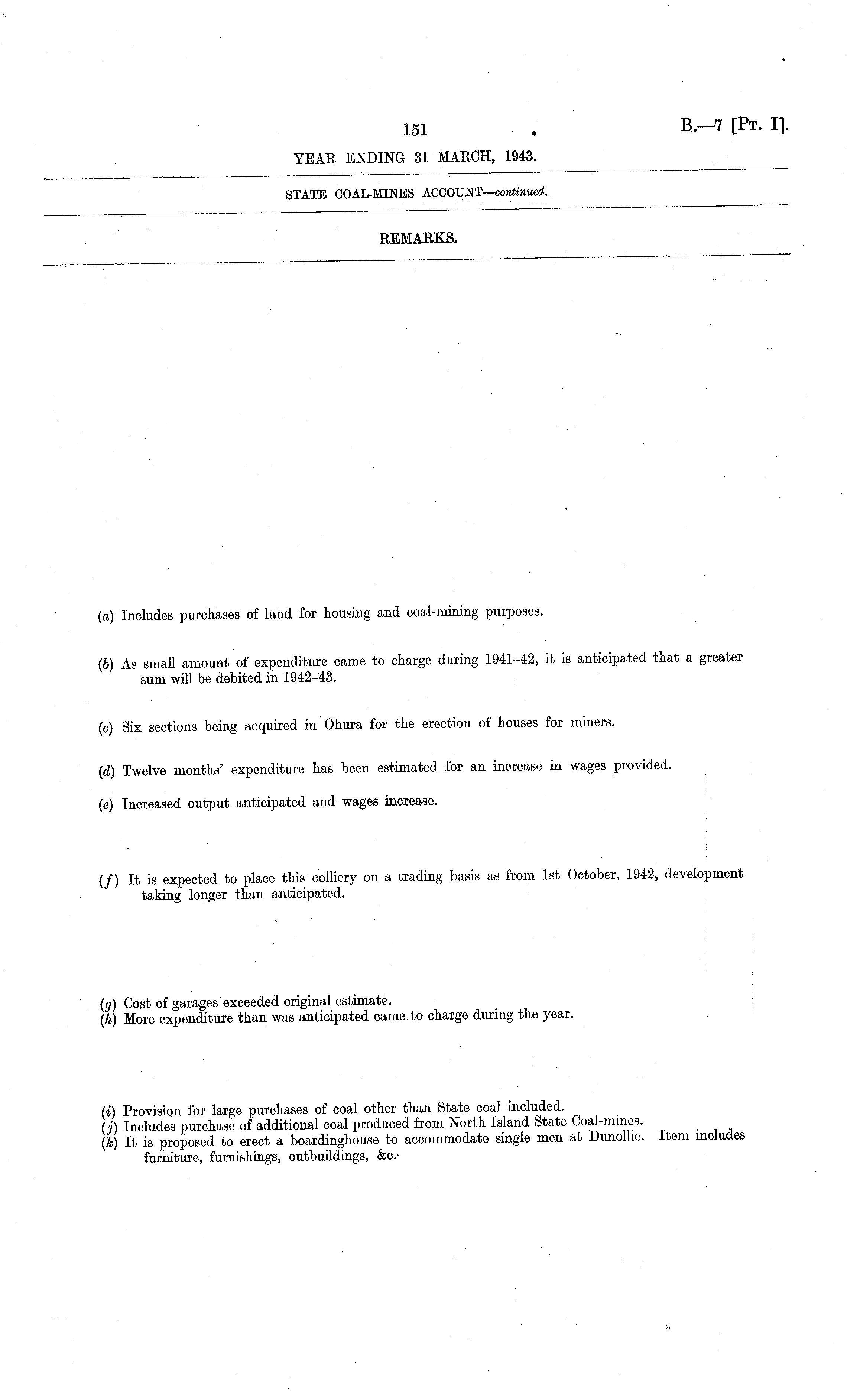 REMARKS. (a) Includes purchases of land for housing and coal-mining purposes. (6) As small amount of expenditure came to charge during 1941-42, it is anticipated that a greater sum will be debited in 1942-43. (c) Six sections being acquired in Ohura for the erection of houses for miners. (d) Twelve months' expenditure has been estimated for an increase in wages provided. (e) Increased output anticipated and wages increase. (/) It is expected to place this colliery on a trading basis as from Ist October, 1942, development taking longer than anticipated. (g) Cost of garages exceeded original estimate. (h) More expenditure than was anticipated came to charge during the year. i (i) Provision for large purchases of coal other than State coal included. (j) Includes purchase of additional coal produced from North Island State Coal-mines. (k) It is proposed to erect a boardinghouse to accommodate single men at 'Dunoliic. Item includes furniture, furnishings, outbuildings, &c