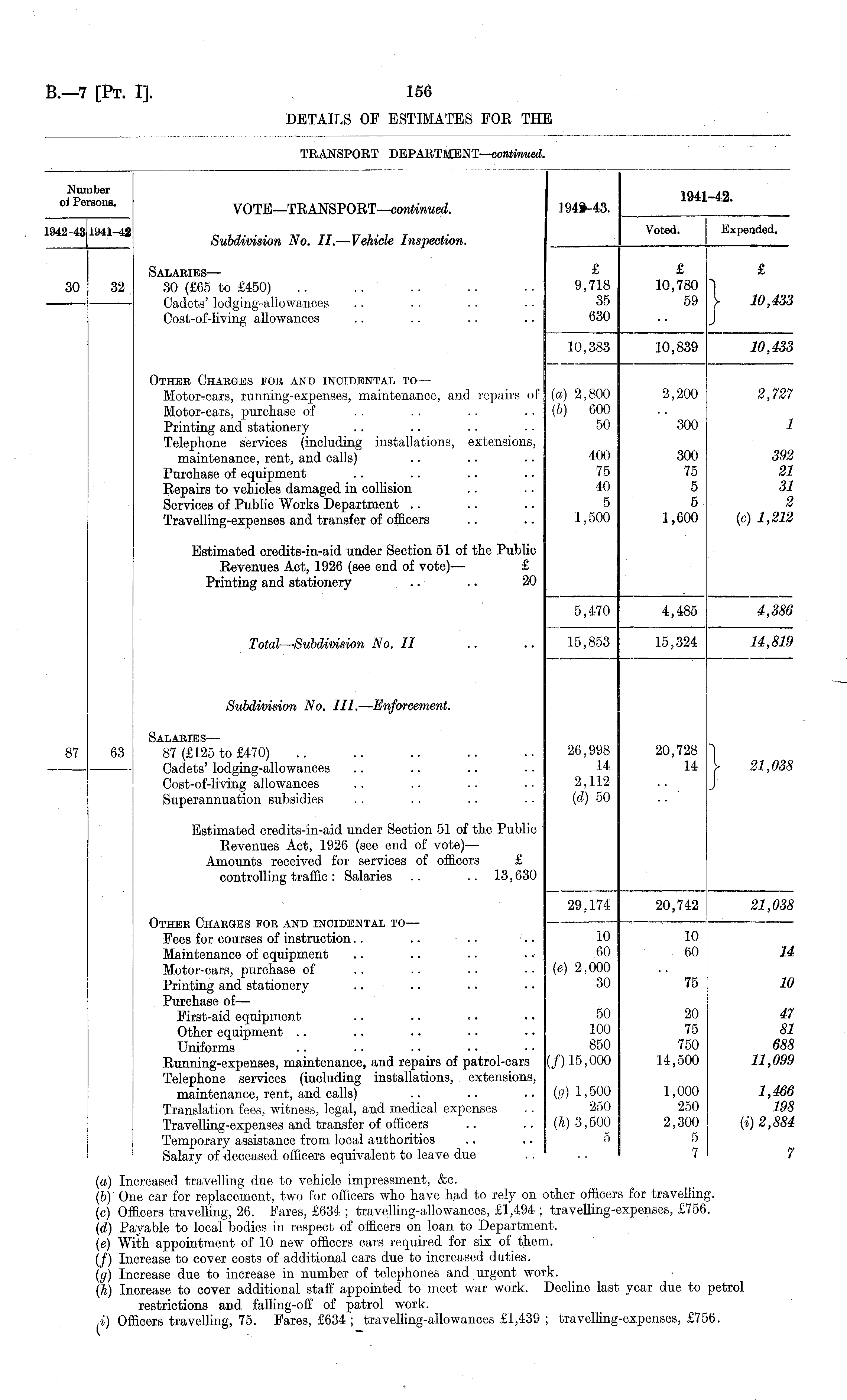 Number 1941-42 oi Persons. VOTE—TRANSPORT— continued. 194*43. _____ ' 1942-431U41-42 r . Voted. Expended. | Subdivision No. II. — Vehicle Inspection. __^ Salaries— £ £ £ 30 32 30 (£65 to £450) .. .. .. .. .. 9,718 10,780 ""I Cadets' lodging-allowances .. .. .. 35 59 \ 10,433 Cost-of-living allowances .. .. .. .. 630 .. J 10,383 10,839 10,433 Other Charges for and incidental to — Motor-cars, running-expenses, maintenance, and repairs of (a) 2,800 2,200 2,727 Motor-cars, purchase of . . . . . . (b) 600 Printing and stationery .. .. .. . . 50 300 1 Telephone services (including installations, extensions, maintenance, rent, and calls) .. .. . • 400 300 392 Purchase of equipment .. .. .. .. 75 75 21 Repairs to vehicles damaged in collision .... 40 5 31 Services of Public Works Department ...... 5 5 2 Travelling-expenses and transfer of officers .. .. 1,500 1,600 (c) 1,212 Estimated credits-in-aid under Section 51 of the Public Revenues Act, 1926 (see end of vote)— £ Printing and stationery .. .. 20 5,470 4,485 4,386 Totals-Subdivision No. II .. .. 15,853 15,324 14,819 Subdivision No. HI. — Enforcement. Salaries — 87 63 87 (£125 to £470) 26,998 20,728 1 Cadets'lodging-allowances .. .. .. .• 14 14 [> 21,038 Cost-of-living allowances .. .. .. ■■ 2,112 .. J Superannuation subsidies . . . . .. • . (ft) 50 Estimated credits-in-aid under Section 51 of the Public Revenues Act, 1926 (see end of vote) — Amounts received for services of officers £ controlling traffic: Salaries .. .. 13,630 29,174 20,742 21,038 Other Charges for and incidental to — ■ Pees for courses of instruction.. .. • .. .. 10 10 Maintenance of equipment .. .. .. .. 60 60 14 Motor-cars, purchase of .. .. .. ■ ■ ( e ) 2,000 Printing and stationery .. .. .. .. 30 75 10 Purchase of— First-aid equipment .. .. .. .. 50 20 47 Other equipment .. .. .. .. .. 100 75 81 Uniforms 850 750 688 Running-expenses, maintenance, and repairs of patrol-cars (/) 15,000 14,500 11,099 Telephone services (including installations, extensions, maintenance, rent, and calls) .. .. .. (.</) 1,500 1,000 1,466 Translation fees, witness, legal, and medical expenses .. 250 250 198 Travelling-expenses and transfer of officers .. .. (h) 3,500 2,300 (i) 2,884 Temporary assistance from local authorities .. .. 5 5 Salary of deceased officers equivalent to leave due .... 7 7