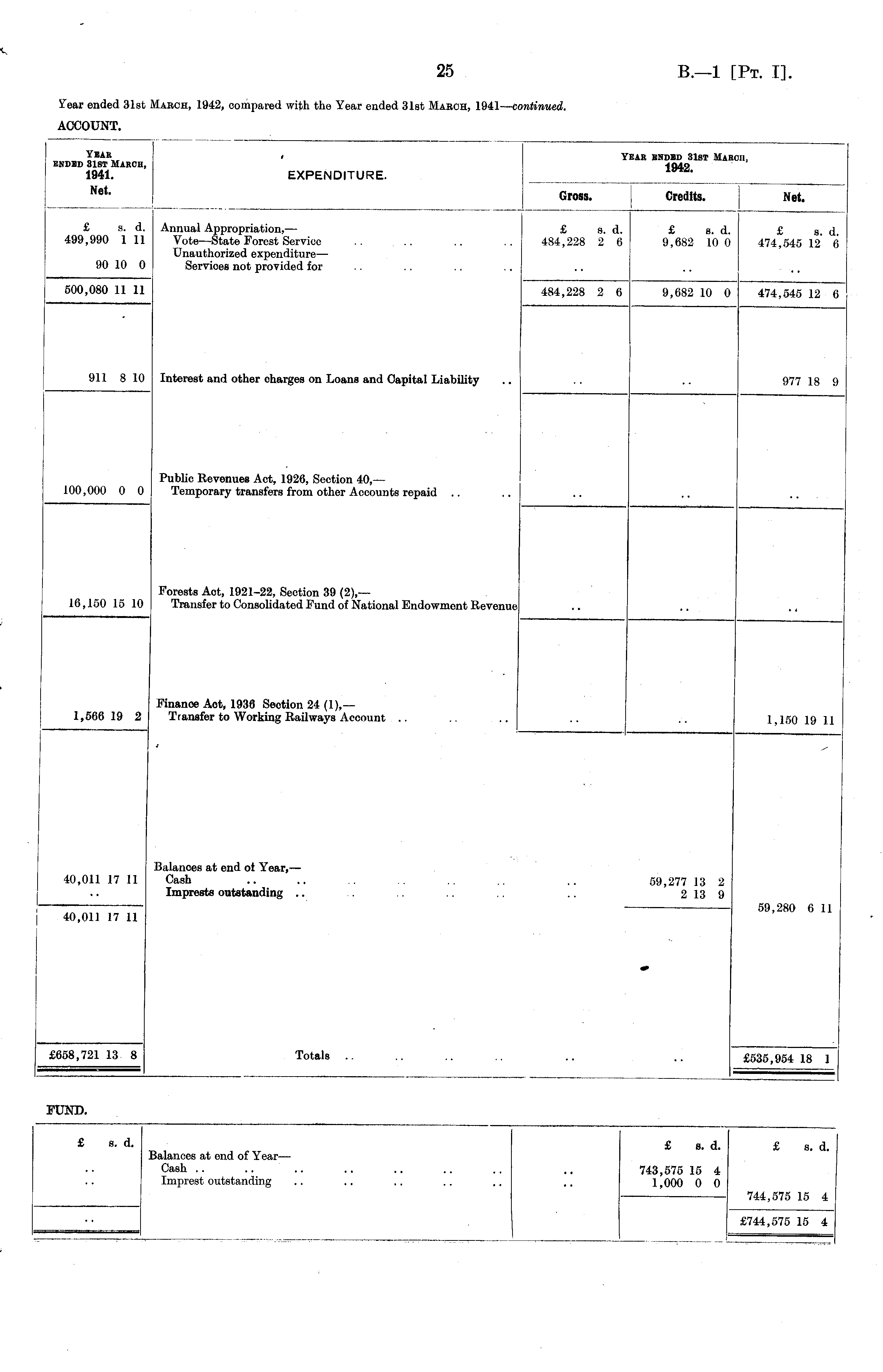 ACCOUNT. Year / Year endbi) 31st March, ended 31st March, 1949 1941. EXPENDITURE. Net " Gross. Credits. Net. £ s. d. Annual Appropriation,— £ s. d. £ s. d. £ s. d. 499,990 1 11 Vote —State Forest Service .. .. .. .. 484,228 2 6 9,682 10 0 474,543 12 6 Unauthorized expenditure— 90 10 0 Servioes not provided for 500,080 11 11 484,228 2 6 9,682 10 0 474,545 12 6 911 8 10 Interest and other charges on Loans and Capital Liability .. .. .. 977 18 9 Public Revenues Act, 1926, Section 40, — 100,000 0 0 Temporary transfers from other Accounts repaid Forests Aot, 1921-22, Section 39 (2), — 16,150 15 10 Transfer to Consolidated Fund of National Endowment Revenue Finanoe Aot, 1936 Section 24 (1), — 1,566 19 2 Transfer to Working Railways Account .. .. .. 1,150 19 11 ' / Balances at end oi Year, — 40,011 17 II Cash .. .. .. .. 59,277 13 2 Imprests outstanding .. .. 2 13 9 59,280 6 11 | 40,011 17 11 £658,721 13 8 Totals .. .. £535,954 18 1 FUND. £ s. d. £ s. d. £ s. d. Balances at end of Year— Cash .. .. .. .. .. .. .. .. 743,575 15 4 Imprest outstanding .. .. .. .. .. .. 1,000 0 0 744,575 15 4 •• £744,575 15 4