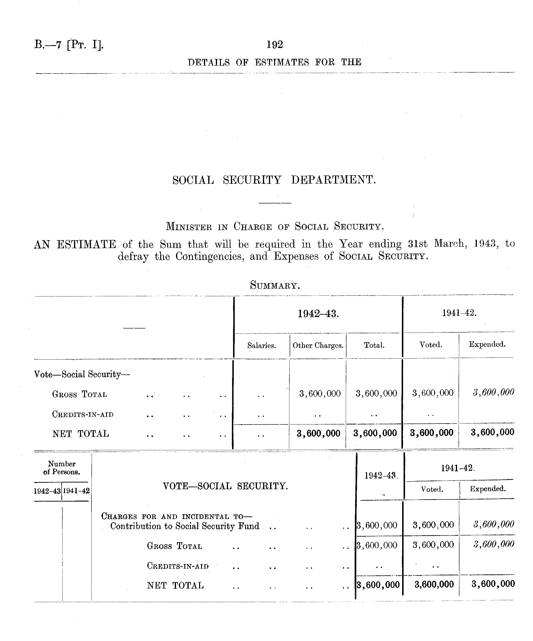 1942-43. 1941-42. Salaries. Other Charges. Total. Voted. Expended. Vote—Social Security — Gross Total . .■ .. .. .. 3,600,000 3,600,000 3,000,000 3,600,000 Crbdits-in-aid NET TOTAL .. .. .. .. 3,600,000 3,600,000 3,600,000 3,600,000 Number 1941-42 oi Persons. 1942-43 1942-431941-42 VOTE-SOCIAL SECURITY. Expended . Charges for and incidental to — Contribution to Social Security Fund .. .. ..3,600,000 3,600 ; 000 3,600,000 Gboss Total .. 3,600,000 3,600,000 3,600,000 Ckedits-in-ai d NET TOTAL 3,600,000 3,600,000 3,600,000
