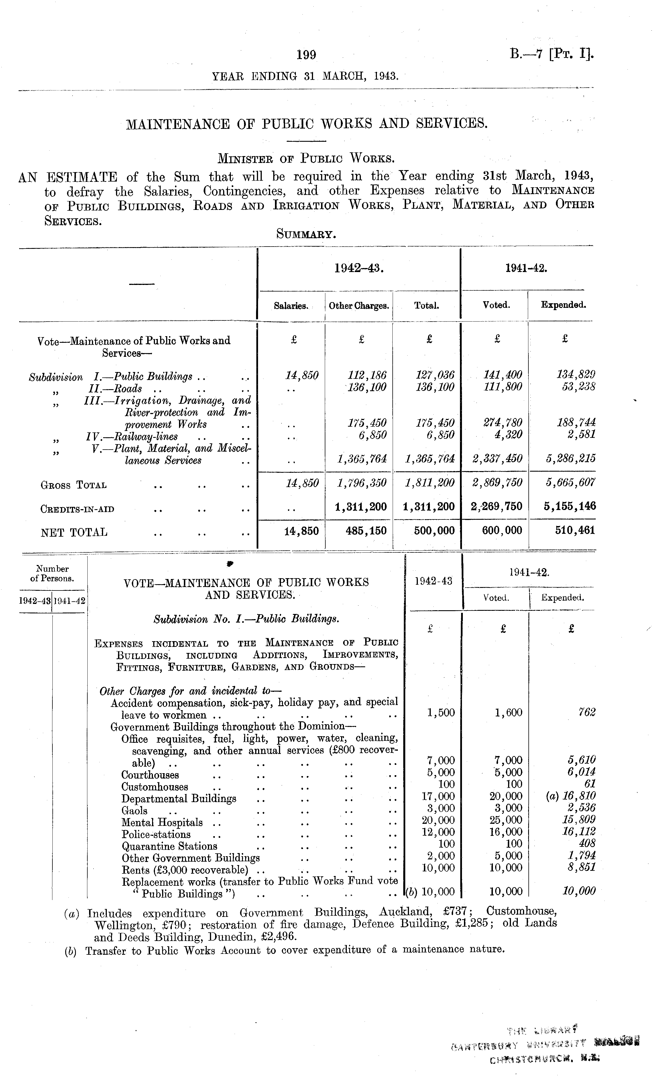 Minister of Public Works. AN ESTIMATE of the Sum that will be required in the Year ending 31st March, 1943, to defray the Salaries, Contingencies, and other Expenses relative to Maintenance of Public Buildings, Roads and Irrigation Works, Plant, Material, and Other Services. Summary.