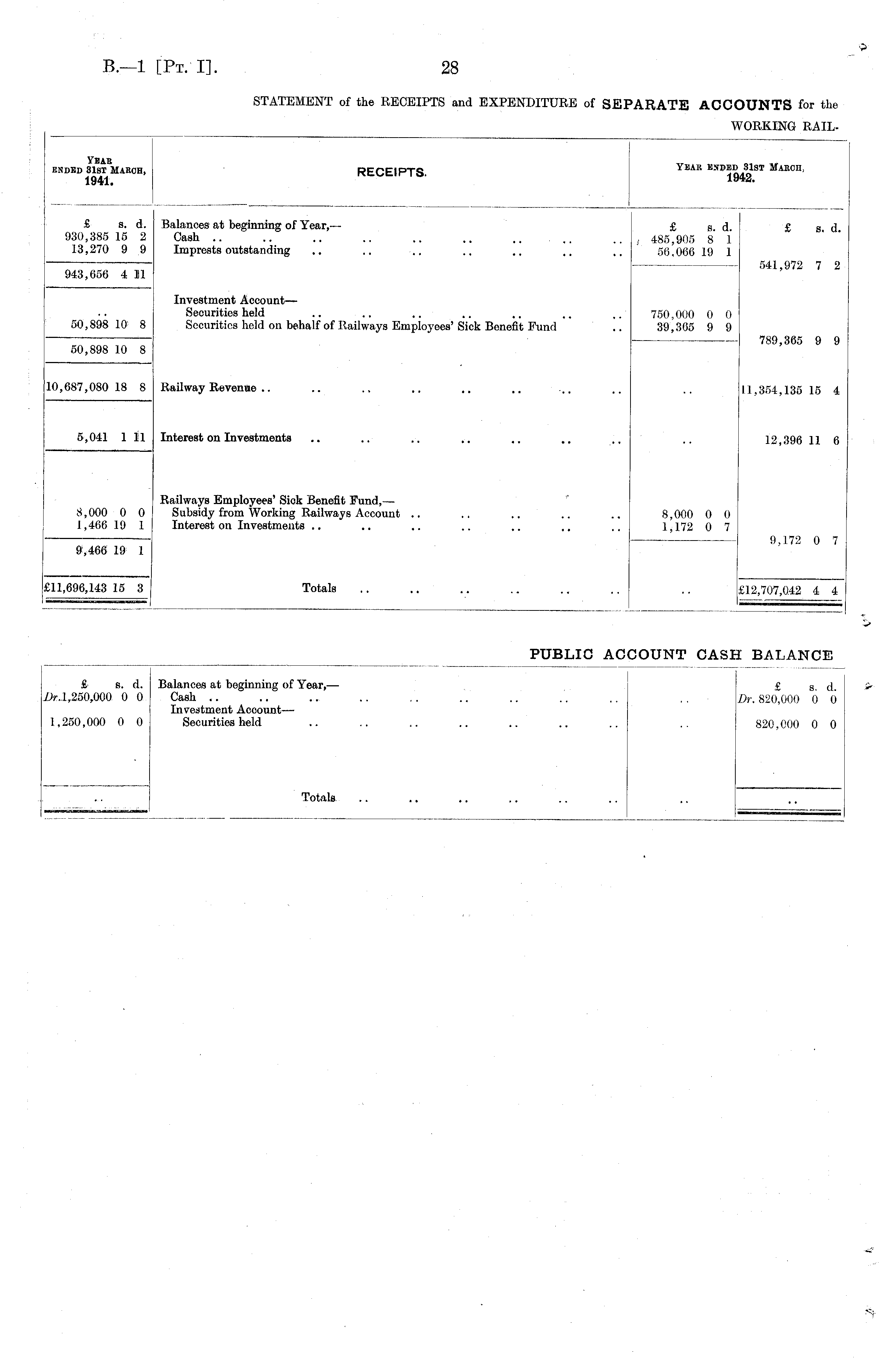 WORKING RAILended 31st march, REPEIPT*! Year ended 31st March, 1941. 1942. . £ s. d. Balances at beginning of Year, — £ B . d. £ s. d 930,385 15 2 Cash .. .. .. .. .. .. .. j 485,905 8 1 13,270 9 9 Imprests outstanding .. .. .. .. ,, 56,066 19 1 541,972 7 2 943,656 4 111 Investment Account— Securities held .. .. .. .. .. .. ,. 750,000 0 0 50,898 10 8 Securities held on behalf of Railways Employees'Sick Benefit Fund .. 39,365 9 9 - 789,365 9 9 50,898 10 8 10,687,080 18 8 Railway Revenue .. .. .. .. .. .. 11,354,135 15 4 5,041 1 11 Interest on Investments .. .. .. .. .. .. ,, .. 12,396 11 6 Railways Employees' Sick Benefit Fund,— 8,000 0 0 Subsidy from Working Railways Account .. .. .. .. .. 8,000 0 0 1,466 19 1 Interest on Investments .. .. .. .. .. .. 1,172 0 7 — 9,172 0 7 9,466 19 1 £11,696,143 15 3 Totals .. .. .. .. .. .. .. £12,707,042 4 4 ■W» PUBLIC ACCOUNT CASH BALANCE £ s. d. Balances at beginning of Year, — £ 8 . S* y>.l,250,000 0 0 Cash .. .. .. .. . . .. .. .. .. . . 820,000 0 0 Investment Account— 1,250,000 0 0 Securities held .. .. .. .. .. .. .. .. 820,000 0 0 Totals
