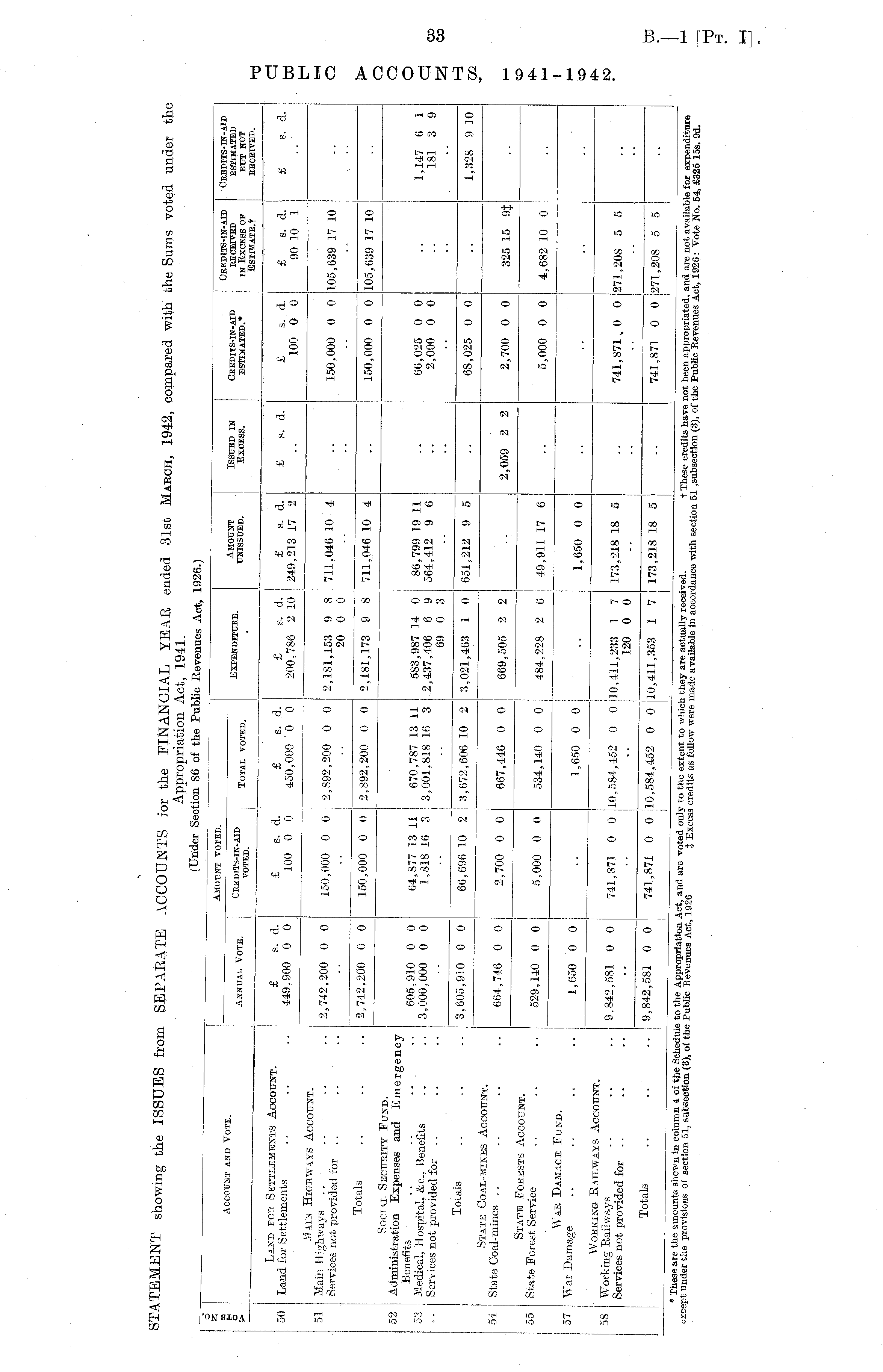 (Under Section 86 of the Public Revenues Act, 1926.) © I " : — : — i Amount voted. ~ ~ 2 Account av<vnr * T Credits-in-aid Credits-in-aid o I " . Crfdtts-tn- a tt» Expenditure. Amount Issued in Credits-in-aid received estimated > annual \ote. voted Total voted. < unissued. Excess. estimated.* in Excess op but not ___ * j ' Estimate.! received. Land fob Settlements Account. £sd t , j f a r a <■ 50 Ijand or Settlements _ 449,900 0 0 *100 0 0 450?000 0 "o 200 786 2 to 249,213 17 % * .. * 0 "o *«0 10 * * * * Main Highways Account. slrricS for " " " 2 ' 742 ' 200 0 0 150 ' 000 0 0 2,892,200 0 0 2,181,153 9 8 711,046 10 4 .. 150,000 0 0 105,639 17 10 T ° talS 2,742,200 0 0 150,000 0 0 2,892,200 0 0 2,181,173 9 8 711,046 10 4 ~ 150,000 0 0 105,639 17 10 Social Security Fund. 52 Administration Expenses and Emergency 58 :: 2 2 3.K«« 'S** 1 * > - « $s .. s 1 TotaIS 3,605,910 0 0 66,696 10 2 3,672,606 10 2 1,021,463 1 0 651,212 9 5 ~ 68,025 0 0 T 1,328 9 10 State Coal-mines Account. ~ State Coal mines .. .. .. .. 664,746 0 0 2/700 0 0 667,446 0 0 669,505 2 2 .. 2,059 2 2 2,700 0 0 325 15 9{ State Forests Account. " 55 State Forest Service 529 ,i 40 p 0 5;00Q 0 0 0 Q 484>228 2 g g Q 0 Q I War Damage Fund. 57 War Damage .... 1 fisn a a , 6 0 0 .. I,6o0 0 0 .. 1,650 0 0 Wobking Railways Account. 1 Services' notpTovklcd for !! !! !! 9 ' 842 ' 58 * 0 0 741 > 871 0 0 10,584,452 0 0 10,411,233 1 7 173,218 18 5 .. 741,871 , 0 0 271,208 5 5 120 0 0 T ° tals '• "• 9,842,581 0 0 ! 741,871 0 0 10,584,452 0 0 10,411,353 1 7 i 173,218 18 5 .. 741,871 0 0 271,208 5 5 ~ " except under the provisions oi section 51, subsection (3), of the Public Revenues Act,'l926 and credits as'fbllow were' recel y ed - ... + credits haTe not been appropriated, and are not available for expenditure ' 5 Jixoess cremts as toUow were made available m accordance with section 51 .subsection (3), of the Public Revenues Act, 1920: Vote No. 54, £325 15s. 9d.