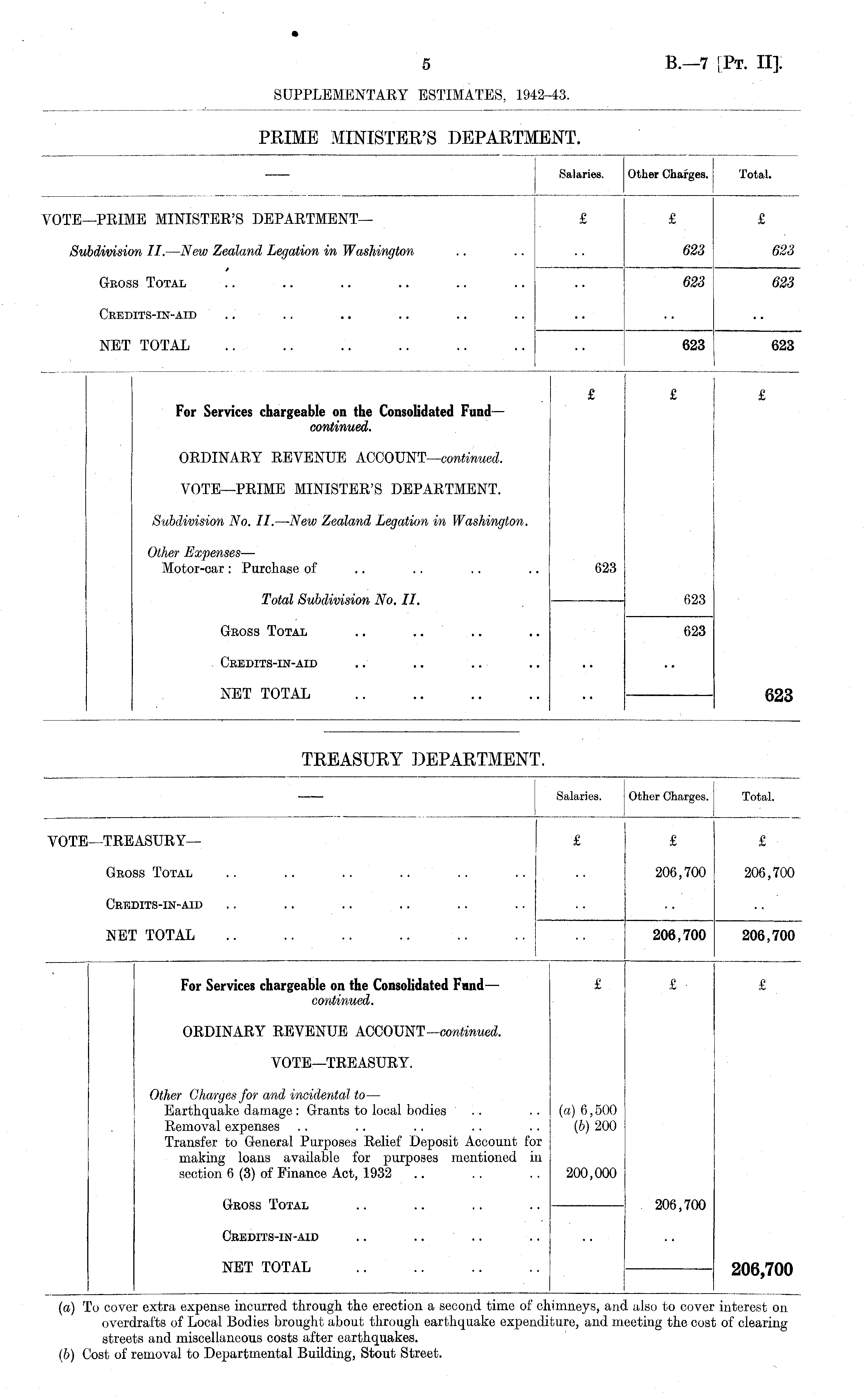 [ Salaries. Other Charges. Total. _____ 1 ; VOTE—TREASURY— £ £ £ GROSS Total .. .. .. .. .. .. .. 206,700 206,700 Credits-in-aid NET TOTAL .. .. .. 206,700 206,700 For Services chargeable on the Consolidated Fiind — £ £ £ continued. ORDINARY REVENUE ACCOUNT —continued. VOTE—TREASURY. Other Charges for and incidental to — Earthquake damage : Grants to local bodies .. . . (a) 6,500 Removal expenses .. .. .. .. .. (b) 200 Transfer to General Purposes Relief Deposit Account for making loans available for purposes mentioned in section 6 (3) of Finance Act, 1932 .. .. .. 200,000 Gross Total .. .. .. .. 206,700 Credits-in-aid NET TOTAL 206,700 (a) To cover extra expense incurred through the erection a second time of chimneys, and also to cover interest on overdrafts of Local Bodies brought about through earthquake expenditure, and meeting the cost of clearing streets and miscellaneous costs after earthquakes. (b) Cost of removal to Departmental Building, Stout Street.