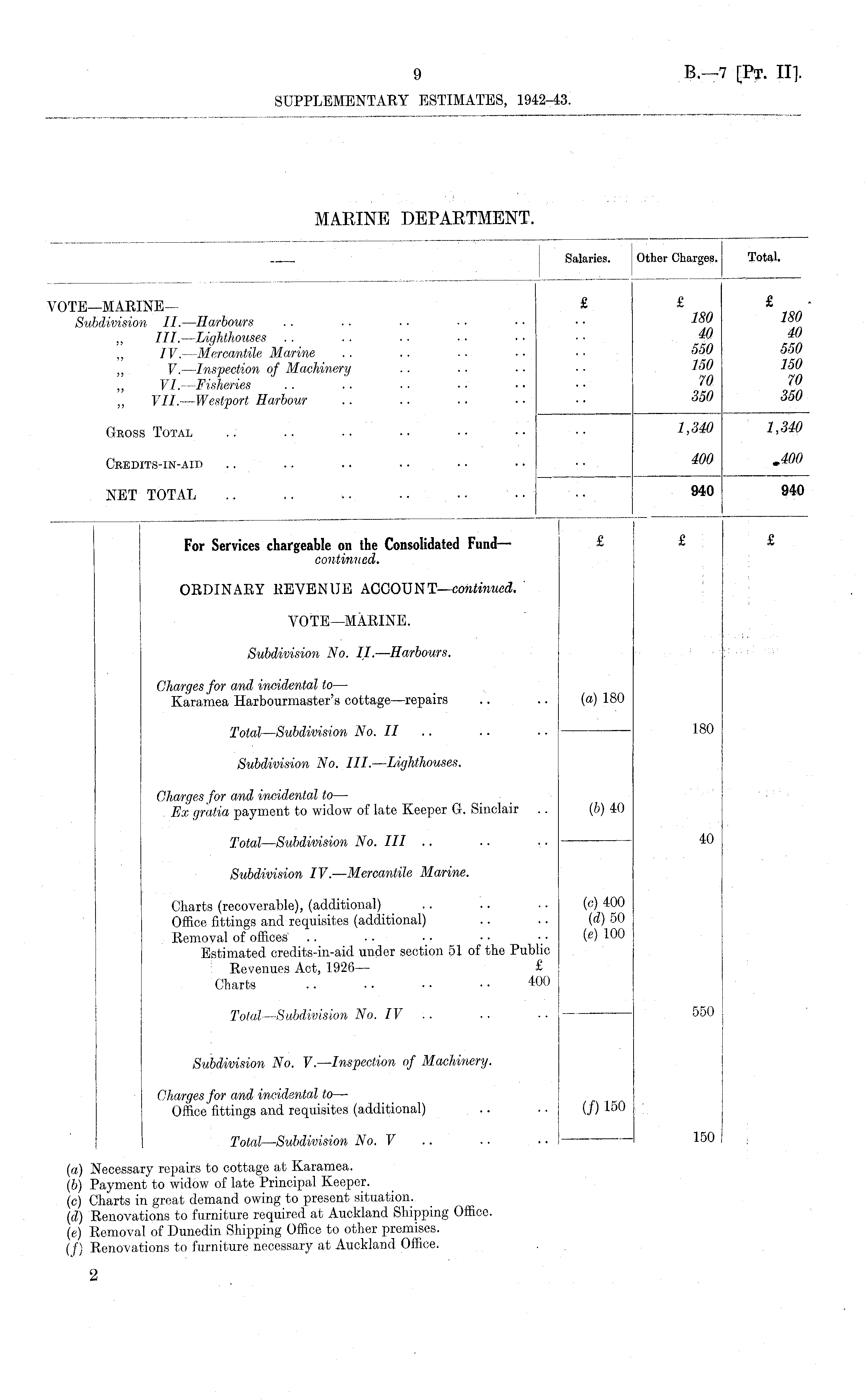 Salaries. j Other Charges. Total. VOTE—MARINE— £ £ £ Subdivision II. —Harbours .. .. • • • • • • • • III.-Lighthouses .. .. .. ■■ ■■ ■■ 40 40 „ IV. —Mercantile Marine .. .. .. .. • • &&Q 550 „ V. —Inspection of Machinery .. .. • • • • 150 150 „ VI. —Fisheries . . . . • • • • • • • • TO ,, VII. -Westport Harbour .. .. • ■ • • • • 350 350 GKOSS TOTAL .. .. .. •• •• •• 1,340 1,340 CBEDITS-IN-AID .. .. .. • • • • • • ■ ■ 400 „400 NET TOTAL .. .. .. .. •• •• 840 940 i For Services chargeable on the Consolidated Fund — £ £ £ continued. ORDINARY REVENUE ACCOUNT—continued. VOTE—MARINE. Subdivision No. II. —Harbours. Charges for and incidental to — Karamea Harbourmaster's cottage —repairs .. .. (a) 180 Total —Subdivision No. II ■ ■ ■ ■ 180 Subdivision No. III. —Lighthouses. Charges for and incidental to — Ex gratia payment to widow of late Keeper G. Sinclair .. (b) 40 Total—Subdivision No. Ill .. ■ ■ ■ ■ 40 Subdivision IV. —Mercantile Marine. Charts (recoverable), (additional) . . .. • • (c) 400 Office fittings and requisites (additional) .. .. (d) 50 Removal of offices .. •• •• (e) 100 Estimated credits-in-aid under section 51 of the Public Revenues Act, 1926 — £ Charts .. .. • • • • 400 Total —Subdivision No. IV • • • • 550 Subdivision No. V. —Inspection of Machinery. Charges for and incidental to — Office fittings and requisites (additional) ■ • ■ ■ (j) 150 Total —Subdivision No. V .. ■ ■ • • 150 (a) Necessary repairs to cottage at Karamea. (b) Payment to widow of late Principal Keeper. (c) Charts in great demand owing to present situation. (d) Renovations to furniture required at Auckland Shipping Office. (e) Removal of Dunedin Shipping Office to other premises. (f) Renovations to furniture necessary at Auckland Office.