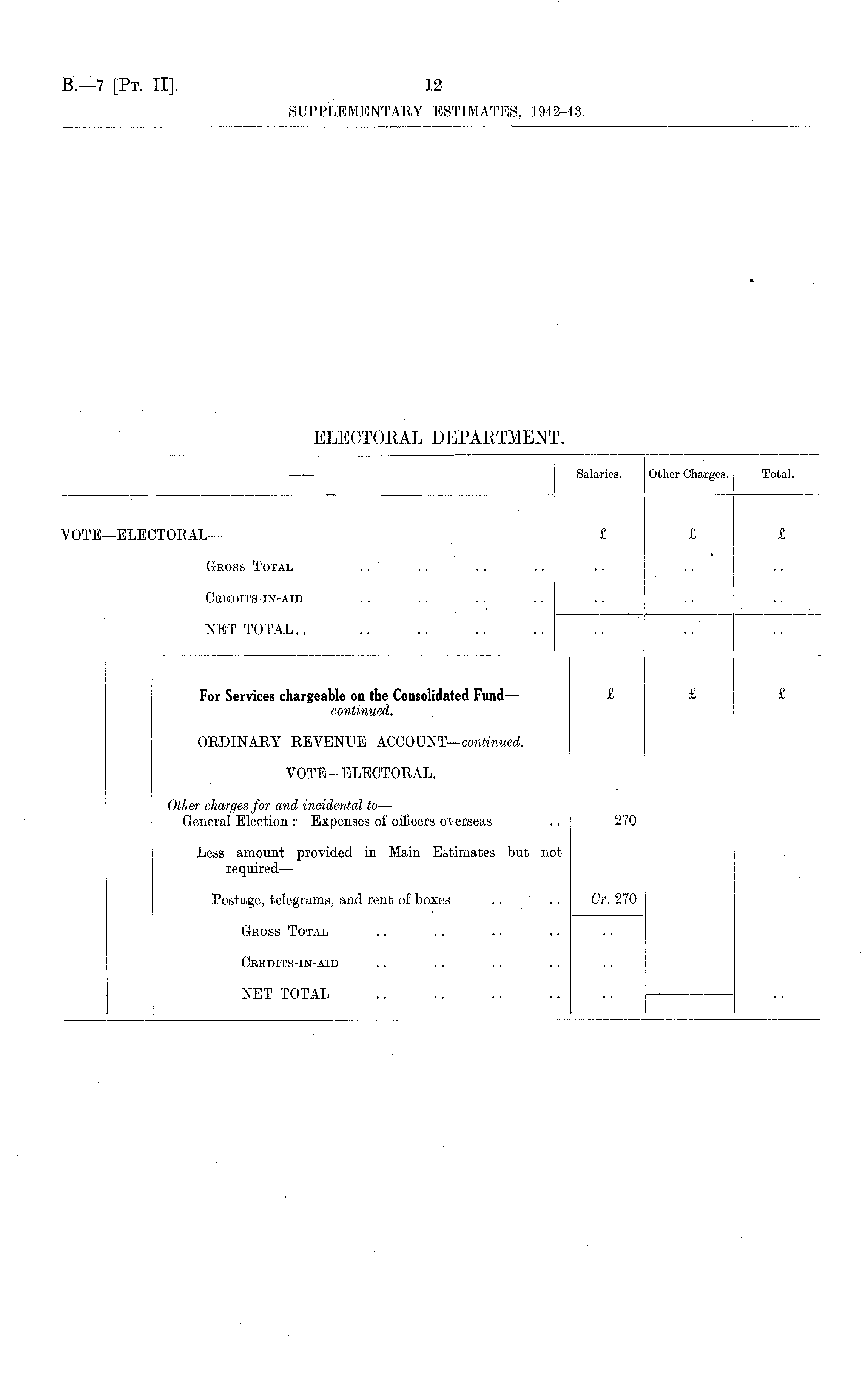 • Salaries. Other Charges. Total. VOTE—ELECTORAL— £ £ £ Gross Total Credits-in-aid NET TOTAL.. For Services chargeable on the Consolidated Fund — £ £ £ continued. ORDINARY REVENUE ACCOUNT—continued. VOTE—ELECTORAL. Other charges for and incidental to — General Election : Expenses of officers overseas .. 270 Less amount provided in Main Estimates but not required— Postage, telegrams, and rent of boxes .. .. Cr. 270 Gross Total Credits-in-aid NET TOTAL .. .. .. .. .. — —