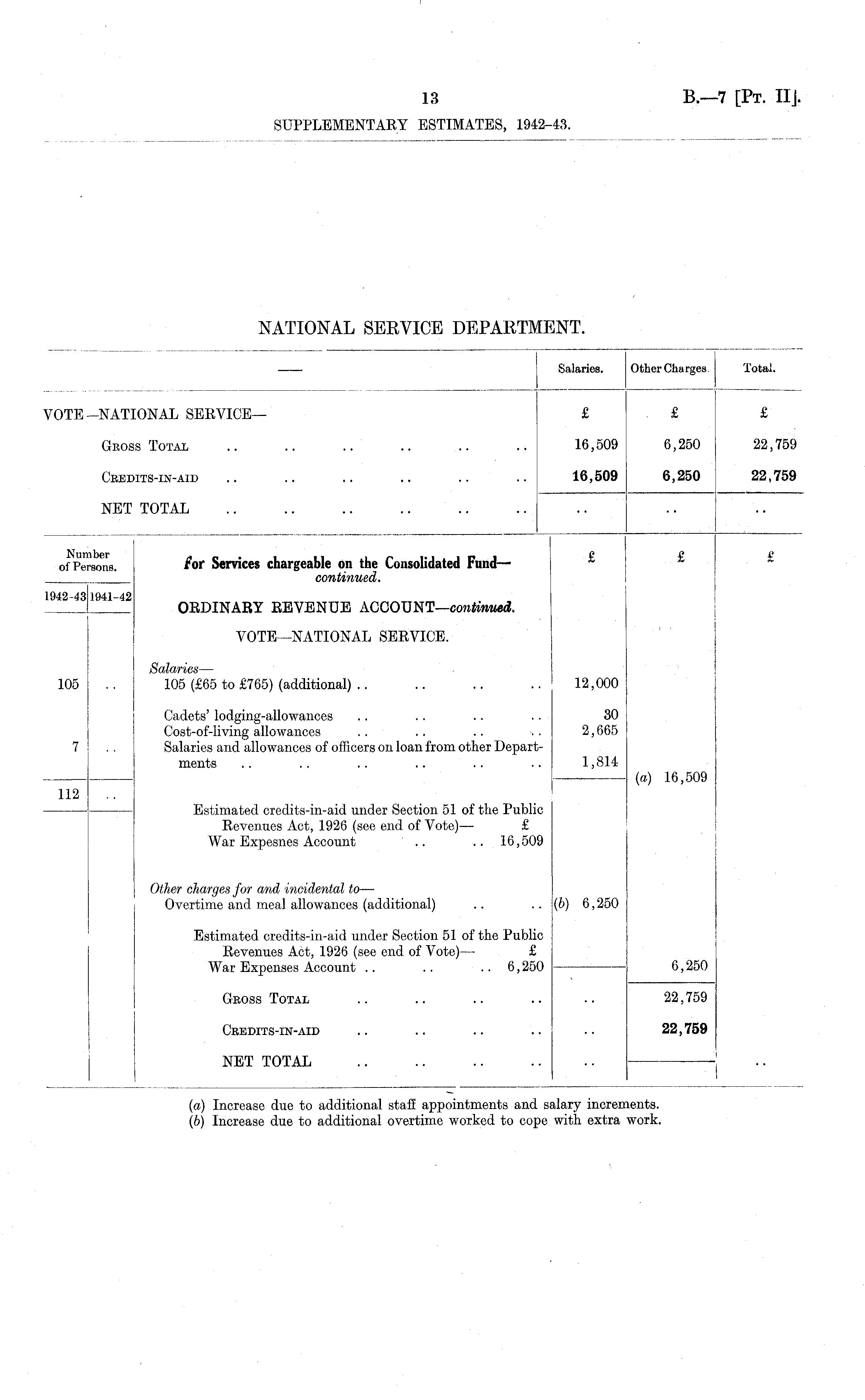 Salaries. Other Cha rges Total. VOTE-NATIONAL SERVICE— £ £ £ GROSS TOTAL .. .. .. .. .. .. 16,509 6,250 22,759 CREDITS-IN-aid .. .. .. .. .. .. 16,509 6,250 22,759 NET TOTAL ofPersoM. for Services chargeable on the Consolidated Fund — continued. 1942-43 1941-42 ORDINARY REVENUE ACCOUNT—continued. \ VOTE—NATIONAL SERVICE. 8 alanes 105 .. 105 (£65 to £765) (additional) .. .. .. .. 12,000 Cadets' lodging-allowances .. .. .. .. 30 Cost-of-living allowances . . . . .. . . 2,665 7 . . Salaries and allowances of officers on loan from other Departments .. .. .. .. .. .. 1,814 — (a) 16,509 112 Estimated credits-in-aid under Section 51 of the Public Revenues Act, 1926 (see end of Vote) — £ War Expesnes Account .. .. 16,509 Other charges for and incidental to — Overtime and meal allowances (additional) .. .. (b) 6,250 Estimated credits-in-aid under Section 51 of the Public Revenues Act, 1926 (see end of Vote) — £ War Expenses Account .. .. .. 6,250 —— 6,250 GROSS Total .. .. .. .. .. 22,759 Credits-in-aid .. .. .. .. 22,759 NET TOTAL —j (a) Increase due to additional stafl appointments and salary increments. (b) Increase due to additional overtime worked to cope with extra work.