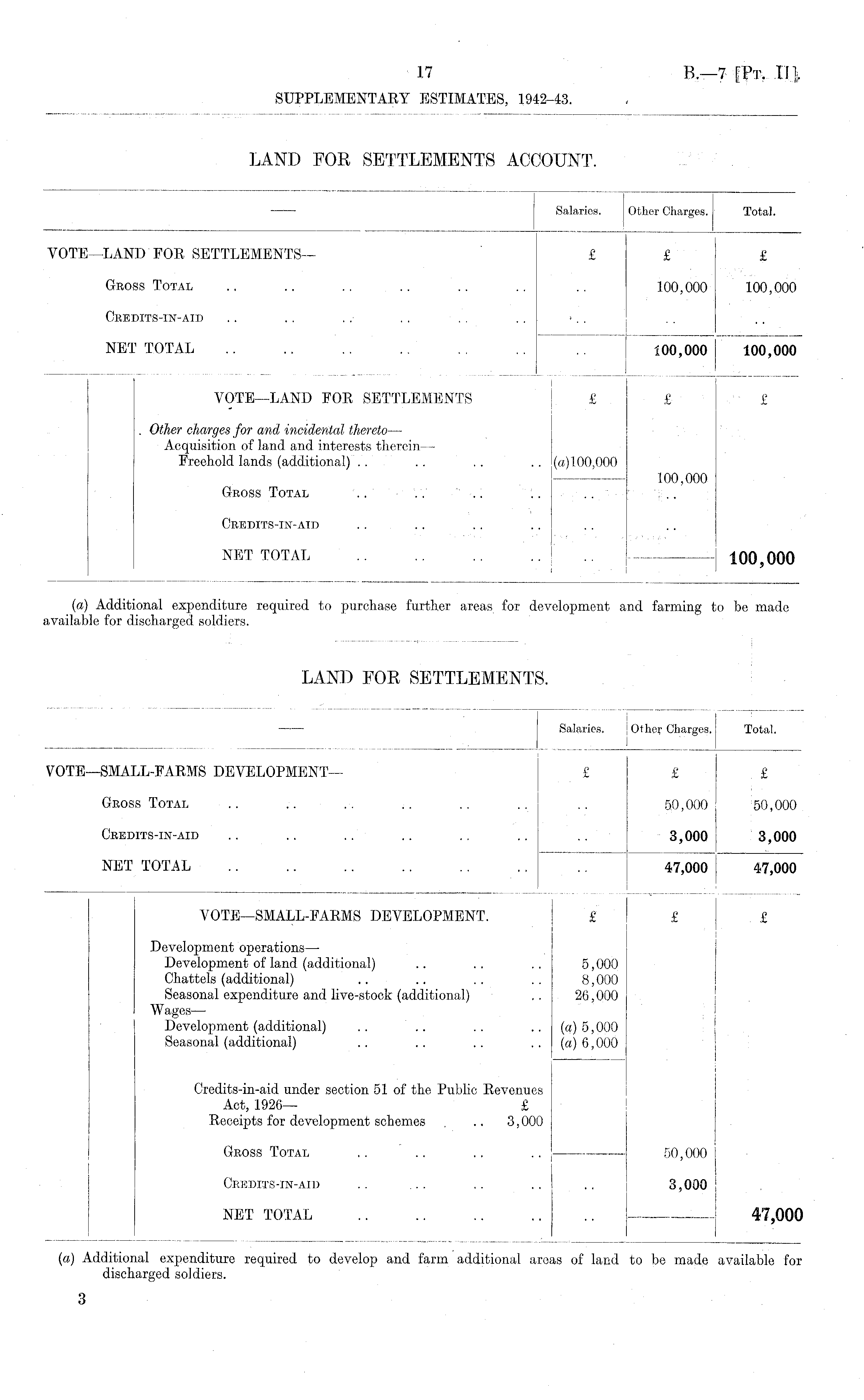 Salaries. 1 Other Charges. I Total. VOTE—SMALL-FARMS DEVELOPMENT— £ £ £ Gross Total .. .. .. .. .. .. .. 5.0,000 50,000 Credits-in-aid .. .. .. .. .. 3,000 3,000 NET TOTAL .. 47,000 47,000 VOTE—SMALL-EARMS DEVELOPMENT. £ £ £ Development operations — Development of land (additional) .. .. .. 5,000 Chattels (additional) .. .. .. .. 8,000 Seasonal expenditure and live-stock (additional) .. 26,000 Wages — ) Development (additional) .. .. .. .. (a) 5,000 Seasonal (additional) .. .. .. (a) 6,000 I Credits-in-aid under section 51 of the Public Revenues Act, 1926— £ Receipts for development schemes .. .3,000 j GROSS Total .. .. .. .. 50,000 Credits-in-aid .. .. .. .. .. 3,000 NET TOTAL .. .. 47,000 (a) Additional expenditure required to develop and farm additional areas of land to be made available for discharged soldiers.