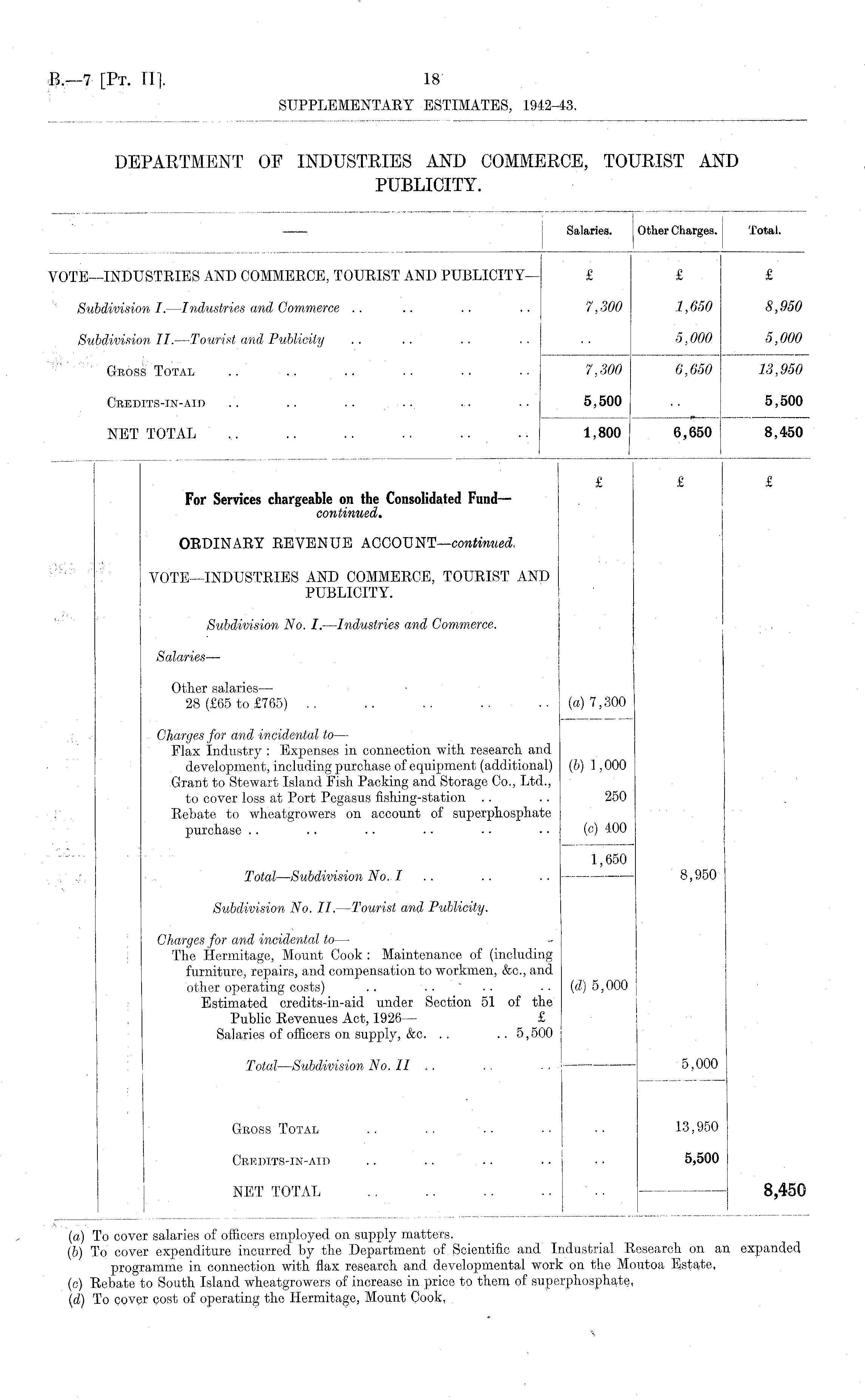 ; Salaries. Other Charges. | Total. VOTE—INDUSTRIES AND COMMERCE, TOURIST AND PUBLICITY— £ £ £ Subdivision I. —Industries and Commerce .. .. .. .. 7,300 1,650 8,950 Subdivision II. —Tourist and Publicity .. .. .. .. .. 5,000 5,000 Gross Total .. .. .. .. .. .. 7,300 6,650 13,950 Credits-in-aio 5,500 I 5,500 NET TOTAL . . .. .. 1,800 6,650 8,450 £ £ £ For Services chargeable on the Consolidated Fund — continued. ORDINARY REVENUE ACCOUNT —continued. VOTE—INDUSTRIES AND COMMERCE, TOURIST AND PUBLICITY. Subdivision No. I. --Industries and Commerce. Salaries — Other salaries — 28 (£65 to £765) .. .. .. .. .. (a) 7,300 Charges for and incidental to — Flax Industry : Expenses in connection with research and development, including purchase of equipment (additional) (b) 1,000 Grant to Stewart Island Fish Packing and Storage Co., Ltd., to cover loss at Port Pegasus fishing-station . . .. 250 Rebate to wheatgrowers on account of superphosphate purchase .. .. .. .. .. • • (c) 400 1,650 Total—Subdivision No. I .. .. .. 8,950 Subdivision No. II.—Tourist and Publicity. Charges for and incidental to —■ The Hermitage, Mount Cook : Maintenance of (including furniture, repairs, and compensation to workmen, &c., and other operating costs) .. .. ' .. ..(d) 5,000 Estimated credits-in-aid under Section 51 of the Public Revenues Act, 1926 — £ Salaries of officers on supply, &c. .. .. 5,500 Total —Subdivision No. II .. .. .. 5,000 Gross Total .. .. .. •• 13,950 Credits-in-aid .. .. .. .. ■ ■ 5,500 NET TOTAL .. .. .. .. ' .. 8,450 (а) To cover salaries of officers employed on supply matters. (б) To cover expenditure incurred by the Department of Scientific and Industrial Research on an expanded programme in connection with flax research and developmental work on the Moutoa Estate, (c) Rebate to South Island wheatgrowers of increase in price to them of superphosphate, (d) To cover cost of operating the Hermitage, Mount Cook,