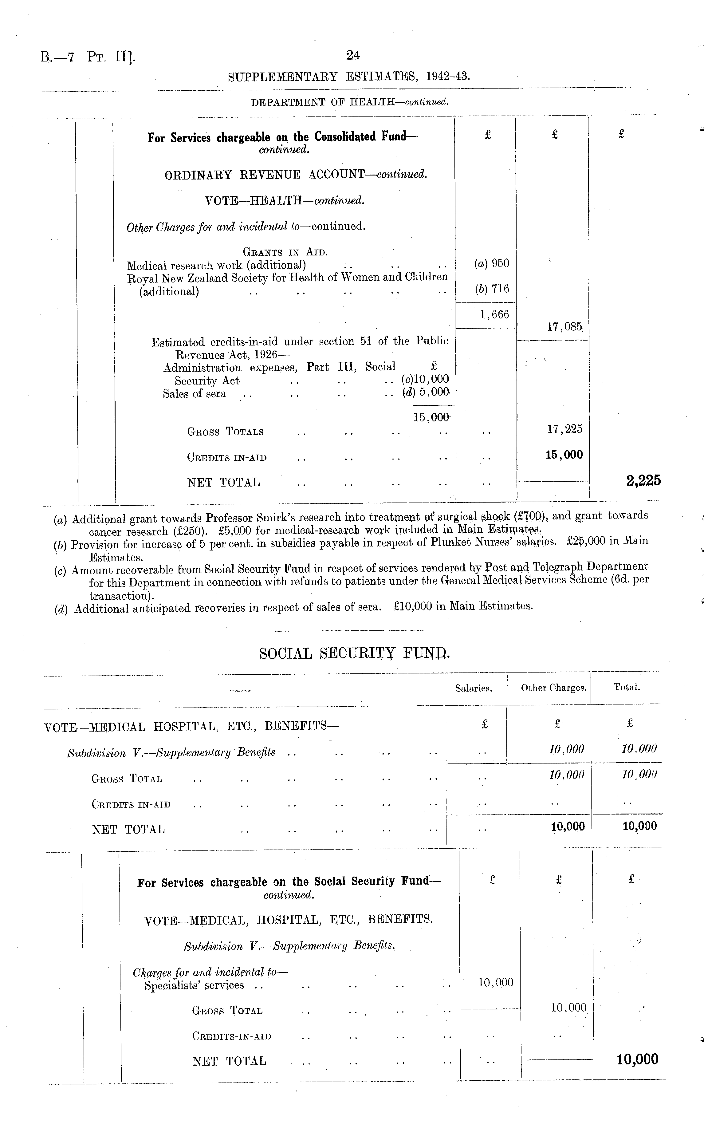 Salaries. j Other Charges. Total. VOTE—MEDICAL HOSPITAL, ETC., BENEFITS— £ £ £ Subdivision V. —Supplementary Benefits .. .. ■ ■ • • ■ ■ 10, 000 10 > 000 Gross Total 1 10,000 W,000 CREDITS IN-AID .. .. .. . • • • • • NET TOTAL .. .. 10,000 10,000 For Services chargeable on the Social Security Fund — £ £ £ continued. VOTE—MEDICAL, HOSPITAL, ETC., BENEFITS. Subdivision V. —Supplementary Benefits. Charges for and incidental to — Specialists'services .. .. •• •• 10,000 GROSS Total .. .. .. •• ! 10.000 Credits-IN-AID . . . . • • • • j NET TOTAL .. .. .. •• 10,000 _ J