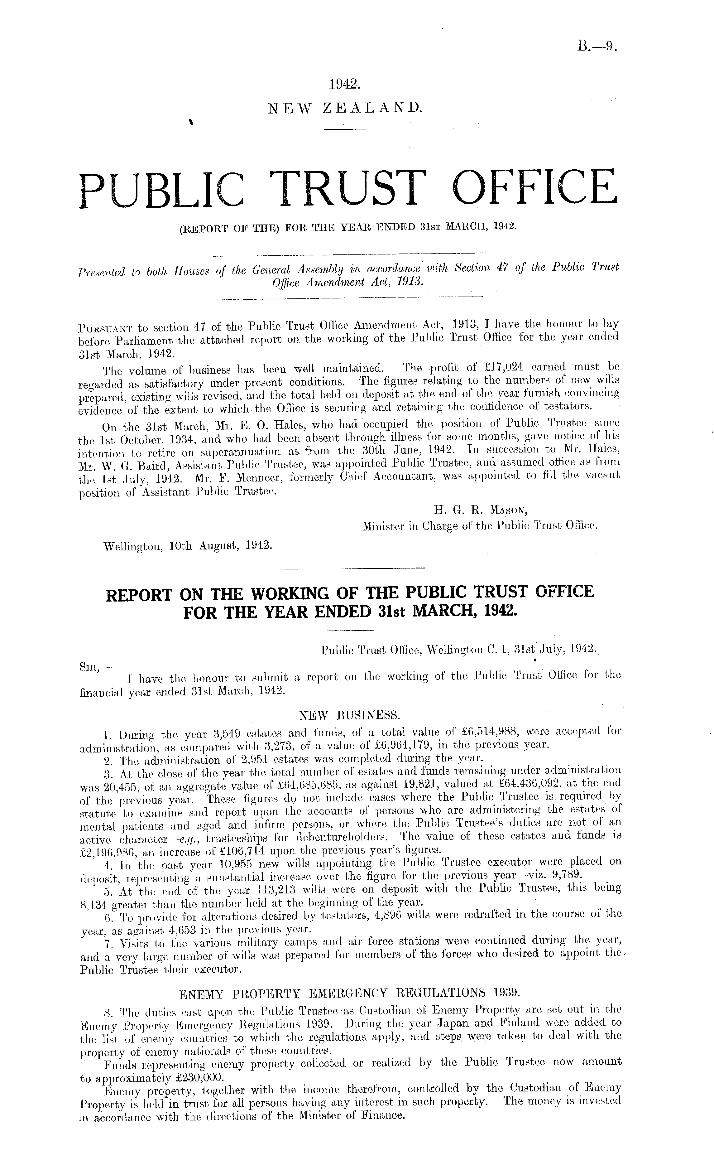 Pursuant to section 47 of the Public Trust Office Amendment Act, 1913, I have the honour to lay before Parliament the attached report on the working of the Public Trust Office for the year ended 31st March, 1942. The volume of business has been well maintained. The profit of £17,024 earned must be regarded as satisfactory under present conditions. The figures relating to the numbers of new wills prepared, existing wills revised, and the total held on deposit at the end of the year furnish convincing evidence'of the extent to which the Office is securing and retaining the confidence of testators. On the 31st March, Mr. E. 0. Hales, who had occupied the position of Public Trustee since the Ist October, 1934, and who had been absent through illness for some months, gave notice of his intention to retire on superannuation as from the 30th June, .1942. In succession to Mr. Hales, Mr. W. G. Baird, Assistant Public Trustee, was appointed Public Trustee, and assumed office as from the Ist July, 1942. Mr. F. Menneer, formerly Chief Accountant, was appointed to fill the vacant position of Assistant Public Trustee. H. G, R. Mason, Minister in Charge of the Public Trust Office. Wellington., 10th August, 1942.