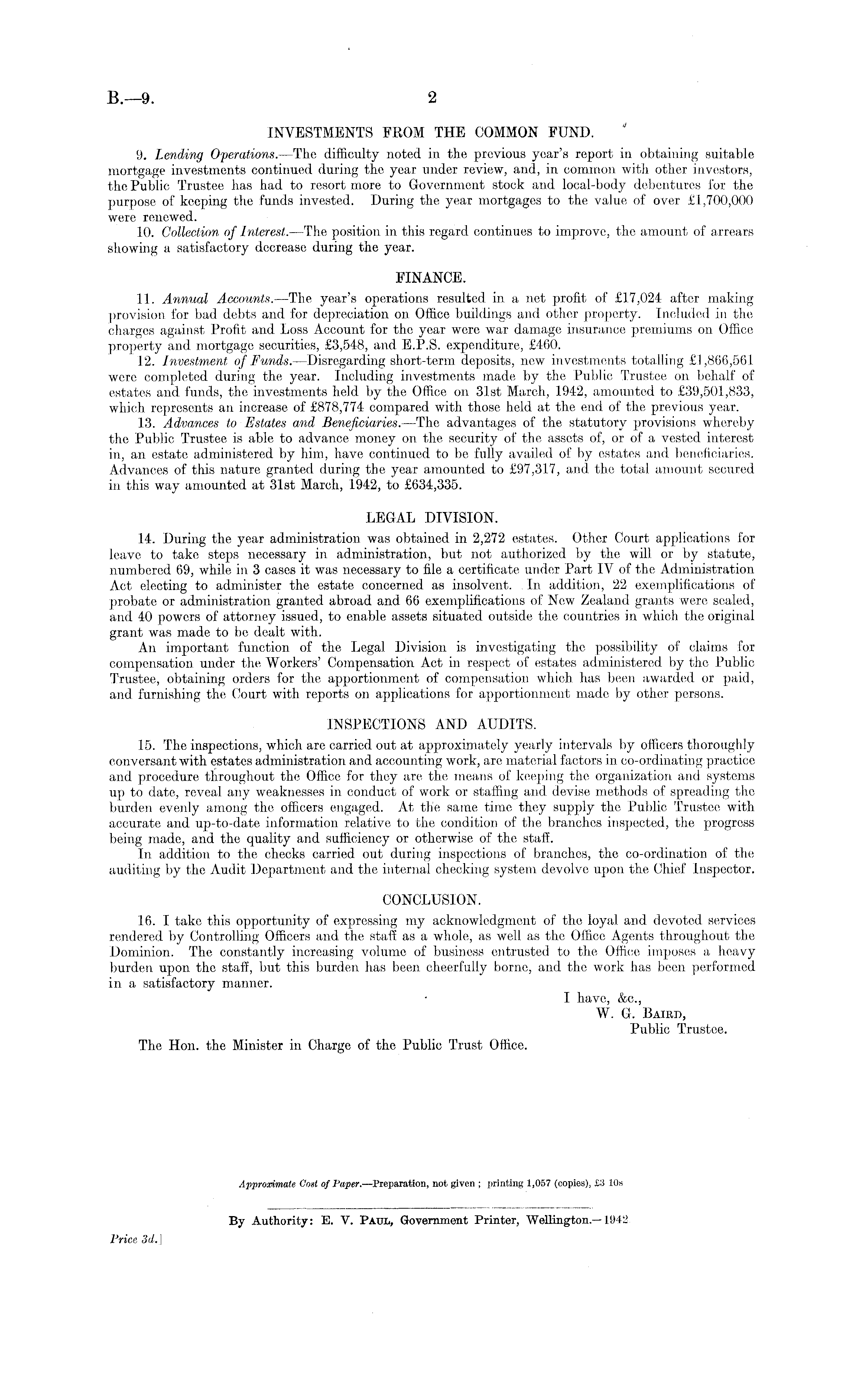 INVESTMENTS FROM THE COMMON FUND. ' 9. Lending Operations. —The difficulty noted in the previous year's report in obtaining suitable mortgage investments continued during the year under review, and, in common with other investors, the Public Trustee has had to resort more to Government stock and local-body debentures for the purpose of keeping the funds invested. During the year mortgages to the value of over £1,700,000 were renewed. 10. Collection of Interest. —The position in this regard continues to improve, the amount of arrears showing a satisfactory decrease during the year. FINANCE. 11. Annual Accounts. —The year's operations resulted in a net profit of £17,024 after making provision for bad debts and for depreciation on Office buildings and other property. Included in the charges against Profit and Loss Account for the year were war damage insurance premiums on Office property and mortgage securities, £3,54-8, and E.P.S. expenditure, £460. 12. Investment of Funds.—Disregarding short-term deposits, new investments totalling £1,866,561 were completed during the year. Including investments made by the Public Trustee on behalf of estates and funds, the investments held by the Office on 31st March, 1942, amounted to £39,501,833, which represents an increase of £878,774 compared with those held at the end of the previous year. 13. Advances to Estates and Beneficiaries. —The advantages of the statutory provisions whereby the Public Trustee is able to advance money on the security of the assets of, or of a vested interest in, an estate administered by him, have continued to be fully availed of by estates and beneficiaries. Advances of this nature granted during the year amounted to £97,317, and the total amount secured in this way amounted at 31st March, 1942, to £634,335. LEGAL DIVISION. 14. During the year administration was obtained in 2,272 estates. Other Court applications for leave to take steps necessary in administration, but not authorized by the will or by statute, numbered 69, while in 3 cases it was necessary to file a certificate under Part IV of the Administration Act electing to administer the estate concerned as insolvent. \ln addition, 22 exemplifications of probate or administration granted abroad and 66 exemplifications of New Zealand grants were sealed, and 40 powers of attorney issued, to enable assets situated outside the countries in which the original grant was made to be dealt with. An important function of the Legal Division is investigating the possibility of claims for compensation under the Workers' Compensation Act in respect of estates administered by the Public Trustee, obtaining orders for the apportionment of compensation which has been awarded or paid, and furnishing the Court with reports on applications for apportionment made by other persons. INSPECTIONS AND AUDITS. 15. The inspections, which are carried out at approximately yearly intervals by officers thoroughly conversant with estates administration and accounting work, are material factors in co-ordinating practice and procedure throughout the Office for they are the means of keeping the organization and systems up to date, reveal any weaknesses in conduct of work or staffing and devise methods of spreading the burden evenly among the officers engaged. At the same time they supply the Public Trustee with accurate and up-to-date information relative to the condition of the branches inspected, the progress being made, and the quality and sufficiency or otherwise of the staff. In addition to the checks carried out during inspections of branches, the co-ordination of the auditing by the Audit Department and the internal checking system devolve upon the Chief Inspector. CONCLUSION. 16. I take this opportunity of expressing my acknowledgment of the loyal and devoted services rendered by Controlling Officers and the staff as a whole, as well as the Office Agents throughout the Dominion. The constantly increasing volume of business entrusted to the Office imposes a heavy burden upon the staff, but this burden has been cheerfully borne, and the work has been performed in a satisfactory manner. I have, &c., W. G. Baird, Public Trustee. The Hon. the Minister in Charge of the Public Trust Office.