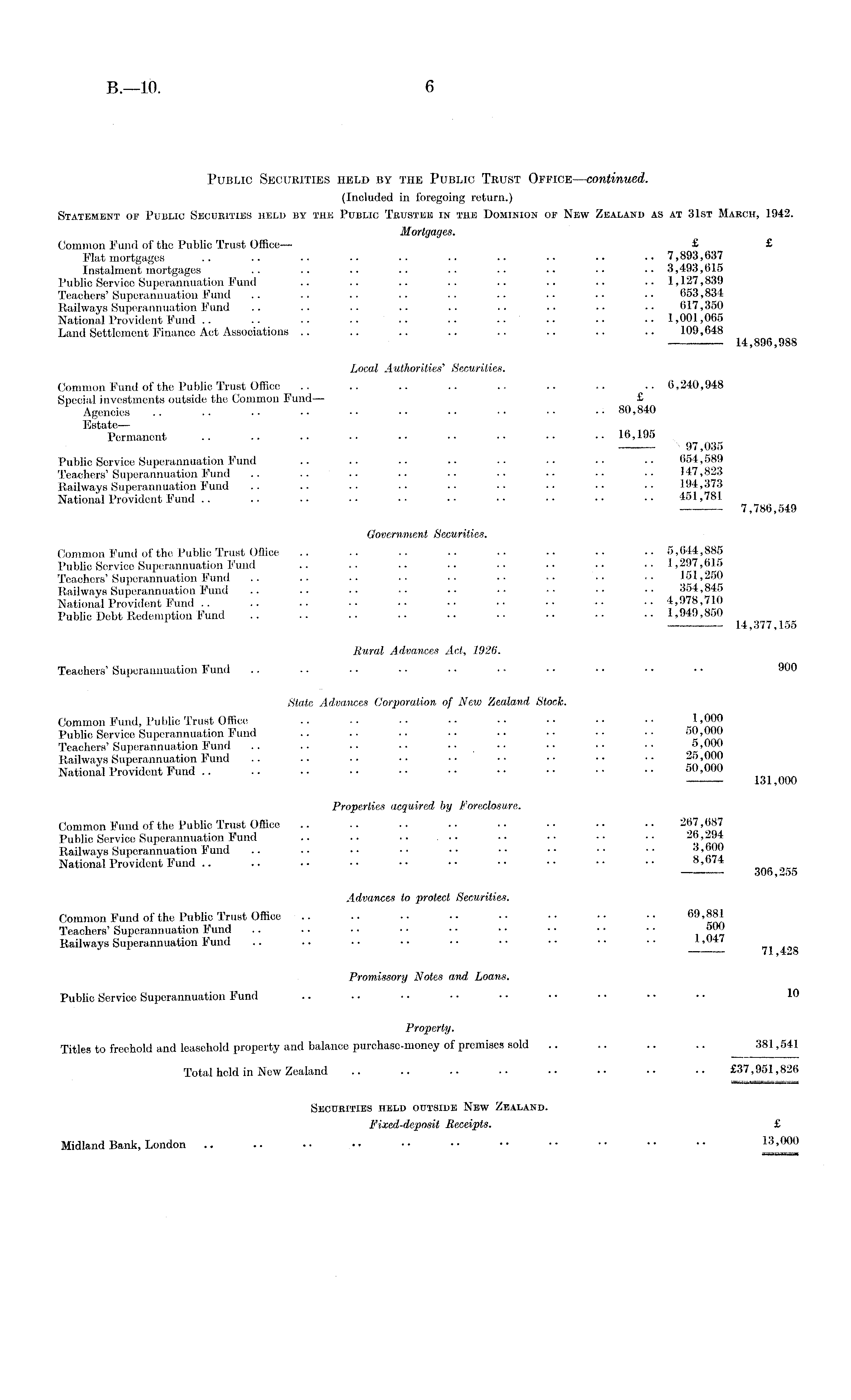 Public Securities held by the Public Trust Office—continued. (Included in foregoing return.) Statement of Pdblic Securities held by the Public Trustee in the Dominion of New Zealand as at 31st March, 1942. Mortgages. Common Fund of the Public Trust Office — £ £ Flat mortgages .. .. .. . • ■ • • ■ • • • • • • 7,893,637 Instalment mortgages .. .. .. .. .. •• •• •• •• 3,493,615 Public Service Superannuation Fund .. .. .. .. .. .. • • .. 1,127,839 Teachers' Superannuation Fund .. .. .. .. .. .. .. •• •• 653,834 Railways Superannuation Fund .. .. .. .. .. .. •• •• •• 617,350 National Provident Fund .. .. .. .. .. . • • ■ • • • • .. 1,001,065 Land Settlement Finance Act Associations .. .. .. .. .. .. .. .. 109,648 14,896,988 Local Authorities' Securities. Common Fund of the Public Trust Office .. .. .. .. .. .. .. .. 6,240,948 Special investments outside the Common Fund— £ Agencies .. .. .. • • • • • • • • ■ • • • .. 80,840 Estate — Permanent .. .. •• •• •• •• •• •• 16,195 97,035 Public Service Superannuation Fund .. .. .. .. .. •• •• •• 654,589 Teachers' Superannuation Fund .. .. .. .. •• •• 147,82.5 Railways Superannuation Fund .. .. •• •• •• •• •• •• •• 194,373 National Provident Fund .. .. .. •• •• •• •• •• •• •• 451,781 7,786,549 Government Securities. Common Fund of the Public Trust Office .. .. .. •• •• •• •• •• 5,644,885 Public Service Superannuation Fund .. .. • • • • • • • • • • .. 1,297,615 Teachers' Superannuation Fund .. .. •• •• •• •• •• 151,250 Railways Superannuation Fund .. .. •• •• •• •• •• •• 354,845 National Provident Fund .. .. •• •• •• •• •• •• •• 4,978,710 Public Debt Redemption Fund .. .. .. •• •• •• •• •• •• 1,949,850 14,377,155 Rural Advances Act, 1926. Teachers' Superannuation Fund .. .. • ■ • • • • • • • • • • • • • • 900 State Advances Corporation of New Zealand Stock. Common Fund, Public Trust Office .. .. . • • • • • • • • • • • 1 >000 Public Service Superannuation Fund .. •• •• •• •• 50,000 Teachers' Superannuation Fund .. .. •• •• •• •• •• •• 5,000 Railways Superannuation Fund .. .. •• •• •• •• •• 25,000 National Provident Fund .. .. • • ■ • • • • • • • • • • • • • 50,000 Properties acquired by Foreclosure. Common Fund of the Public Trust Office .. .. .. •• •• •• •• 267,687 Public Service Superannuation Fund .. .. •• •• •• •• 26,294 Railways Superannuation Fund .. .. •• •• •• •• •• •• •• 3,600 National Provident Fund .. .. .. ■■ •• •• •• •• •• 8,674 306,255 Advances to protect Securities. Common Fund of the Public Trust Office .. .. •• •• •• •• •• •• Teachers' Superannuation Fund .. .. • • • • • • • ■ ■ • • • • • ®00 Railways Superannuation Fund .. .. • ■ • • • • • • • • • • • • 1 ' Promissory Notes and Loans. Public Service Superannuation Fund .. • • • • • • • • • • • • • • • • 10 Property. Titles to freehold and leasehold property and balance purchase-money of premises sold .. .. .. .. 381,541 Total held in New Zealand .. .. .. •• •• •• £37,951,826 Securities held outside New Zealand. Fixed-deposit Receipts. £ Midland Bank, London .. .. •• •• •• •• •• •• •• •• 13,000