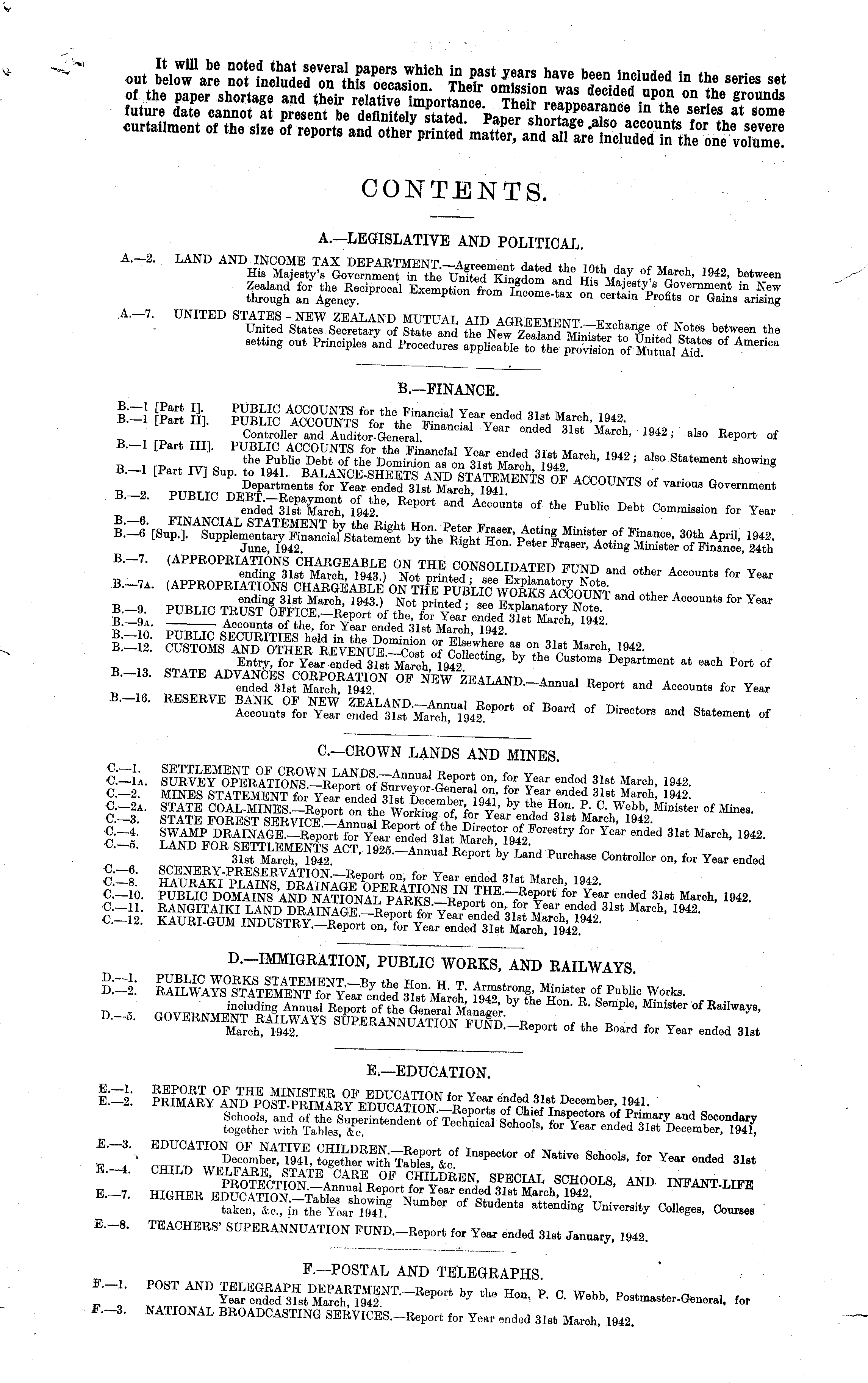 CONTENTS. A—LEGISLATIVE AND POLITICAL. A.-2. LAND ttoughfn2^nc R R eCiProCal *-"**» *°» A.-7. UNITED m®-™ ZMAND MUTUAL of Notes between the setting out Principles £d ,£&£ JSte of ffi" ° f AmWfa ' B.—FINANCE. B.—l gS g] gjgjg A C cS T T S S f0 f W 3,st ««■ R 3 ] ' n ° lal " 3lBt Mar ° h ' 1942 ' als ° Report of b' 1 1 Marl 1942 ! Statement 9h ™ing mTSSS' rnt *""* "" A — «a° P " M » •>"•> i— Year B. 7. (APPROPRIATIONS CHARGEABLE ON THE CONSOLIDATED imisrn ,i u, ending 31st March, 1943.) Not nrintcd • see if»,i t wian ° Accounts for Year 8.-7 a. (APPROPRIATIONS CHARGEABLE ON THE KJBLIC , « t ending 31st March, 1943.) Not printed ■ see Tfvnl + wH a " ° r Acoounts fo r Year 8.-9 PUBLIC TRUST OFFICE.—Report if CHL' aft&ft i Accounts of the, for Year ended 31st March 104.9 ' B:=L 0 : °* f « «- *«*. 1942. , Entry, for Year ended 31st March,°l942 " g ' by the Customs Department at each Port of STATE AD ™ES OE NEW ZEALAND. Annual Report and Accounts for Year A 16. RESERVE of Board of Directors and Statement of C— CROWN LANDS AND MINES. a-L p eport , orn ' r Year ended 3lat March, 1942. ■C.—2. MINES STATEMENT for Von J ri a J e^ or '^ on > for Year ended 31st March, 1942 C. 2a. ST™ '* 1° 1' C " Webb - of Mines. 0.—3. STATE FOREST SERVTPP Anl i d ! ' l° r Year ended 31st March, 1942. C.-4. SWAMP DRAINAGE.—Report for YoarTdod 31st fOT Yea * ended 31st March ' 1942 - ■ ■ LAND FOR ACT, 1925.-Annual Report by Land Purchase Controller on, for Year ended C.-10. PUBLIC DOMAINS AND NATIONAL PARKS Vlnl lT" for Year ended 31st March, 1942. &S March ' im - VAum OrUM INI)UoTRY. Report on, for Year ended 31st March, 1942. D.—IMMIGRATION, PUBLIC WORKS, AND RAILWAYS 23: SSfSSSiSiiI , March, 1942. UAIION FUND. Report of the Board for Year ended 31st E.—EDUCATION. K—2! PRraiA^RY^AN^'pVsT^Rm?RV^i7^?TP^ A f ?F Yoar ended 31st December, 1941. " InSp6Ctor ° f Na " Ve S ° hoolS ' " «- E.—7. HIGHER INFAN ™ Number 0f StUdent3 attendin S University Colleges, Courses E-8. TEACHERS' SUPERANNUATION FUND. Report for Year ended 31st January, 1942. F.—POSTAL AND TELEGRAPHS. E-l. POST AND Report by the Hon. P. C. Webb, Postmaster-Genera., for 3' NATIONAL BROADCASTING SERVICES.-Report for Year ended 31st March, 1942.
