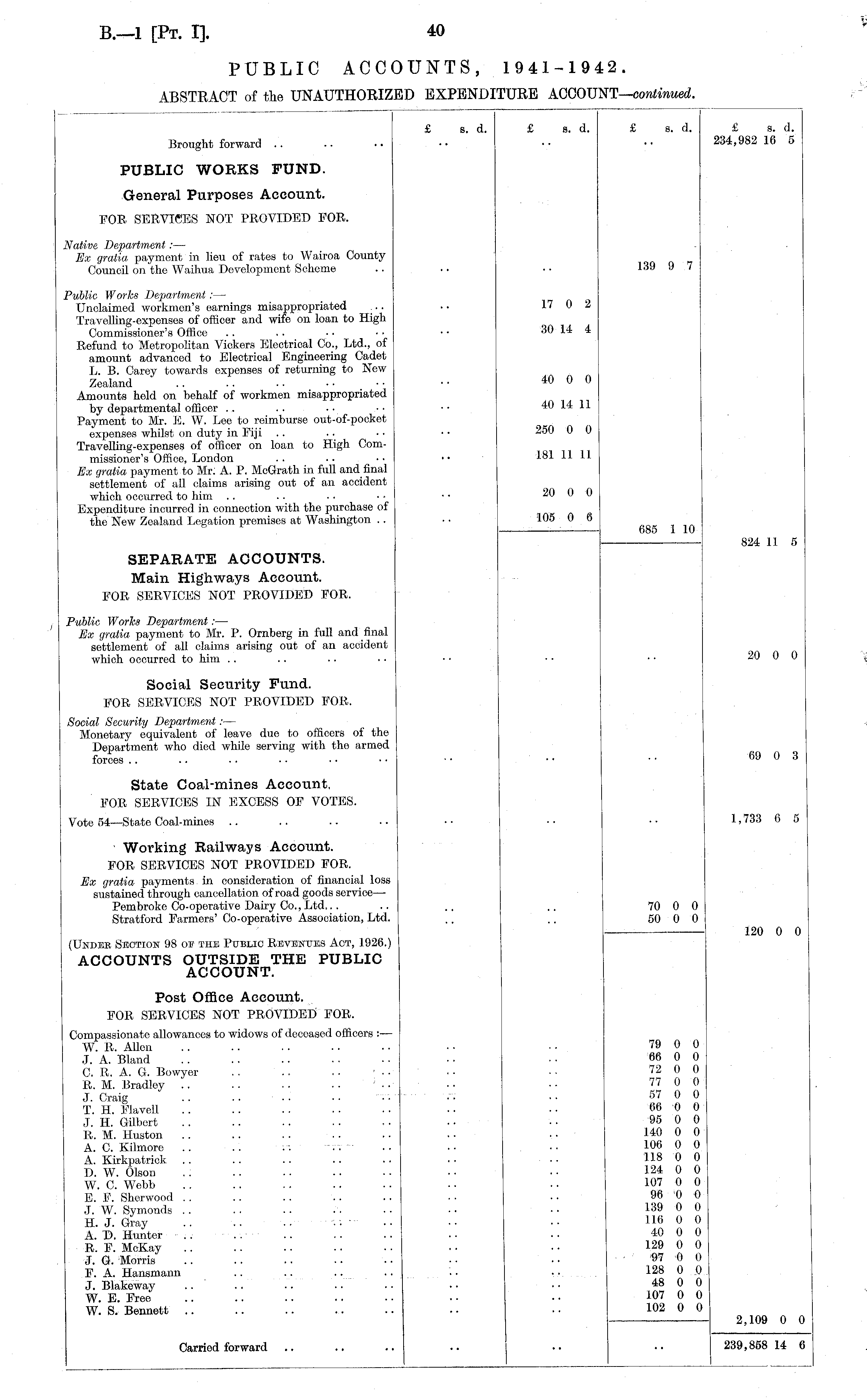 £ s. d. £ s. d. £ 8. d. £ s. d. Brought forward .. .. •• •• •• •• 234,982 16 5 PUBLIC WORKS FUND. General Purposes Account. FOR SERVICES NOT PROVIDED FOR. Native Department:— Ex gratia payment in lieu of rates to Wairoa County Council on the Waihua Development Scheme .. .. • • 139 9 7 Public Works Department:— Unclaimed workmen's earnings misappropriated .. • • 17 0 2 Travelling-expenses of officer and wife on loan to High Commissioner's Office . . .. .. • • • • 30 14 4 Refund to Metropolitan Vickers Electrical Co., Ltd., of amount advanced to Electrical Engineering Cadet L. B. Carey towards expenses of returning to New Zealand .. • • ■ • • • • • ■ • 40 0 0 Amounts held on behalf of workmen misappropriated by departmental officer .. .. .. •• 40 14 11 Payment to Mr. E. W. Lee to reimburse out-of-pocket expenses whilst on duty in Fiji .. .. • • • • 250 0 0 Travelling-expenses of officer on loan to High Commissioner's Office, London .. .. •• •• 181 11 11 Ex gratia payment to Mr; A. P. McGrath in full and final settlement of all claims arising out of an accident which occurred to him .. .. .. ■ • • • 20 0 0 Expenditure incurred in connection with the purchase of the New Zealand Legation premises at Washington .. •• 105 0 6 — 085 1 10 824 11 5 SEPARATE ACCOUNTS. Main Highways Account. FOR SERVICES NOT PROVIDED FOR. Public Works Department Ex gratia payment to Mr. P. Ornberg in full and final settlement of all claims arising out of an accident which occurred to him .. .. .. • • ■ • • • • • 20 0 0 Social Security Fund. FOR SERVICES NOT PROVIDED FOR. Social Security Department:— Monetary equivalent of leave due to officers of the Department who died while serving with the armed forces .. .. . • ■ • • • • • ■ • • • ■ ■ 69 0 3 State Coal-mines Account. FOR SERVICES IN EXCESS OF VOTES. Vote 54—State Coal-mines .. .. .. ■ • ■ ■ ■ ■ • ■ 1 > 6 5 Working Railways Account. FOR SERVICES NOT PROVIDED FOR. Ex gratia payments in consideration of financial loss sustained through cancellation of road goods service— Pembroke Co-operative Dairy Co., Ltd... .. .. .. 70 0 0 Stratford Farmers' Co-operative Association, Ltd. .. .. 50 0 0 120 0 0 (Undeb Section 98 of the Public Revenues Act, 1926.) ACCOUNTS OUTSIDE THE PUBLIC ACCOUNT. Post Office Account. FOR SERVICES NOT PROVIDED FOR. Compassionate allowances to widows of deceased officers :— W. R. Allen .. .. .. . . • ■ ■ ■ • • 79 0 0 .T. A. Bland . . .. .. . . • ■ ■ • • ■ 66 0 0 C. R. A. G. Bowyer . . .. . . ■ • . • • • 72 0 0 R. M. Bradley .. .. . . . . .... .. 77 0 0 J. Craig • ■ • • 57 0 0 T. H. Flavell .. .. . . ■ • • • • • • • 66 0 0 J. H. Gilbert .. .. .. . . ■ • • • ■ • 95 0 0 R. M. Huston .. .. . . . . . • . • ■ ■ 140 0 0 A. C. Kilmore .. . . . . ■ . • • • ■ • ■ 106 0 0 A. Kirkpatrick .. .. .. .. .. • • • • 118 0 0 D. W. Olson . . .. .. . • • • • • • • 124 0 0 W. C. Webb . . .. .. .. ■ ■ • • • • 107 0 0 E. F. Sherwood .. .. .. .. .. .. • • 96 0 0 J. W. Symonds .. . . .. . . • • • • ■ ■ 139 0 0 H. J. Gray .. .. .. •• •• •• 116 0 0 A. D. Hunter .. . . .. .. .. • • • • 40 0 0 R. F. McKay .. .. .. .. . • • • • • 129 0 0 J. G. Morris .. .. .. .. • ■ • ■ • ■ 97 0 0 F. A. Hansmann .. .. .. ■ • • • • • 128 0 0 J. Blakeway .. .. .. .. ■ • • • ■ • 48 0 0 W. E. Free .. .. .. .. ■ ■ • ■ • • 107 0 0 W. 8, Bennett .. .. .. .. .. . • • • 102 0 0 2,109 0 0 Carried forward .. .. .. .. • • • • 239,858 14 6