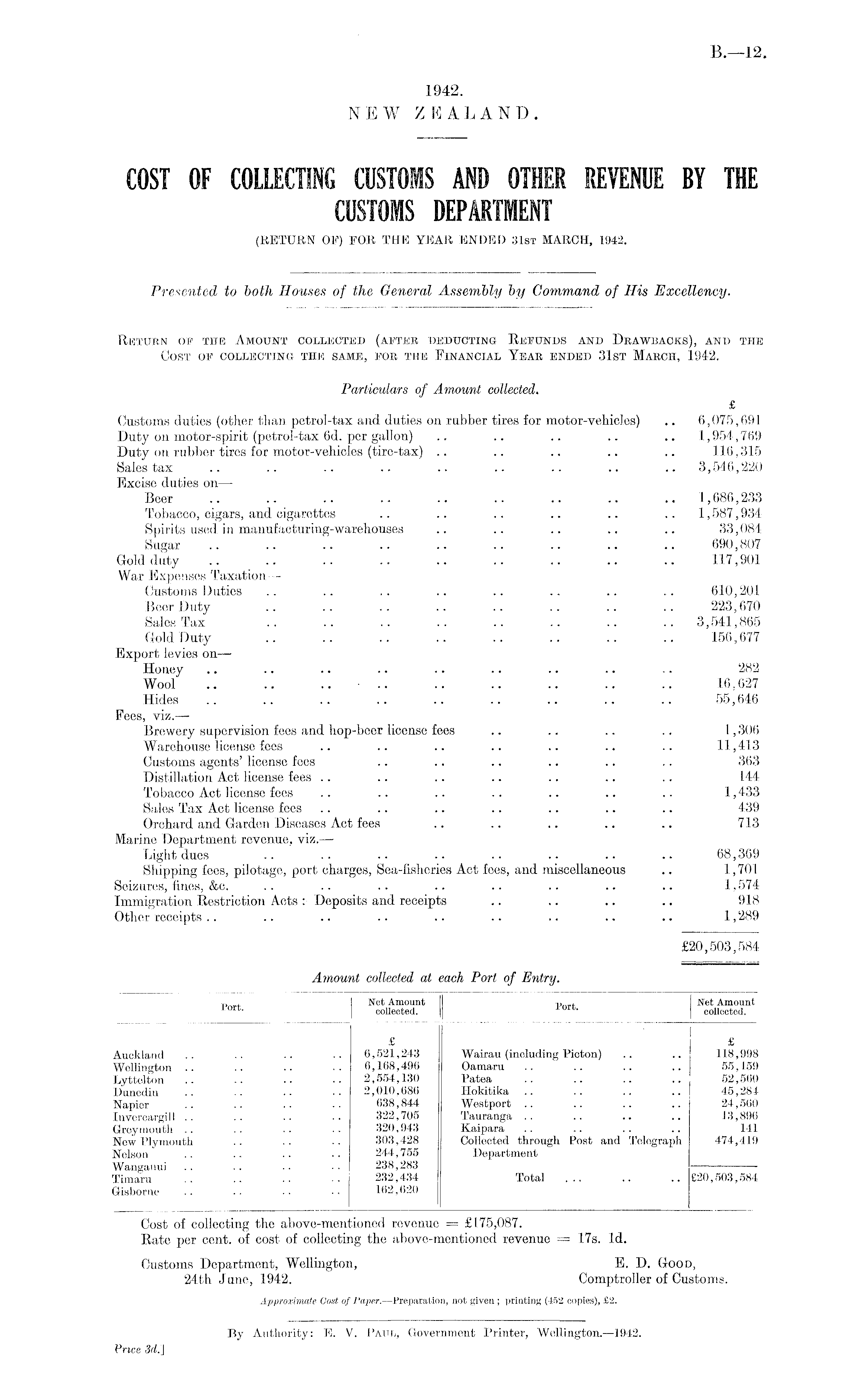 Cost of collecting the above-mentioned revenue = £175,087. Rate per cent, of cost of collecting the above-mentioned revenue = 17s. Id. Customs Department, Wellington, E. D. Good, 24th June, 1942. Comptroller of Customs.