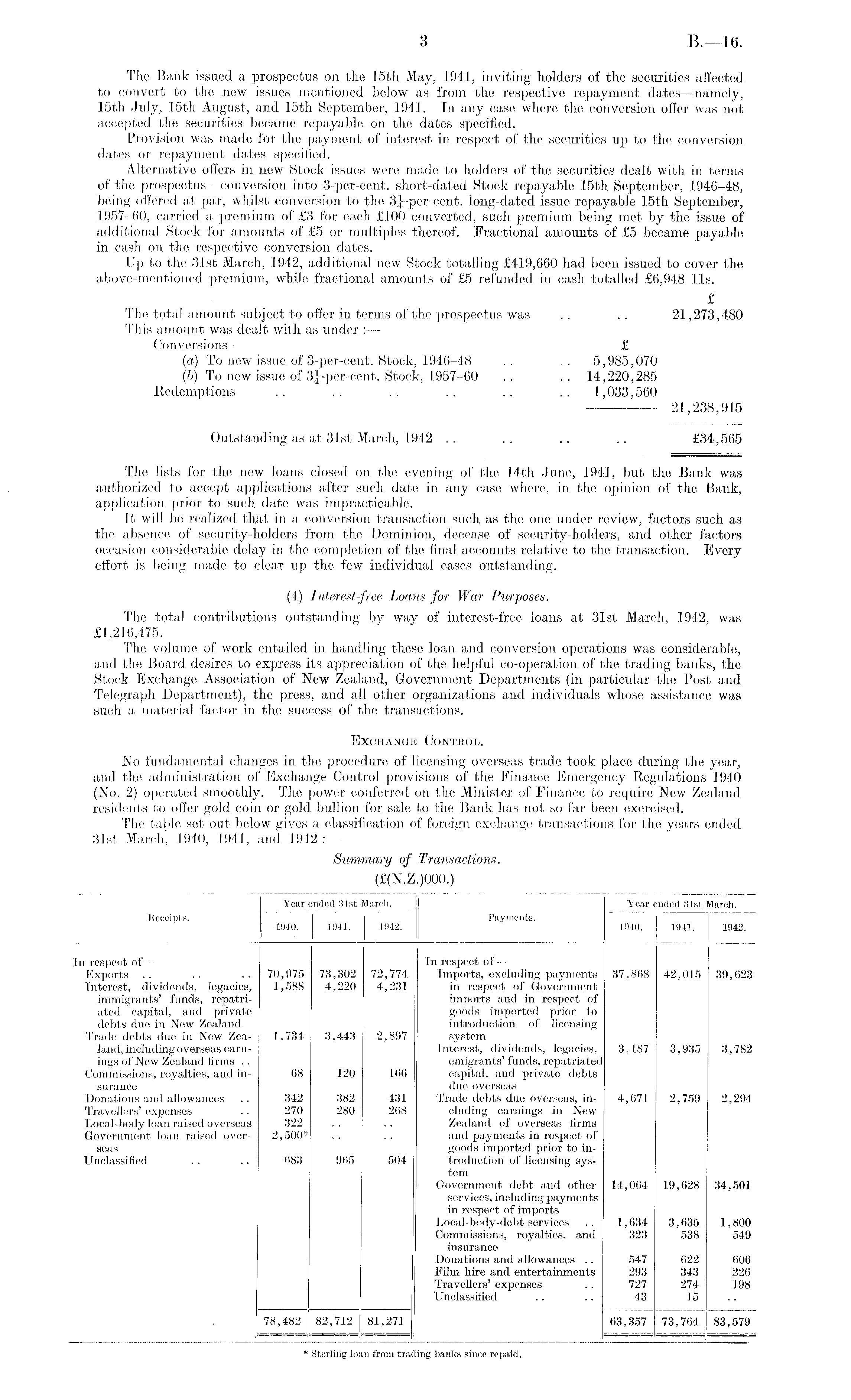 The Bank issued a prospectus on the 15th May, 1941, inviting holders of the securities affected to convert to the new issues mentioned below as from the respective repayment dates—namely, 15th July, 15th August, and 15th September, 1941. In any case where the conversion offer was not accepted the securities became repayable on the dates specified. Provision was made for the payment of interest in respect of the securities up to the conversion dates or repayment dates specified. Alternative offers in new Stock issues were made to holders of the securities dealt with in terms of the prospectus —conversion into 3-per-cent. short-dated Stock repayable 15th September, 1946-48, being offered at par, whilst conversion to the 3J-per-cent. long-dated issue repayable 15th September, 1957-60, carried a premium of £3 for each £100 converted, such premium being met by the issue of additional Stock for amounts of £5 or multiples thereof. Fractional amounts of £5 became payable in cash on the respective conversion dates. Up to the 31st March, 194-2, additional new Stock totalling £419,660 had been issued to cover the above-mentioned premium, while fractional amounts of £5 refunded in cash totalled £6,948 lis. £ The total amount subject to offer in terms of the prospectus was .. .. 21,273,480 This amount was dealt with as under :—- Conversions — £ (a) To new issue of 3-per-cent. Stock, 1946-48 .. .. 5,985,070 (b) To new issue of 3|-per-cent. Stock, 1957-60 .. . . 14,220,285 Redemptions .. .. .. .. .. .. 1,033,560 21,238,915 Outstanding as at 31st March, 1942 .. .. .. .. £34,565 The lists for the new loans closed on the evening of the 14th June, 1941, but the Bank was authorized to accept applications after such date in any case where, in the opinion of the Bank, application prior to such date, was impracticable. It will be realized that in a conversion transaction such as the one under review, factors such a,s the absence of security-holders from the Dominion, decease of security-holders, and other factors occasion considerable delay in the completion of the final accounts relative to the transaction. Every effort is being made to clear up the few individual cases outstanding. (4) Interest-free Loans for War Purposes. The total contributions outstanding by way of interest-free loans at 31st March, 1942, was £1,216,475. The volume of work entailed in handling these loan and conversion operations was considerable, and the Board desires to express its appreciation of the helpful co-operation of the trading banks, the Stock Exchange Association of New Zealand, Government .Departments (in particular the Post and Telegraph Department), the press, and all other organizations and individuals whose assistance was such a material factor in the success of the transactions. Exchange Control. No fundamental changes in the procedure of licensing overseas trade took place during the year, and the administration of Exchange Control provisions of the Finance Emergency Regulations 1940 (No. 2) operated smoothly. The power conferred on the Minister of Finance to require New Zealand residents to offer gold coin or gold bullion for sale to the Bank has not so far been exercised. The table set out below gives a classification of foreign exchange transactions for the years ended 31st March, 1940, 1941, and 1942 : —