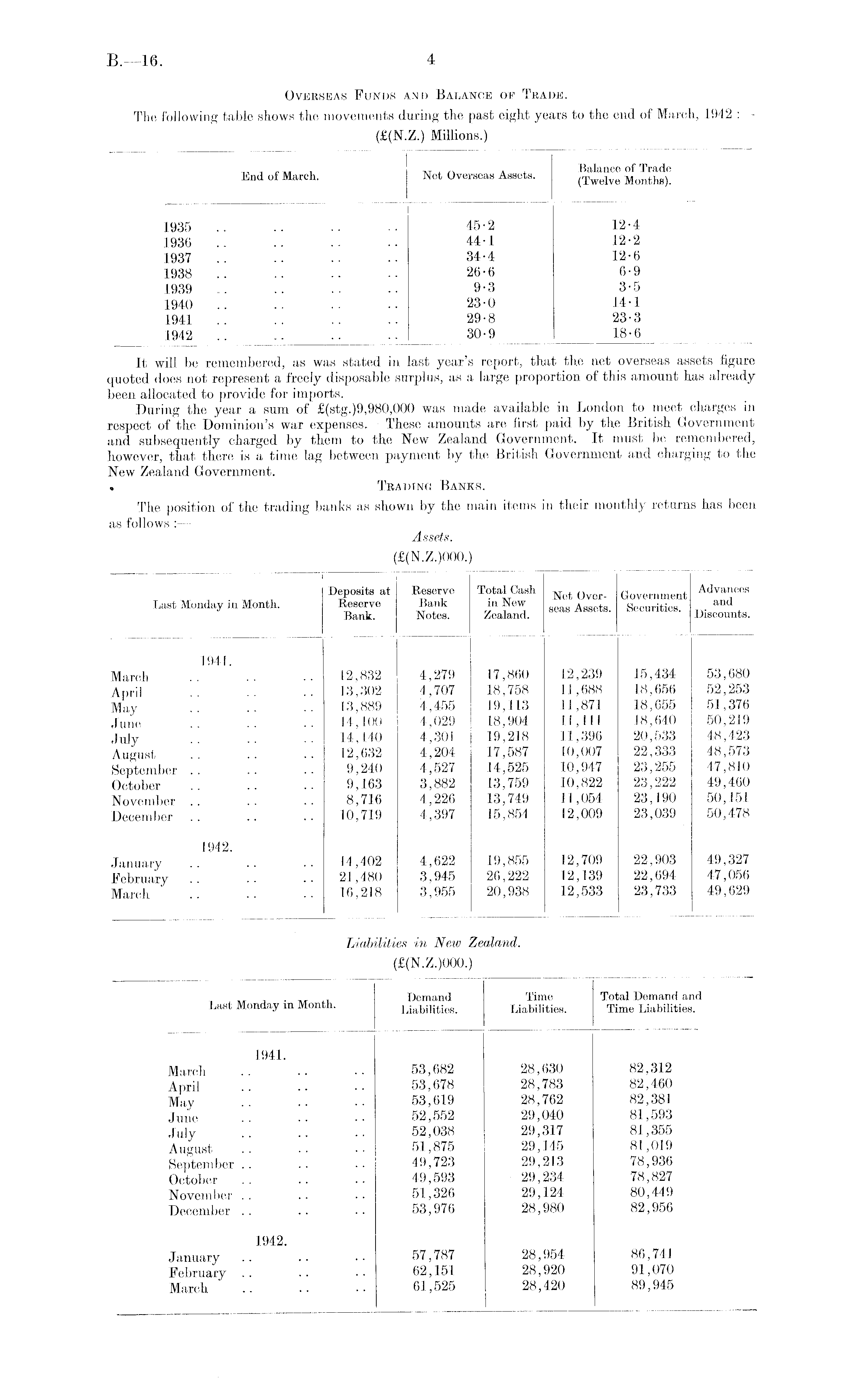 (£(N.Z.) Millions.) _ . . at i. » j Balance of Trade End of March. Net Overseas Assets. (Twelve Months). r 1935 .. .. .. 45-2 12-4 1936 .. .. .. 44-1 12-2 1937 .. .. .. •• 34-4 12-6 1938 .. .. .. .. 26-6 6-9 1939 .. .. .. 9-3 3-5 1940 .. .. .. 23'0 14-1 1941 .. .. .. .. 29-8 23-3 1942 .. .. .. .. 30-9 18-6