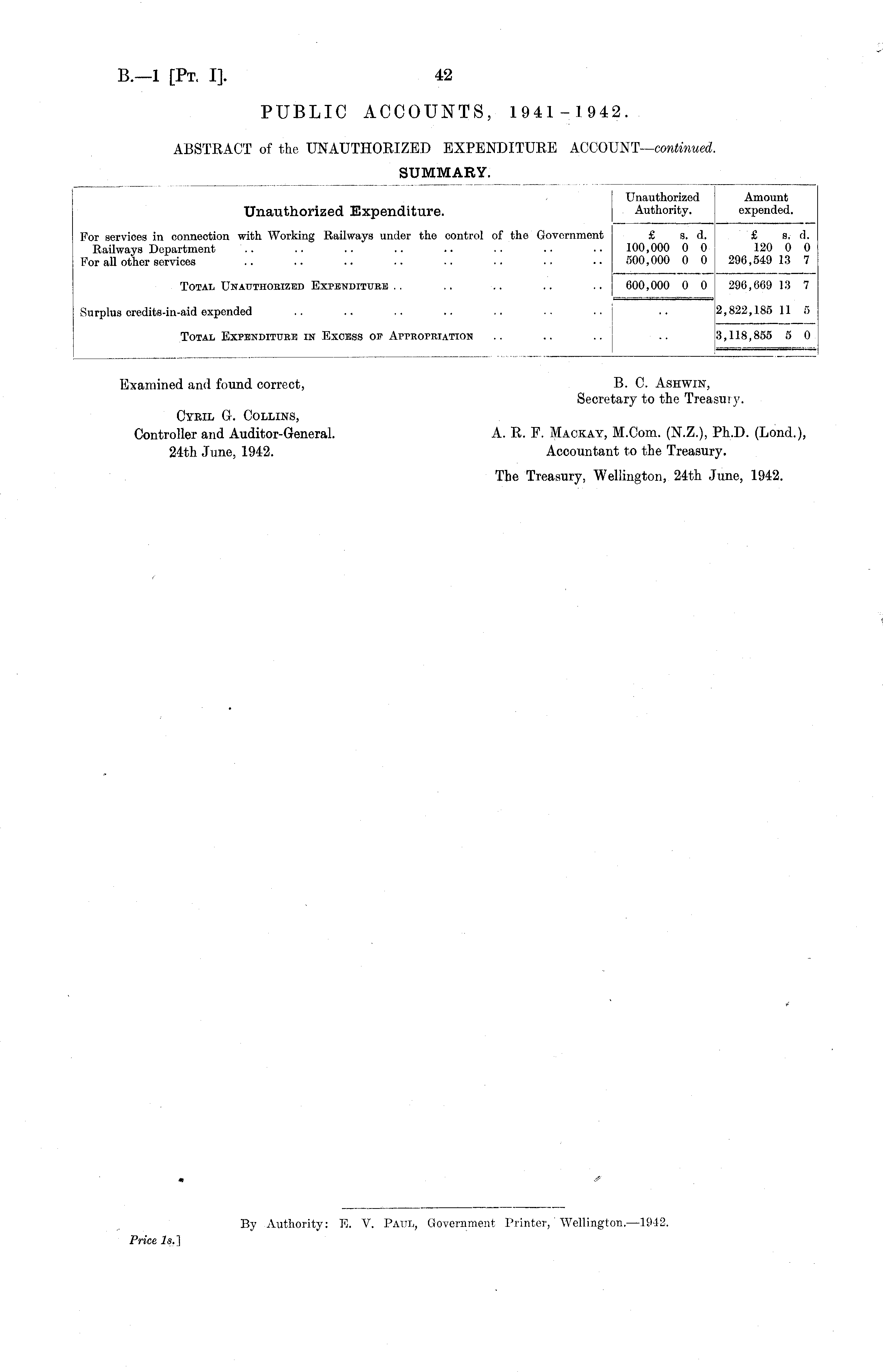 Examined and found corrcct, B. C. Ashwin, Secretary to the Treasury. Cyril G. Collins, Controller and Auditor-General. A. R. F. Mackay, M.Com. (N.Z.), Ph.D. (Lond.), 24th June, 1942. Accountant to the Treasury. The Treasury, Wellington, 24th June, 1942.