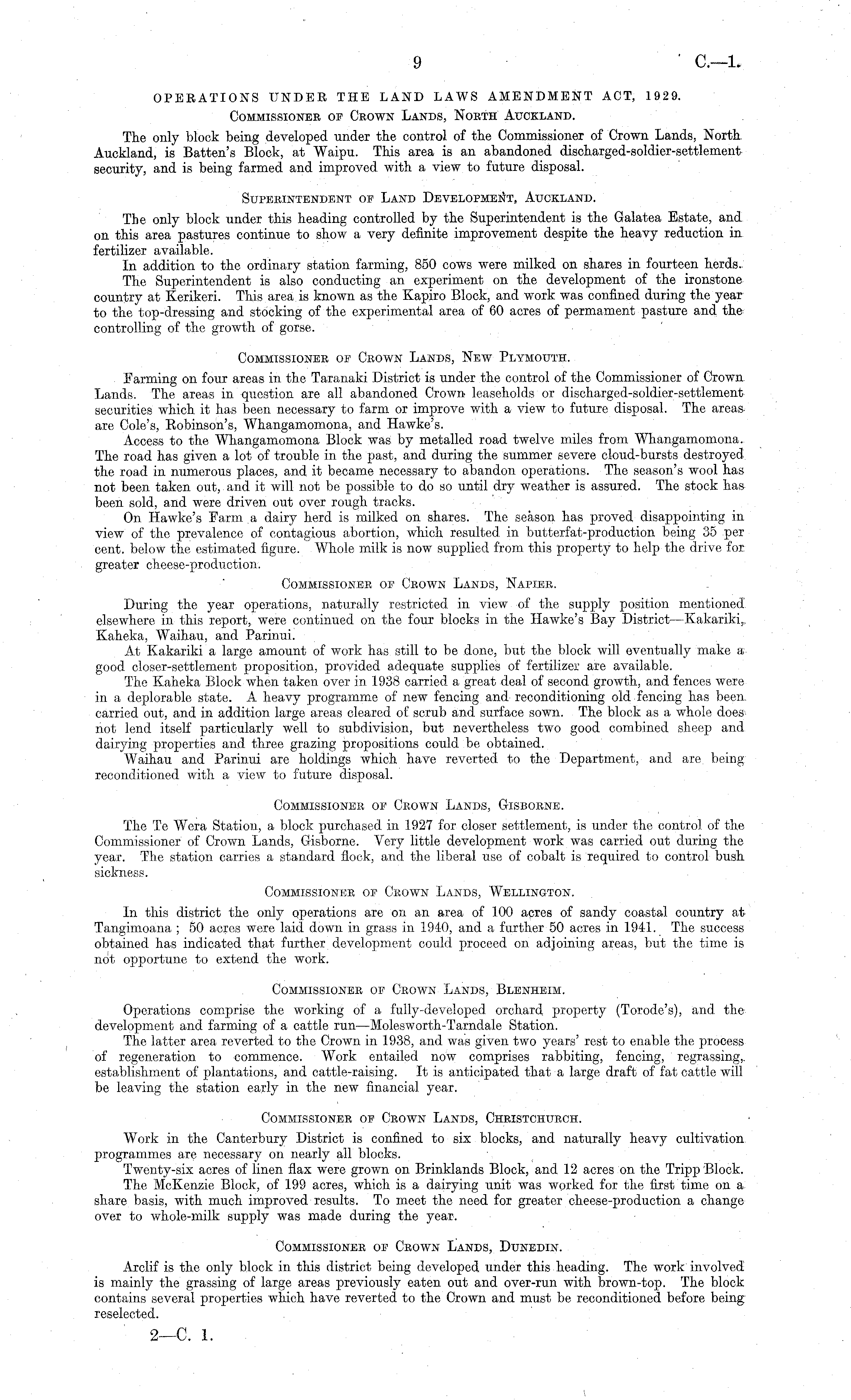 OPERATIONS UNDER THE LAND LAWS AMENDMENT ACT, 1929. Commissioner of Crown Lands, North Auckland. The only block being developed under the control of the Commissioner of Crown Lands, North Auckland, is Batten's Block, at Waipu. This area is an abandoned discharged-soldier-settlement security, and is being farmed and improved with a view to future disposal. Superintendent of Land Development, Auckland. The only block under this heading controlled by the Superintendent is the Galatea Estate, and on this area pastures continue to show a very definite improvement despite the heavy reduction in fertilizer available. In addition to the ordinary station farming, 850 cows were milked on shares in fourteen herds. The Superintendent is also conducting an experiment on the development of the ironstone country at Kerikeri. This area is known as the Kapiro Block, and work was confined during the year to the top-dressing and stocking of the experimental area of 60 acres of permament pasture and the controlling of the growth of gorse. Commissioner of Crown Lands, New Plymouth. Farming on four areas in the Taranaki District is under the control of the Commissioner of Crown Lands. The areas in question are all abandoned Crown leaseholds or discharged-soldier-settlement securities which it has been necessary to farm or improve with a view to future disposal. The areasare Cole's, Robinson's, Whangamomona, and Hawke's. Access to the Whangamomona Block was by metalled road twelve miles from Whangamomona. The road has given a lot of trouble in the past, and during the summer severe cloud-bursts destroyed, the road in numerous places, and it became necessary to abandon operations. The season's wool has not been taken out, and it will not be possible to do so until dry weather is assured. The stock has been sold, and were driven out over rough tracks. On Hawke's Farm a dairy herd is milked on shares. The season has proved disappointing in view of the prevalence of contagious abortion, which resulted in butterfat-production being 35 per cent, below the estimated figure. Whole milk is now supplied from this property to help the drive for greater cheese-production. Commissioner of Crown Lands, Napier. During the year operations, naturally restricted in view of the supply position mentioned elsewhere in this report, were continued on the four blocks in the Hawke's Bay District —Kakariki,, Kaheka, Waihau, and Parinui. At Kakariki a large amount of work has still to be done, but the block will eventually make a good closer-settlement proposition, provided adequate supplies of fertilizer are available. The Kaheka Block when taken over in 1938 carried a great deal of second growth, and fences were in a deplorable state. A heavy programme of new fencing and reconditioning old fencing has been, carried out, and in addition large areas cleared of scrub and surface sown. The block as a whole does not lend itself particularly well to subdivision, but nevertheless two good combined sheep and dairying properties and three grazing propositions could be obtained. Waihau and Parinui are holdings which have reverted to the Department, and are beingreconditioned with a view to future disposal. Commissioner of Crown Lands, Gisborne. The Te Wera Station, a block purchased in 1927 for closer settlement, is under the control of the Commissioner of Crown Lands, Gisborne. Very little development work was carried out during the year. The station carries a standard flock, and the liberal use of cobalt is required to control bush sickness. Commissioner of Crown Lands, Wellington. In this district the only operations are on an area of 100 acres of sandy coastal country at Tangimoana ; 50 acres were laid down in grass in 1940, and a further 50 acres in 1941. The success obtained has indicated that further development could proceed on adjoining areas, but the time is not opportune to extend the work. Commissioner of Crown Lands, Blenheim. Operations comprise the working of a fully-developed orchard property (Torode's), and the development and farming of a cattle run —Molesworth-Tarndale Station. The latter area reverted to the Crown in 1938, and was given two years' rest to enable the process of regeneration, to commence. Work entailed now comprises rabbiting, fencing, regrassing,. establishment of plantations, and cattle-raising. It is anticipated that a large draft of fat cattle will be leaving the station early in the new financial year. Commissioner of Crown Lands, Christchurch. Work in the Canterbury District is confined to six blocks, and naturally heavy cultivation programmes are necessary on nearly all blocks. Twenty-six acres of linen flax were grown on Brinklands Block, and 12 acres on the Tripp Block. The McKenzie Block, of 199 acres, which is a dairying unit was worked for the first time on a share basis, with much improved results. To meet the need for greater cheese-production a change over to whole-milk supply was made during the year. Commissioner of Crown Lands, Dunedin. Arclif is the only block in this district being developed under this heading. The work involved is mainly the grassing of large areas previously eaten out and over-run with brown-top. The block contains several properties which have reverted to the Crown and must be reconditioned before being reselected.