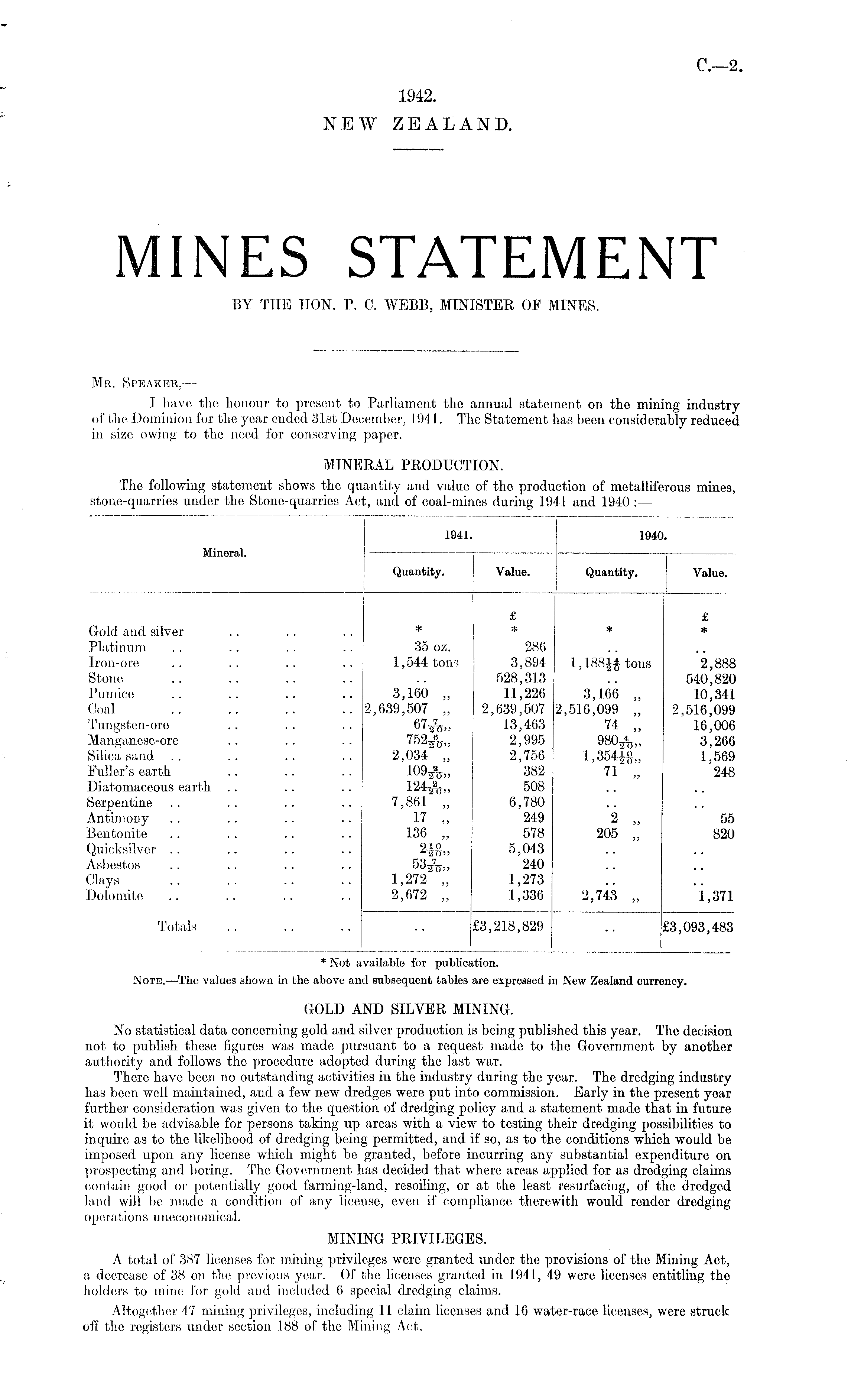 GOLD AND SILVER MINING. No statistical data concerning gold and silver production is being published this year. The decision not to publish these figures was made pursuant to a request made to the Government by another authority and follows the procedure adopted during the last war. There have been no outstanding activities in the industry during the year. The dredging industry has been well maintained, and a few new dredges were put into commission. Early in the present year further consideration was given to the question of dredging policy and a statement made that in future it would be advisable for persons taking up areas with a view to testing their dredging possibilities to inquire as to the likelihood of dredging being permitted, and if so, as to the conditions which would be imposed upon any license which might be granted, before incurring any substantial expenditure on prospecting and boring. The Government has decided that where areas applied for as dredging claims contain good or potentially good farming-land, resoiling, or at the least resurfacing, of the dredged land will be made a condition of any license, even if compliance therewith would render dredging operations uneconomical. MINING PRIVILEGES. A total of 387 licenses for mining privileges were granted under the provisions of the Mining Act, a decrease of 38 on the previous year. Of the licenses granted in 1941, 49 were licenses entitling the holders to mine for gold and included 6 special dredging claims. Altogether 47 mining privileges, including 11 claim licenses and 16 water-race licenses, were struck off the registers under section 188 of the Mining Act.
