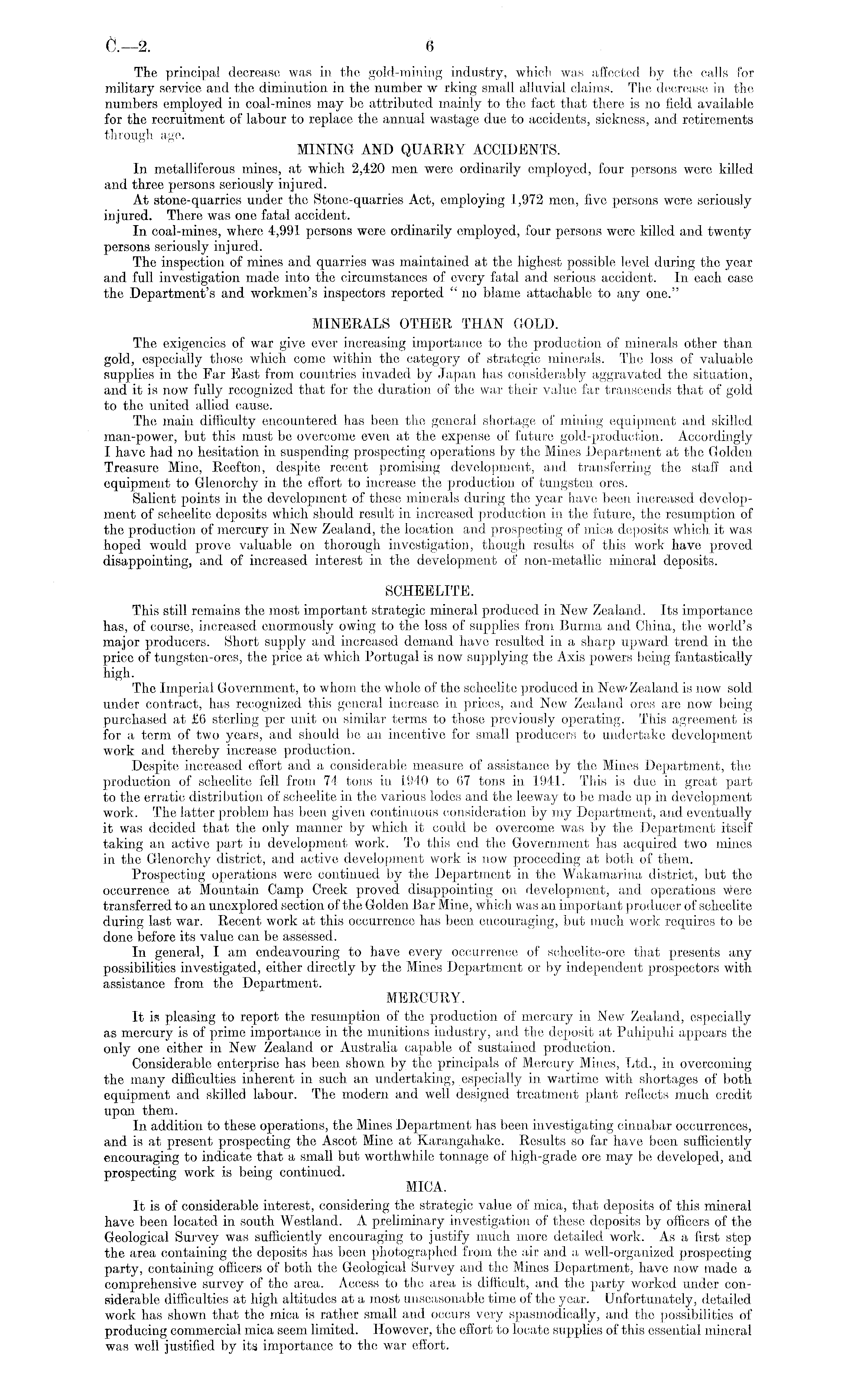 The principal decrease was in the gold-mining industry, which was affected by the calls for military service and the diminution in the number w rking small alluvial claims. The decrease in the numbers employed in coal-mines may be attributed mainly to the fact that there is no field available for the recruitment of labour to replace the annual wastage due to accidents, sickness, and retirements through age. MINING AND QUARRY ACCIDENTS. In metalliferous mines, at which 2,4-20 men were ordinarily employed, four persons were killed and three persons seriously injured. At stone-quarries under the Stone-quarries Act, employing 1,972 men, five persons were seriously injured. There was one fatal accident. In coal-mines, where 4,991 persons were ordinarily employed, four persons were killed and twenty persons seriously injured. The inspection of mines and quarries was maintained at the highest possible level during the year and full investigation made into the circumstances of every fatal and serious accident. In each case the Department's and workmen's inspectors reported " no blame attachable to any one." MINERALS OTHER THAN GOLD. The exigencies of war give ever increasing importance to the production of minerals other than gold, especially those which come within the category of strategic minerals. The loss of valuable supplies in the Far East from countries invaded by Japan has considerably aggravated the situation, and it is now fully recognized that for the duration of the war their value far transcends that of gold to the united allied cause. The main difficulty encountered has been the general shortage of mining equipment and skilled man-power, but this must be overcome even at the expense of future gold-production. Accordingly I have had no hesitation in suspending prospecting operations by the Mines Department at the Golden Treasure Mine, Reefton, despite recent promising development, and transferring the staff and equipment to Glenorchy in the effort to increase the production of tungsten ores. Salient points in the development of these minerals during the year have been increased development of scheelite deposits which should result in increased production in the future, the resumption of the production of mercury in New Zealand, the location and prospecting of mica deposits which it was hoped would prove valuable on thorough investigation, though results of this work have proved disappointing, and of increased interest in the development of non-metallic mineral deposits. SCHEELITE. This still remains the most important strategic mineral produced in New Zealand. Its importance has, of course, increased enormously owing to the loss of supplies from Burma and China, the world's major producers. Short supply and increased demand have resulted in a sharp upward trend in the price of tungsten-ores, the price at which Portugal is now supplying the Axis powers being fantastically hi g h - The Imperial Government, to whom the whole of the scheelite produced in New Zealand is now sold under contract, has recognized this general increase in prices, and New Zealand ores arc now being purchased at £6 sterling per unit on similar terms to those previously operating. This agreement is for a term of two years, and should be an incentive for small producers to undertake development work and thereby increase production. Despite increased effort and a considerable measure of assistance by the Mines Department, the production of scheelite fell from 74 tons in 1940 to 67 tons in 1941. This is due in great part to the erratic distribution of scheelite in the various lodes and the leeway to be made up in development work. The latter problem has been given continuous consideration by my Department, and eventually it was decided that the only manner by which it could be overcome was by the Department itself taking an active part in development work. To this end the Government has acquired two mines in the Glenorchy district, and active development work is now proceeding at both of them. Prospecting operations were continued by the Department in the Wakamarina district, but the occurrence at Mountain Camp Creek proved disappointing on development, and operations transferred to an unexplored section of the Golden Bar Mine, which was an important producer of scheelite during last war. Recent work at this occurrence has been encouraging, but much work requires to be done before its value can be assessed. In general, I am endeavouring to have every occurrence of scheelite-ore that presents any possibilities investigated, either directly by the Mines Department or by independent prospectors with assistance from the Department. MERCURY. It is pleasing to report the resumption of the production of mercury in New Zealand, especially as mercury is of prime importance in the munitions industry, and the deposit at Puhipuhi appears the only one either in New Zealand or Australia capable of sustained production. Considerable enterprise has been shown by the principals of Mercury Mines, Ltd., in overcoming the many difficulties inherent in such an undertaking, especially in wartime with shortages of both equipment and skilled labour. The modern and well designed treatment plant reflects much credit upon them. In addition to these operations, the Mines Department has been investigating cinnabar occurrences, and is at present prospecting the Ascot Mine at Karangahake. Results so far have been sufficiently encouraging to indicate that a small but worthwhile tonnage of high-grade ore may be developed, and prospecting work is being continued. MICA. It is of considerable interest, considering the strategic value of mica, that deposits of this mineral have been located in south Westland. A preliminary investigation of these deposits by officers of the Geological Survey was sufficiently encouraging to justify much more detailed work. As a first step the area containing the deposits has been photographed from the air and a well-o