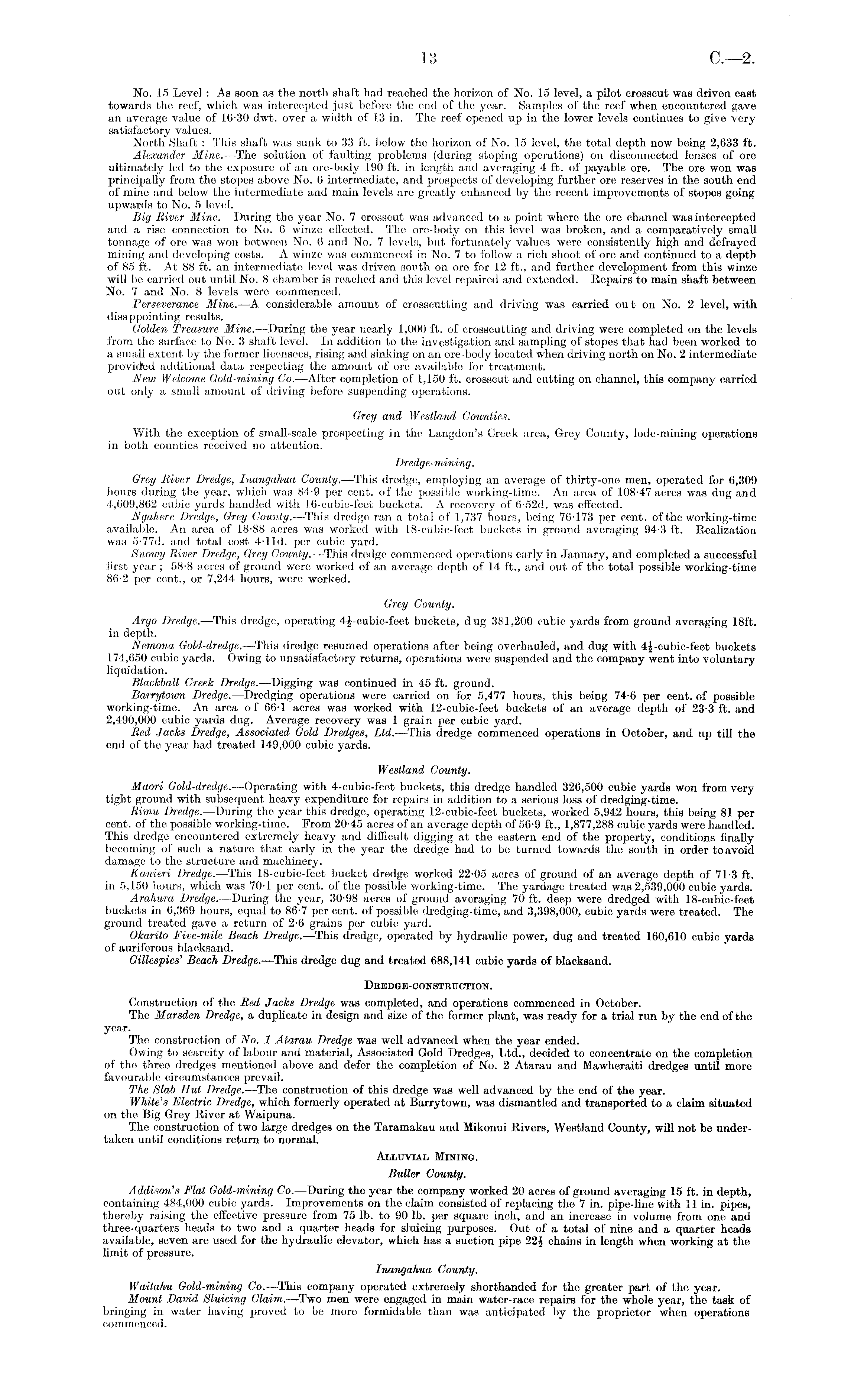 No. 15 Level: As soon as the north shaft had reached the horizon of No. 15 level, a pilot crosscut was driven cast towards the reef, which was intercepted just before the end of the year. Samples of the reef when encountered gave an average value of 16-30 dwt. over a width of 13 in. The reef opened up in the lower levels continues to give very satisfactory values. North Shaft: This shaft was sunk to 33 ft. below the horizon of No. 15 level, the total depth now being 2,633 ft. Alexander Mine. —The solution of faulting problems (during stoping operations) on disconnected lenses of ore ultimately led to the exposure of an ore-body 190 ft. in length and averaging 4 ft. of payable ore. The ore won was principally from the stopes above No. 6 intermediate, and prospects of developing further ore reserves in the south end of mine and below the intermediate and main lovcls are greatly enhanced by the recent improvements of stopes going upwards to No. 5 level. Big River Mine.—During the year No. 7 crosscut was advanced to a point where the ore channel was intercepted and a rise connection to No. 6 winze effected. The ore-body on this level was broken, and a comparatively small tonnage of ore was won between No. 6 and No. 7 levels, but fortunately values were consistently high and defrayed mining and developing costs. A winze was commenced, in No. 7to follow a rich shoot of ore and continued to a depth of 85 ft. At 88 ft. an intermediate level was driven south on ore for 12 ft., and further development from this winze will be carried out until No. 8 chamber is reached and this level repaired and extended. Repairs to main shaft between No. 7 and No. 8 levels were commenced. Perseverance Mine.—A considerable amount of crosscutting and driving was carried out on No. 2 level, with disappointing results. Golden Treasure Mine. —'During the year nearly 1,000 ft. of crosscutting and driving were completed on the levels from the surface to No. 3 shaft level. In addition to the investigation and sampling of stopes that had been worked to a small extent by the former licensees, rising and sinking on an ore-body located when driving north on No. 2 intermediate providfcd additional data respecting the amount of ore available for treatment. New Welcome Gold-mining Co.—After completion of 1,150 ft. crosscut and cutting on channel, this company carried out only a small amount of driving before suspending operations. Grey and Westland Counties. With the exception of small-scale prospecting in the Langdon's Creek area, Grey County, lode-mining operations in both counties received no attention. Dredge-mining. Grey River Dredge, Inangahua County.—This dredge, employing an average of thirty-one men, operated for 6,309 hours during the year, which was 84-9 per cent, of the possible working-time. An area of 108-47 acres was dug and 4,609,862 cubic yards handled with 16-cubic-feet buckets. A recovery of 6-52 d . was effected. Ngahere Dredge, Grey County.—This dredge ran a total of 1,737 hours, being 76-173 per cent, of the working-time available. An area of 18-88 acres was worked with 18-cubic-feet buckets in ground averaging 94-3 ft. Realization was 5-77 d. and total cost 4-lid. per cubic yard. Snowy River Dredge, Grey County.—This dredge commenced operations early in January, and completed a successful first year ; 58-8 acres of ground were worked of an average depth of 14 ft., and out of the total possible working-time 86-2 per cent., or 7,244 hours, were worked. Grey County. Argo Dredge.—This dredge, operating 4J-cubic-feet buckets, dug 381,200 cubic yards from ground averaging 18ft. in depth. Nemona Gold-dredge.—This dredge resumed operations after being overhauled, and dug with 4£-cubic-feet buckets 174,650 cubic yards. Owing to unsatisfactory returns, operations were suspended and the company went into voluntary liquidation. Blackball Creek Dredge.—Digging was continued in 45 ft. ground. Barrytown Dredge.—Dredging operations were carried on for 5,477 hours, this being 74-6 per cent, of possible working-time. An area of 66-1 acres was worked with 12-eubic-feet buckets of an average depth of 23-3 ft. and 2,490,000 cubic yards dug. Average recovery was 1 grain per cubic yard. Red Jacks Dredge, Associated Gold Dredges, Ltd.—This dredge commenced operations in October, and up till the end of the year had treated 149,000 cubic yards. Westland County. Maori Gold-dredge.—Operating with 4-cubic-feet buckets, this dredge handled 326,500 cubic yards won from very tight ground with subsequent heavy expenditure for repairs in addition to a serious loss of dredging-time. Rimu Dredge.—During the year this dredge, operating 12-cubic-feet buckets, worked 5,942 hours, this being 81 per cent, of the possible working-time. From 20-45 acres of an average depth of 56-9 ft., 1,877,288 cubic yards were handled. This dredge encountered extremely heavy and difficult digging at the eastern end of the property, conditions finally becoming of such a nature that early in the year the dredge had to be turned towards the south in order to avoid damage to the structure and machinery. Kanieri Dredge.—This 18-cubic-feet bucket dredge worked 22-05 acres of ground of an average depth of 71-3 ft. in 5,150 hours, which was 70-1 per cent, of the possible working-timo. The yardage treated waß 2,539,000 cubic yards. Arahura Dredge.—During the year, 30-98 acres of ground averaging 70 ft. deep were dredged with 18-cubic-feet buckets in 6,369 hours, equal to 86-7 per cent, of possible dredging-time, and 3,398,000, cubic yards were treated. The ground treated gave a return of 2-6 grains per cubic yard. Okarito Five-mile Beach Dredge.—This dredge, operated by hydraulic power, dug and treated 160,610 cubic yards of auriferous blacksand. Gillespies' Beach Dredge.—This dredge dug and treated 688,141 cubic yards of blacksand. Deedge-constbuction. Construction of the Red ,Jacks Dredge was completed, and operations commenced in