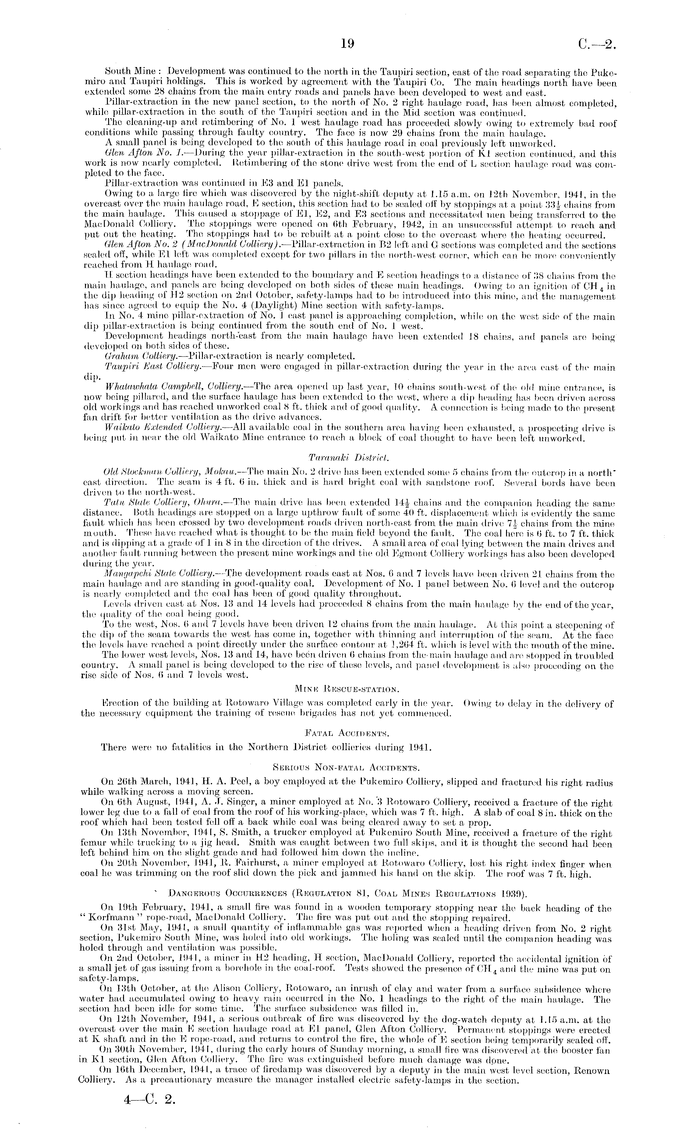 South Mine : Development was continued to the north in the Taupiri section, east of the road separating the Pukemiro and Taupiri holdings. This is worked by agreement with the Taupiri Co. The main headings north have been extended some 28 chains from the main entry roads and panels have been developed to west and east. Pillar-extraction in the new panel section, to the north of No. 2 right haulage road, has been almost completed, while pillar-extraction in the south of the Taupiri section and in the Mid section was continued. The oloaning-up and retimbering of No. 1 west haulage road has proceeded slowly owing to extremely bad roof conditions while passing through faulty country. The face is now 29 chains from the main haulage. A small panel is being developed to the south of this haulage road in coal previously left unworked. Glen Afton No. —During the year pillar-extraction in the south-west portion of K1 section continued, and this work is now nearly completed. Retimbering of the stone drive west from the end of L section haulage road was completed to the face. Pillar-extraction was continued in 153 and El panels. Owing to a large fire which was discovered by the night-shift deputy at 1.15 a.m. on 12th November, 1941, in the overcast over the main haulage road, E section, this section had to be sealed off by stoppings at a point 33| chains from the main haulage. This caused a stoppage of El, E2, and E3 sections and necessitated men being transferred to the Mac Donald Colliery. The stoppings were opened on 6th February, 1942, in an unsuccessful attempt to reach and put out the heating. The stoppings had to be rebuilt at a point close to the overcast where the heating occurred. Glen Afton No. 2 (Mac Donald Colliery).—Pillar-extraction in B2 left and G sections was completed and the sections sealed off, while El left was completed except for two pillars in the north-west corner, which can be more conveniently reached from H haulage road. H section headings have been extended to the boundary and E section headings to a distance of 38 chains from the main haulage, and panels are being developed on both sides of these main headings. Owing to an ignition of CH 4 in the dip heading of H2 section on 2nd October, safety-lamps had to be introduced into this mine, and the management has since agreed to equip the No. 4 (Daylight) Mine section with safety-lamps. In No. 4 mine pillar-extraction of No. I east panel is approaching completion, while on the west side of the main dip pillar-extraction is being continued from the south end of No. 1 west. Development headings north-'east from the main haulage have been extended 18 chains, and panels are being developed on both sides of these. Graham Colliery.—Pillar-extraction is nearly completed. Taupiri East Colliery.—Pour men were engaged in pillar-extraction during the year in the area east of the main dip. Whatawhata Campbell, Colliery.-—The area opened up last year, 10 chains south-west of the old mine entrance, is now being pillared, and tlie-surface haulage has been extended to the west, where a dip heading has been driven across old workings and has reached unworked coal 8 ft. thick and of good quality. A connection is being made to the present fan drift for better ventilation as the drive advances. Wailcato Extended, Colliery.—All available coal in the southern area having been exhausted, a prospecting drive is being put in near the old Waikato Mine entrance to reach a block of coal thought to have been left unworked. Taranaki District. Old Stockman Colliery, Mokau. —The main No. 2 drive has been extended some 5 chains from the outcrop in a north" east direction. The seam is 4 ft. 6 in. thick and is hard bright coal with sandstone roof. Several bords have been driven to the north-west. Tatu State Colliery, Ohyra.—The main drive has been extended 14J chains and the companion heading the same distance. Both headings are stopped on a large upthrow fault of some 40 ft. displacement which is evidently the same fault which has been crossed by two development roads driven north-east from the main drive 7£ chains from the mine mouth. These have reached what is thought to be the main field beyond the fault. The coal here is 0 ft. to 7 ft. thick and is dipping at a grade of linB in the direction of the drives. A small area of coal lying between the main drives and another fault running between the present mine workings and the old Egmont Colliery workings has also been developed during the year. Mangapehi State Colliery.—The development roads east at Nos. 6 and 7 levels have been driven 21 chains from the main haulage and are standing in good-quality coal. Development of No. 1 panel between No. 6 level and the outcrop is nearly completed and the coal has been of good quality throughout. Levels driven east at Nos. 13 and 14 levels had proceeded 8 chains from the main haulage by the end of the year, the quality of the coal being good. To the west, Nos. 6 and 7 levels have been driven 12 chains from the main haulage. At this point a steepening of the dip of the seam towards the west has come in, together with thinning and interruption of the seam. At the face the levels have reached a point directly under the surface contour at 1,264 ft. which is level with the mouth of the mine. The lower west levels, Nos. 13 and 14, have been driven 6 chains from themain haulage and are stopped ill troubled country. A small panel is being developed to the rise of these levels, and panel development is also proceeding on the rise side of Nos. 6 and 7 levels west. Mine Rescue-station. Erection of the building at Rotowaro Village was completed early in the year. Owing to delay in the delivery of the necessary equipment the training of rescue brigades has not yet commenced. Fatal Accidents. There were no fatalities in the Northern District collieries during 1941. Sebious Non-fatal Accidents. On 26th March, 1941, H. A. Peel, a boy employed at the Pukemiro Coll