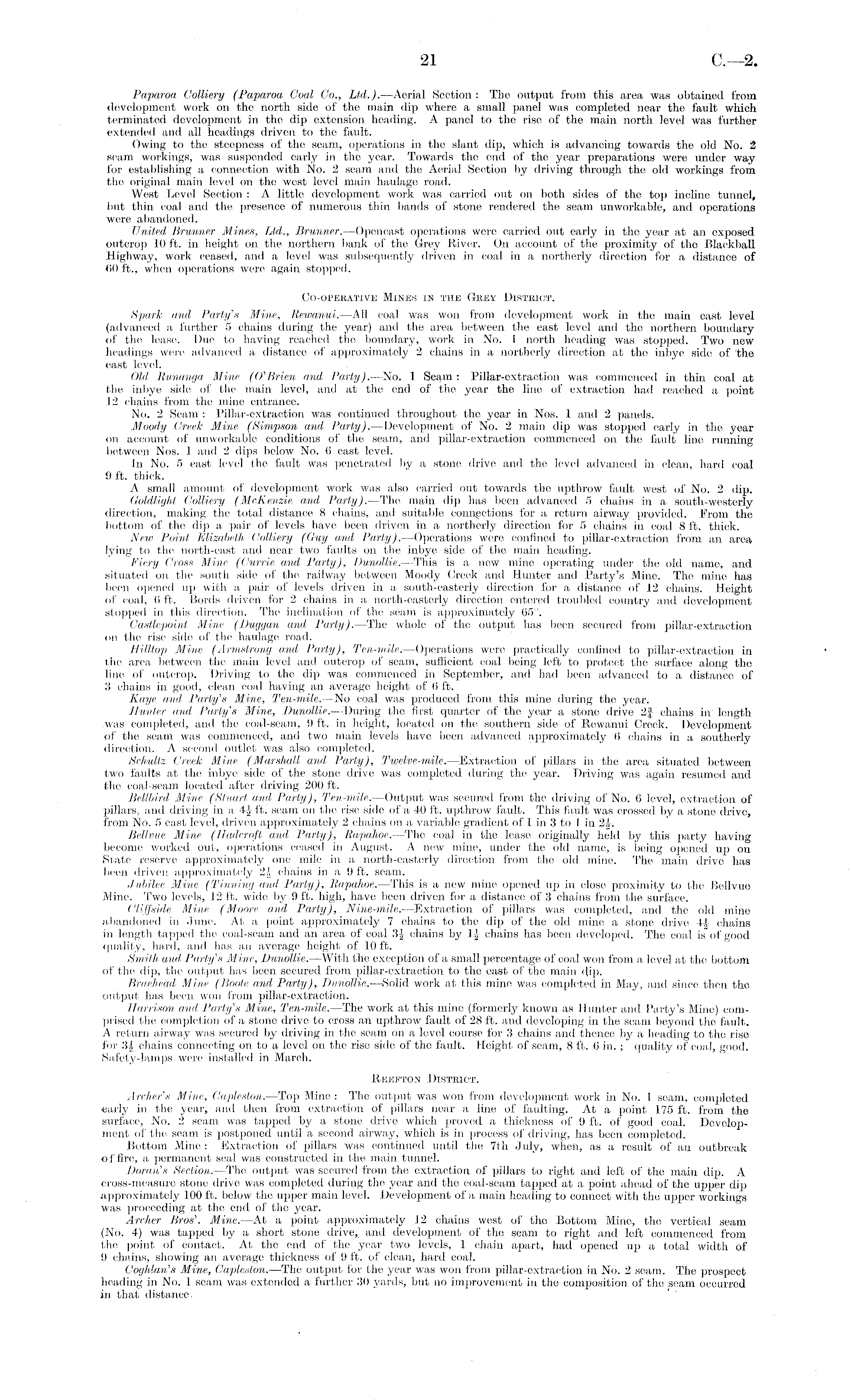 Paparoa Colliery (Paparoa Goal Co., Ltd.). —Aerial Section : The output from this area was obtained from development work on the north side of the main dip where a small panel was completed near the fault which terminated development in the dip extension heading. A panel to the rise of the main north level was further extended and all headings driven to the fault. Owing to the steepness of the seam, operations in the slant dip, which is advancing towards the old No. 2 seam workings, was suspended early in the year. Towards the end of the year preparations were under way for establishing a connection with No. 2 seam and the Aerial Section by driving through the old workings from the original main level on the west level main haulage road. West Level Section : A little development work was carried out on both sides of the top incline tunnel, but thin coal and the presence of numerous thin bands of stone rendered the seam unworkable, and operations were abandoned. United Brunner Mines, Ltd., Brunner.—Opencast operations were carried out early in the year at an exposed outcrop 10 ft. in height on the northern bank of the Grey River. On account of the proximity of the Blackball Highway, work ceased, and a level was subsequently driven in coal in a northerly direction for a distance of 60 ft., when operations were again stopped. Co-operative Mines in the Grey District. Spark and Party's Mine, Rewanui. —All coal was won from development work in the main east level (advanced a further 5 chains during the year) and the area between the east level and the northern boundary of the lease. Due to having reached the boundary, work in No. I north heading was stopped. Two new headings were advanced a distance of approximately 2 chains in a northerly direction at the inbye side of 'the east level. Old Runanga Mine. (O'Brien and Party).—No. I Seam : Pillar-extraction was commenced in thin coal at the inbye side of the main level, and at the end of the year the line of extraction had reached a point 12 chains from the mine entrance. No. 2 Seam : Pillar-extraction was continued throughout the year in Nos. 1 and 2 panels. Moody Creek Mine (Simpson and Party).—Development of No. 2 main dip was stopped early in the year on account of unworkable conditions of the seam, and pillar-extraction commenced on the fault line running between Nos. 1 and 2 dips below No. 6 east level. In No. 5 east level the fault was penetrated by a stone drive and the level advanced in clean, hard coal 9 ft. thick. A small amount of development work was also Carried out towards the upthrow fault west of No. 2 dip. Ooldlight Colliery (McKenzie and Party).—The main dip has been advanced 5 chains in a south-westerly direction, making the total distance 8 chains, and suitable connections for a return airway provided. Prom the bottom of the dip a pair of levels have been driven in a northerly direction for 5 chains in coal 8 ft. thick. New Point Elizabeth Colliery (Guy and Party).—Operations were confined to pillar-extraetion from an area lying to the north-east and near two faults on the inbye side of the main heading. Fiery Cross Mine (Currie and Party), Dunollie.—This is a new mine operating under the old name, and situated on the south side of the railway between Moody Creek and Hunter and Party's Mine. The mine has been opened up with a pair of levels driven in a south-easterly direction for a distance of 12 chains. Height of coal, 6 ft. Bords driven for 2 chains in a north-easterly direction entered troubled country and development stopped in this direction. The inclination of the seam is approximately 65°. Castlepoint Mine (Duggan and Party).—The whole of the output has been secured from pillar-extraction on the rise side of the haulage road. Hilltop Mine (Armstrong and Party), Ten-mile.—Operations were practically confined to pillar-extraction in the area between the main level and outcrop of seam, sufficient coal being left to protect the surface along the line of outcrop. Driving to the dip was commenced in September, and had been advanced to a distance of 3 chains in good, clean coal having an average height of (i ft. Kaye and Party's Mine, Ten-mile.—No coal was produced from this mine during the year. Hunter and Parly's Mine, Dunollie.—During the first quarter of the year a stone drive 2f chains in length was completed, and the coal-seam, 9 ft. in height, located on the southern side of Rewanui Creek. Development of the seam was commenced, and two main levels have been advanced approximately 6 chains in a southerly direction. A second outlet was also completed. Schullz Creek Mine (Marshall and Party), Twelve-mile.—Extraction of pillars in the area situated between two faults at the inbye side of the stone drive was completed during the year. Driving was again resumed and the coal-seam located after driving 200 ft. Bellbird Mine (Stuart and Party), Ten-mile. —Output was secured from the driving of No. 0 level, extraction of pillars, and driving in a4J ft. seam on the rise side of a4O ft. upthrow fault. This fault was crossed by a stone drive, from No. 5 east level, driven approximately 2 chains on a variable gradient of 1 in 3 to I in 2J. Bellvue Mine (Iladcroft and Party), Rapahoe.—The coal in the lease originally held by this party having become worked out, operations ceased in August. A new mine, under the old name, is being opened up on State reserve approximately one mile in a north-easterly direction from the old mine. The main drive has been driven approximately 2£ chains in a 9 ft. seam. Jubilee Mine (Tinning and Parly), Rapahoe.—This is a new mine opened up in close proximity to the Bellvue Mine. Two levels, 12 ft. wide by 9 ft. high, have been driven for a distance of 3 chains from the surface. Cliffside Mine (Moore and Party), Nine-mile.—Extraction of pillars was completed, and the old mine abandoned in .Tune. At a point approximately 7 chains to the dip of the old mine a stone drive