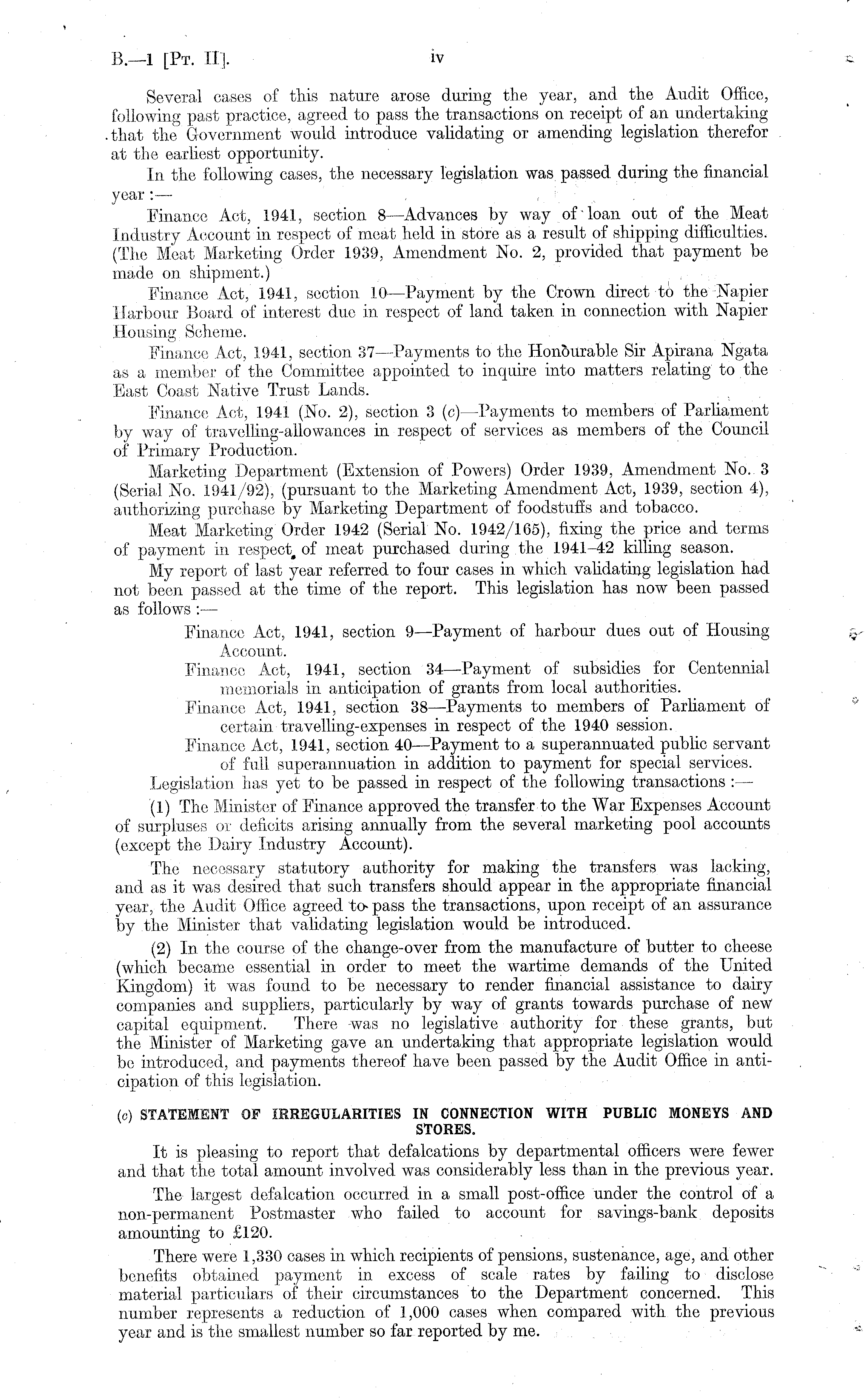Several cases of this nature arose during the year, and the Audit Office, following past practice, agreed to pass the transactions on receipt of an undertaking that the Government would introduce validating or amending legislation therefor at the earliest opportunity. In the following cases, the necessary legislation was passed during the financial year:— Finance Act, 1941, section B—Advances8 —Advances by way of loan out of the Meat Industry Account in respect of meat held in store as a result of shipping difficulties. (The Meat Marketing Order 1939, Amendment No. 2, provided that payment be made on shipment.) Finance Act, 1941, section 10 —Payment by the Grown direct to the Napier Harbour Board of interest due in respect of land taken in connection with Napier Housing Scheme. Finance Act, 1941, section 37 Payments to the Honourable Sir Apirana Ngata as a member of the Committee appointed to inquire into matters relating to the East Coast Native Trust Lands. Finance Act, 1941 (No. 2), section 3 (c) —Payments to members of Parliament by way of travelling-allowances in respect of services as members of the Council of Primary Production. Marketing Department (Extension of Powers) Order 1939, Amendment No. 3 (Serial No. 1941/92), (pursuant to the Marketing Amendment Act, 1939, section 4), authorizing purchase by Marketing Department of foodstuffs and tobacco. Meat Marketing Order 1942 (Serial No. 1942/165), fixing the price and terms of payment in respect, of meat purchased during the 1941-42 killing season. My report of last year referred to four cases in which validating legislation had not been passed at the time of the report. This legislation has now been passed as follows : — Finance Act, 1941, section 9 —Payment of harbour dues out of Housing Account. Finance Act, 1941, section 34 —Payment of subsidies for Centennial memorials in anticipation of grants from local authorities. Finance Act, 1941, section 38 —Payments to members of Parliament of certain travelling-expenses in respect of the 1940 session. Finance Act, 1941, section 40 —Payment to a superannuated public servant of full superannuation in addition to payment for special services. Legislation has yet to be passed in respect of the following transactions (1) The Minister of Finance approved the transfer to the War Expenses Account of surpluses or deficits arising annually from the several marketing pool accounts (except the Dairy Industry Account). The necessary statutory authority for making the transfers was lacking, and as it was desired that such transfers should appear in the appropriate financial year, the Audit Office agreed to- pass the transactions, upon receipt of an assurance by the Minister that validating legislation would be introduced. (2) In the course of the change-over from the manufacture of butter to cheese (which became essential in order to meet the wartime demands of the United Kingdom) it was found to be necessary to render financial assistance to dairy companies and suppliers, particularly by way of grants towards purchase of new capital equipment. There was no legislative authority for these grants, but the Minister of Marketing gave an undertaking that appropriate legislation would be introduced, and payments thereof have been passed by the Audit Office in anticipation of this legislation. (c) STATEMENT OF IRREGULARITIES IN CONNECTION WITH PUBLIC MONEYS AND STORES. It is pleasing to report that defalcations by departmental officers were fewer and that the total amount involved was considerably less than in the previous year. The largest defalcation occurred in a small post-office under the control of a non-permanent Postmaster who failed to account for savings-bank deposits amounting to £120. There were 1,330 cases in which recipients of pensions, sustenance, age, and other benefits obtained payment in excess of scale rates by failing to disclose material particulars of their circumstances to the Department concerned. This number represents a reduction of 1,000 cases when compared with the previous year and is the smallest number so far reported by me.