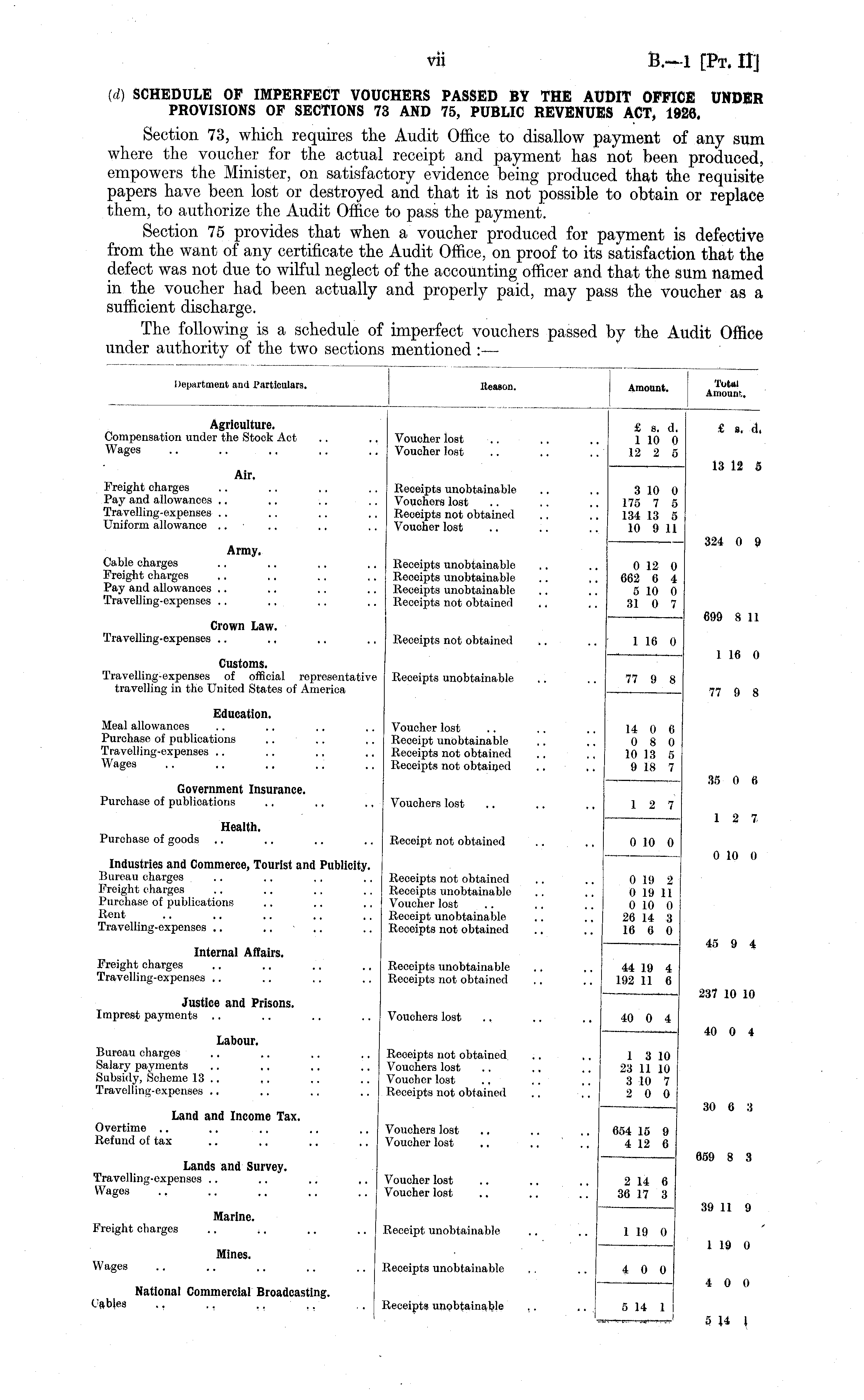 (d) SCHEDULE OF IMPERFECT VOUCHERS PASSED BY THE AUDIT OFFICE UNDER PROVISIONS OF SECTIONS 73 AND 75, PUBLIC REVENUES ACT, 1926. Section 73, which requires the Audit Office to disallow payment of any sum where the voucher for the actual receipt and payment has not been produced, empowers the Minister, on satisfactory evidence being produced that the requisite papers have been lost or destroyed and that it is not possible to obtain or replace them, to authorize the Audit Office to pass the payment. Section 75 provides that when a voucher produced for payment is defective from the want of any certificate the Audit Office, on proof to its satisfaction that the defect was not due to wilful neglect of the accounting officer and that the sum named in the voucher had been actually and properly paid, may pass the voucher as a sufficient discharge. The following is a schedule of imperfect vouchers passed by the Audit Office under authority of the two sections mentioned :—