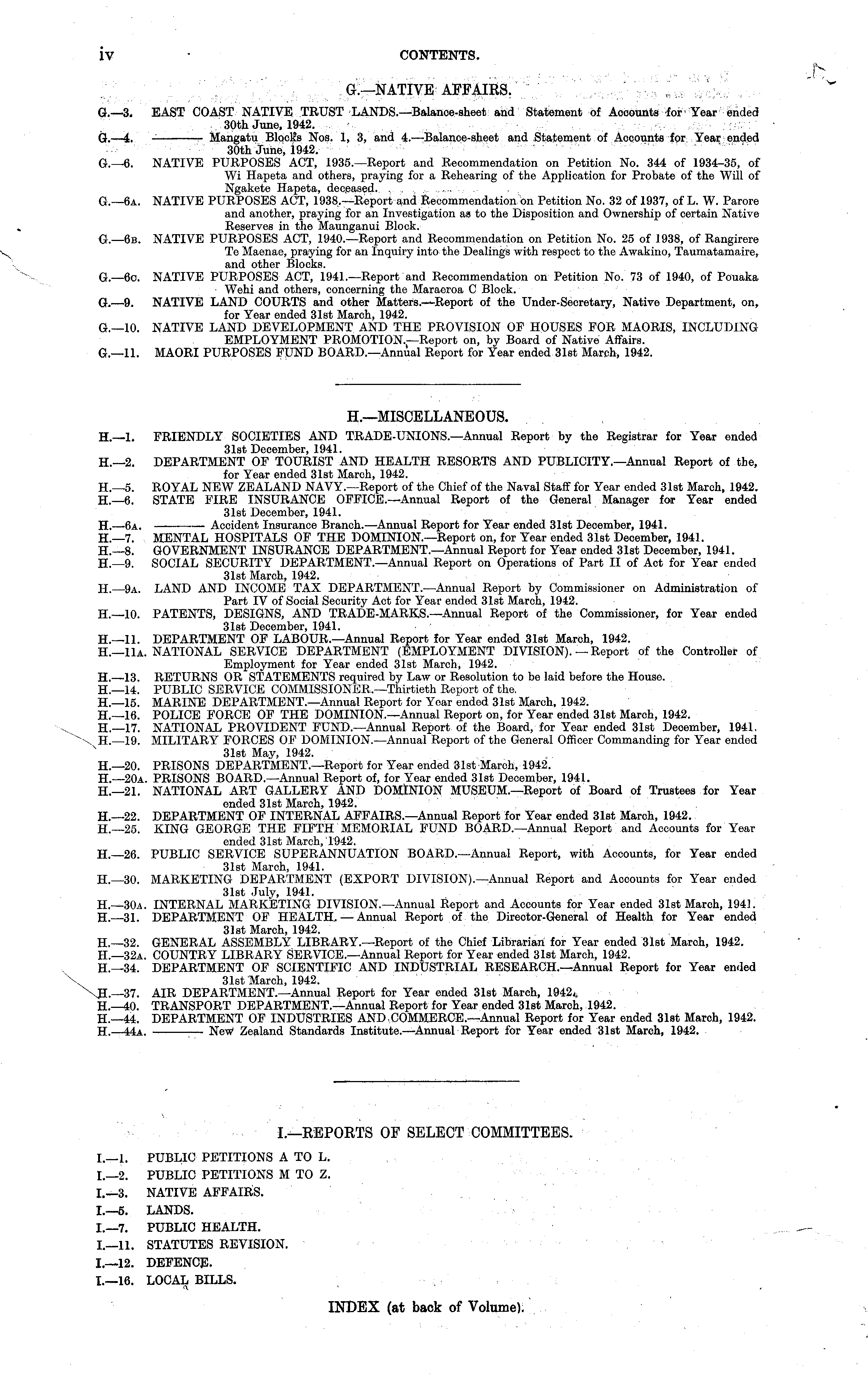 G.—NATIVE AFFAIRS. G.—3. EAST COAST NATIVE TRUST LANDS.—Balance-sheet and Statement of Accounts for Year ended 30th Juno, 1942. G.—4. Mangatu Blocks Nos. 1, 3, and 4.- —Balance-sheet and Statement of Accounts for Year ended 30th June, 1942. G.—6. NATIVE PURPOSES ACT, 1935. —Report and Recommendation on Petition No. 344 of 1934-35, of Wi Hapeta and others, praying for a Rehearing of the Application for Probate of the Will of Ngakete Hapeta, dec.eased. G. —6a. NATIVE PURPOSES ACT, 1938.—Report and Recommendation on Petition No. 32 of 1937, of L. W. Parore and another, praying for an Investigation as to the Disposition and Ownership of certain Native Reserves in the Maunganui Block. G. —6b. NATIVE PURPOSES ACT, 1940. —Report and Recommendation on Petition No. 25 of 1938, of Rangirere Te Maenae, praying for an Inquiry into the Dealings with respect to the Awakino, Taumatamaire, and other Blocks. G.—6c. NATIVE PURPOSES ACT, 1941. —Report and Recommendation on Petition No. 73 of 1940, of Pouaka Wchi and others, concerning the Maraeroa C Block. G. —9. NATIVE LAND COURTS and other Matters.—Report of the Under-Secretary, Native Department, on, for Year ended 31st March, 1942. G.—lo. NATIVE LAND DEVELOPMENT AND THE PROVISION OF HOUSES FOR MAORIS, INCLUDING EMPLOYMENT PROMOTION. —Report on, by Board of Native Affairs. G—ll. MAORI PURPOSES FUND BOARD.—Annual Report for Year ended 31st March, 1942. H.—MISCELLANEOUS. H.—l. FRIENDLY SOCIETIES AND TRADE-UNIONS. —Annual Report by the Registrar for Year ended 31st December, 1941. H.—2. DEPARTMENT OF TOURIST AND HEALTH RESORTS AND PUBLICITY.—AnnuaI Report of the, for Year ended 31st March, 1942. H. —5. ROYAL NEW ZEALAND NAVY. —Report of the Chief of the Naval Staff for Year ended 31st March, 1942. H. —6. STATE FIRE INSURANCE OFFICE.—Annual Report of the General Manager for Year ended 31st December, 1941. H. —-6a. Accident Insurance Branch. —Annual Report for Year ended 31st December, 1941. H. —7. MENTAL HOSPITALS OF THE DOMINION.—Report on, for Year ended 31st December, 1941. H.—B. GOVERNMENT INSURANCE DEPARTMENT. —Annual Report for Year ended 31st December, 1941. H. —9. SOCIAL SECURITY DEPARTMENT. —Annual Report on Operations of Part II of Act for Year ended 31st March, 1942. H.—9a. LAND AND INCOME TAX DEPARTMENT.—AnnuaI Report by Commissioner on Administration of Part IV of Social Security Act for Year ended 31st March, 1942. H.—lo. PATENTS, DESIGNS, AND TRADE-MARKS. —Annual Report of the Commissioner, for Year ended 31st December, 1941. H.—ll. DEPARTMENT OF LABOUR. —Annual Report for Year ended 31st March, 1942. H.—ll a. NATIONAL SERVICE DEPARTMENT (EMPLOYMENT DIVISION).—Report of the Controller of Employment for Year ended 31st March, 1942. H.—l3. RETURNS OR STATEMENTS required by Law or Resolution to be laid before the House. H.—l4. PUBLIC SERVICE COMMISSIONER.—Thirtieth Report of the. H. —15. MARINE DEPARTMENT.—AnnuaI Report for Year ended 31st March. 1942. H.—l6. POLICE FORCE OF THE DOMINION.—AnnuaI Report on, for Year ended 31st March, 1942. H. —17. NATIONAL PROVIDENT FUND.—Annual Report of the Board, for Year ended 31st December, 1941. H.—l9. MILITARY FORCES OF DOMINION. —Annual Report of the General Officer Commanding for Year ended 31st May, 1942. H.—2o. PRISONS DEPARTMENT.—Report for Year ended 31st March, 1942. H.—2oa. PRISONS BOARD.—Annual Report of, for Year ended 31st December, 1941. H.—2l. NATIONAL ART GALLERY AND DOMINION MUSEUM. —-Report of Board of Trustees for Year ended 31st March, 1942. H.—22. DEPARTMENT OF INTERNAL AFFAIRS.—AnnuaI Report for Year ended 31st March, 1942. H. —25. KING GEORGE THE FIFTH MEMORIAL FUND BOARD.—Annual Report and Accounts for Year ended 31st March, 1942. H. —26. PUBLIC SERVICE SUPERANNUATION BOARD. —Annual Report, with Accounts, for Year ended 31st March, 1941. H.—3o. MARKETING DEPARTMENT (EXPORT DIVISION). —Annual Report and Accounts for Year ended 31st July, 1941. H.—3oa. INTERNAL MARKETING DIVISION. —Annual Report and Accounts for Year ended 31st March, 1941. H. —31. DEPARTMENT OF HEALTH. — Annual Report of the Director-General of Hoalth for Year ended 31st March, 1942. H. —32. GENERAL ASSEMBLY LIBRARY. —-Report of tho Chief Librarian for Year ended 31st March, 1942. H. —32a. COUNTRY LIBRARY SERVICE. —Annual Report for Year ended 31st March, 1942. H.—34. DEPARTMENT OF SCIENTIFIC AND INDUSTRIAL RESEARCH.—AnnuaI Report for Year ended 31st March, 1942. ,H. —37. AIR DEPARTMENT. —Annual Report for Year ended 31st March, 1942, H.—4o. TRANSPORT DEPARTMENT. —Annual Report for Year ended 31st March, 1942. H.—44. DEPARTMENT OF INDUSTRIES AND COMMERCE.—AnnuaI Report for Year ended 31st March, 1942. H. —44a. — New Zealand Standards Institute. —Annual Report for Year ended 31st March, 1942.