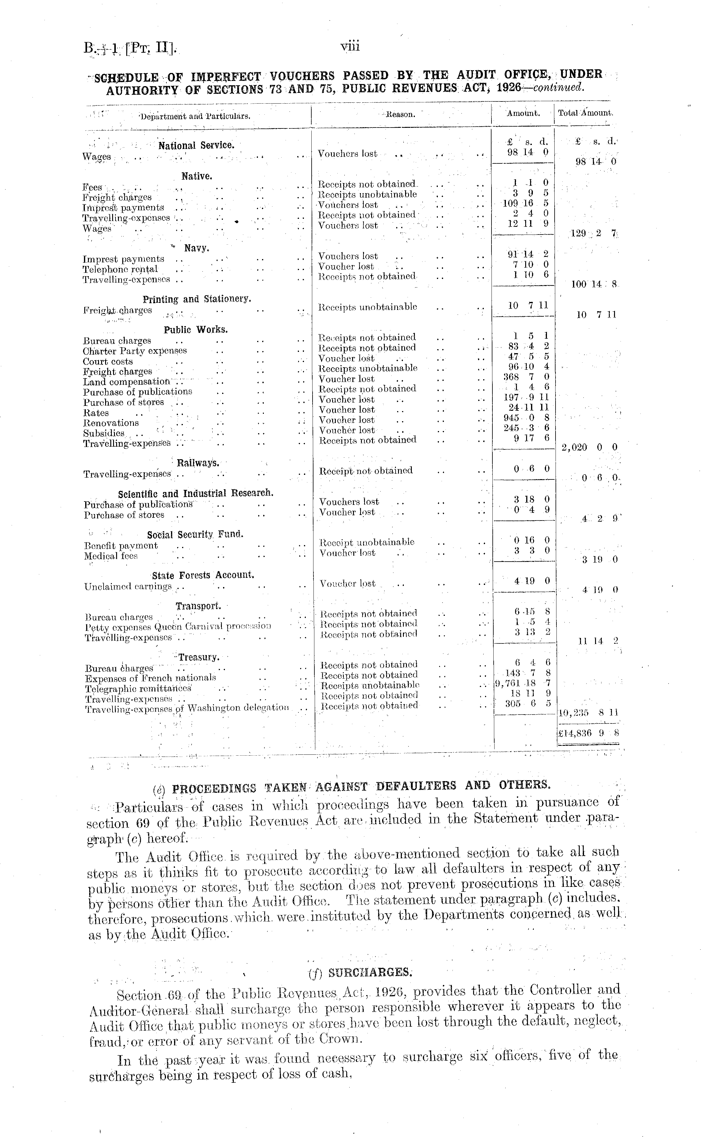 (6) PROCEEDINGS TAKEN- AGAINST DEFAULTERS AND OTHERS. Particulars of cases in which proceedings have been, taken in pursuance of section 69 of the Public Revenues Act. are-included in the Statement under paragraph (c) hereof. The Audit Office is required by the above-mentioned section to take all such steps as it thinks fit to prosecute according to law all defaulters in respect of any public moneys or stores, but the section does not prevent prosecutions in like cases by persons other than the Audit Office. The statement under paragraph (c) includes, therefore, prosecutions .which, were.instituted by the Departments concerned, as-well as by the Audit Office. •(/) SURCHARGES. Section.69-of the Public Revenues, Act, 1926, provides that the Controller and Auditor-General shall surcharge the person responsible wherever it appears to the Audit Office that, public moneys or stores have'been lost through the default, neglect, fraud,-or error of any servant of the Crown. In the past year it was. found necessary to surcharge six officers, five Of the surcharges being in respect of loss of cash,