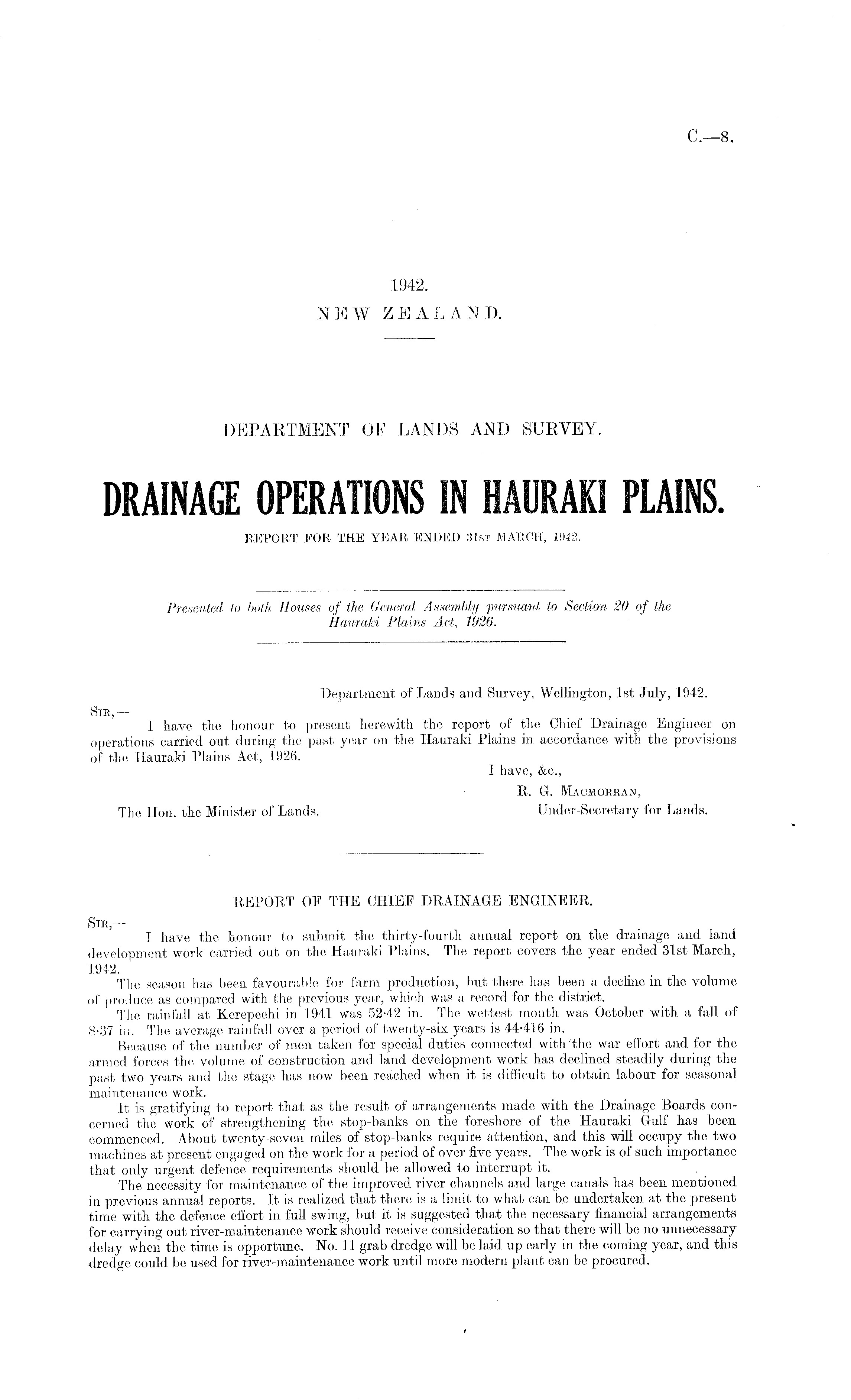 DEPARTMENT OF LANDS AND SURVEY. DRAINAGE OPERATIONS IN HAURAKI PLAINS. REPORT FOR THE YEAR ENDED 31st MARCH, 1942.