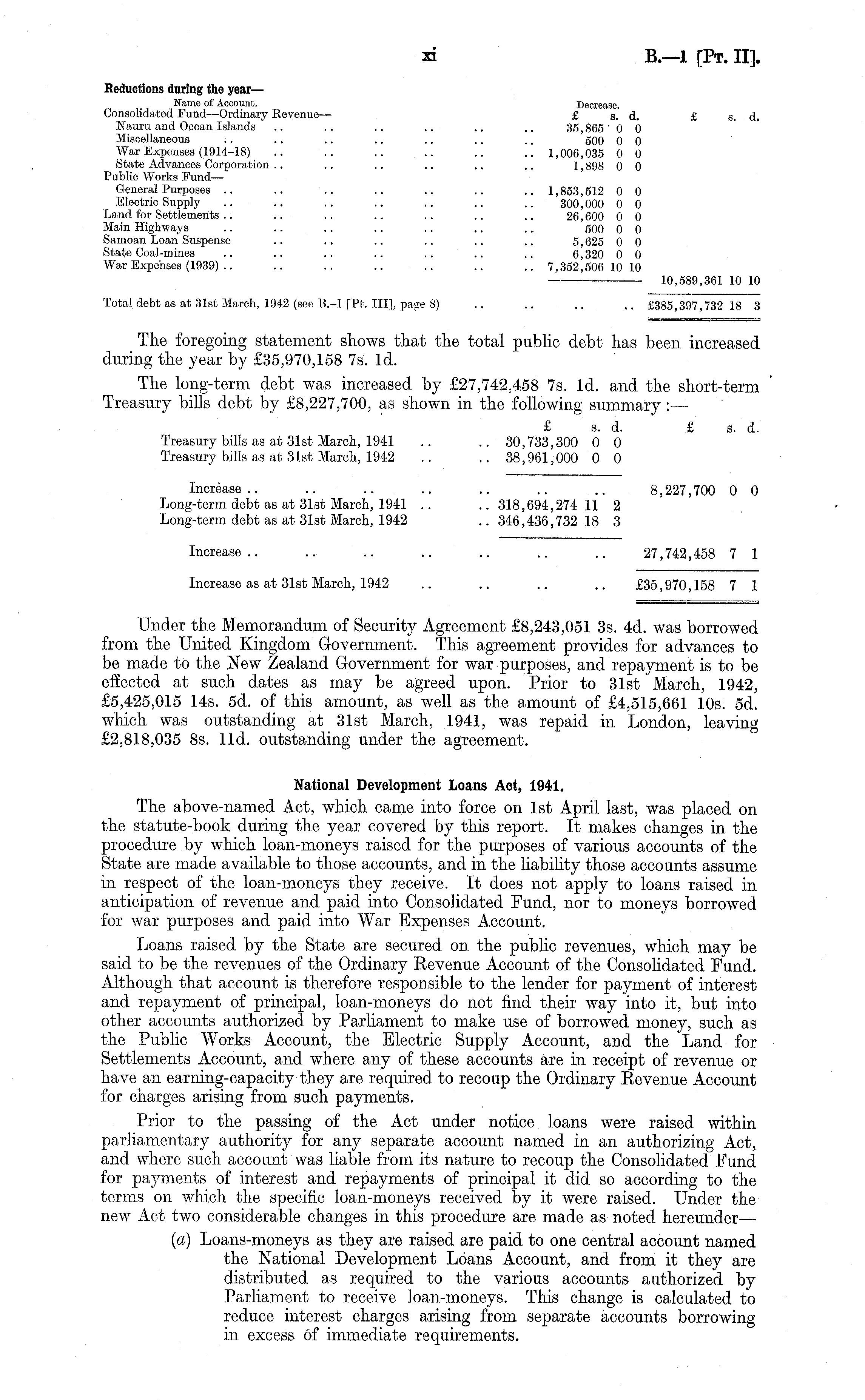 Reductions during the year— Name of Account. Decrease. Consolidated Fund—Ordinary Revenue— £ s.' d. £ s. d. Nauru and Ocean Islands .. .. .. .. .. .. 35,865' 0 0 Miscellaneous .. .. .. .. .. .. .. 500 0 0 War Expenses (1014-18) .. .. .. .. .. .. 1,006,035 0 0 State Advaneos Corporation .. .. .. .. .. .. 1,898 0 0 Public Works Fund— General Purposes .. .. .. .. .. .. .. J.,853,512 0 0 Electric Supply .. .. .. .. .. .. .. 300,000 0 0 Land for Settlements .. .. .. .. .. .. .. 26,600 0 0 Main Highways .. .. .. .. .. .. .. 500 0 0 Sarnoan Loan Suspense .. .. .. .. .. .. 5,625 0 0 State Coal-mines .. .. .. .. .. .. .. 6,320 0 0 War Expenses (1939) .. .. .. .. .. .. .. 7,352,506 10 10 10,589,361 10 10 Total debt as at 31st March, 1942 (see 8.-l fPt. Ill], page 8) .. .. .. .. £385,397,732 18 3 The foregoing statement shows that the total public debt has been increased during the year by £35,970,158 7s. Id. The long-term debt was increased by £27,742,458 7s. Id. and the short-term Treasury bills debt by £8,227,700, as shown in the following summary £ s. d. £ s. d. Treasury bills as at 31st March, 1941 .. .. 30,733,300 0 0 Treasury bills as at 31st March, 1912 .. .. 38,961,000 0 0 Increase.. .. .. .. .. .. .. 8,227,700 0 0 Long-term debt as at 31st March, 1941 .. .. 318,694,274 11 2 Long-term debt as at 31st March, 1942 .. 346,436,732 18 3 Increase.. .. .. .. .. .. .. 27,742,458 7 1 Increase as at 31st March, 1942 .. .. .. .. £35,970,158 7 1 Under the Memorandum of Security Agreement £8,243,051 3s. 4d. was borrowed from the United Kingdom Government. This agreement provides for advances to be made to the New Zealand Government for war purposes, and repayment is to be effected at such dates as may be agreed upon. Prior to 31st March, 1942, £5,425,015 14s. sd. of this amount, as well as the amount of £4,515,661 10s. sd. which was outstanding at 31st March, 1941, was repaid in London, leaving £2,818,035 Bs. lid. outstanding under the agreement. National Development Loans Act, 1941. The above-named Act, which came into force on Ist April last, was placed on the statute-book during the year covered by this report. It makes changes in the procedure by which loan-moneys raised for the purposes of various accounts of the State are made available to those accounts, and in the liability those accounts assume in respect of the loan-moneys they receive. It does not apply to loans raised in anticipation of revenue and paid into Consolidated Fund, nor to moneys borrowed for war purposes and paid into War Expenses Account. Loans raised by the State are secured on the public revenues, which may be said to be the revenues of the Ordinary Revenue Account of the Consolidated Fund. Although that account is therefore responsible to the lender for payment of interest and repayment of principal, loan-moneys do not find their way into it, but into other accounts authorized by Parliament to make use of borrowed money, such as the Public Works Account, the Electric Supply Account, and the Land for Settlements Account, and where any of these accounts are in receipt of revenue or have an earning-capacity they are required to recoup the Ordinary Revenue Account for charges arising from such payments. Prior to the passing of the Act under notice loans were raised within parliamentary authority for any separate account named in an authorizing Act, and where such account was liable from its nature to recoup the Consolidated Fund for payments of interest and repayments of principal it did so according to the terms on which the specific loan-moneys received by it were raised. Under the new Act two considerable changes in this procedure are made as noted hereunder—(a) Loans-moneys as they are raised are paid to one central account named the National Development Loans Account, and from it they are distributed as required to the various accounts authorized by Parliament to receive loan-moneys. This change is calculated to reduce interest charges arising from separate accounts borrowing in excess of immediate requirements.