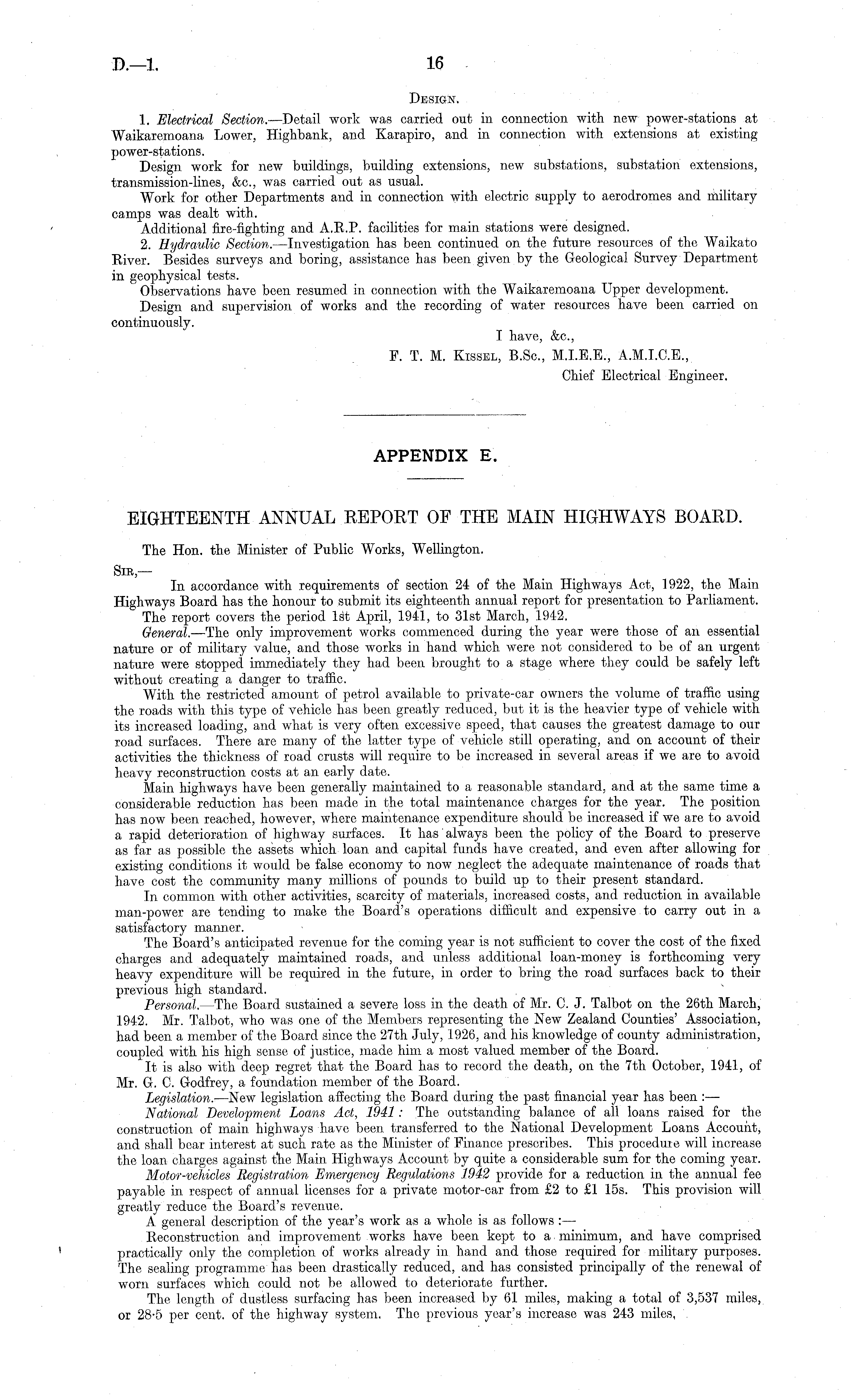 APPENDIX E. EIGHTEENTH ANNUAL REPORT OF THE MAIN HIGHWAYS BOARD. The Hon. the Minister of Public Works, Wellington. Sib, — In accordance with requirements of section 24 of the Main Highways Act, 1922, the Main Highways Board has the honour to submit its eighteenth annual report for presentation to Parliament. The report covers the period Ist April, 1941, to 31st March, 1942. General. The only improvement works commenced during the year were those of an essential nature or of military value, and those works in hand which were not considered to be of an urgent nature were stopped immediately they had been brought to a stage where they could be safely left without creating a danger to traffic. With the restricted amount of petrol available to private-car owners the volume of traffic using the roads with this type of vehicle has been greatly reduced, but it is the heavier type of vehicle with its increased loading, and what is very often excessive speed, that causes the greatest damage to our road surfaces. There are many of the latter type of vehicle still operating, and on account of their activities the thickness of road crusts will require to be increased in several areas if we are to avoid heavy reconstruction costs at an early date. Main highways have been generally maintained to a reasonable standard, and at the same time a considerable reduction has been made in the total maintenance charges for the year. The position has now been reached, however, where maintenance expenditure should be increased if we are to avoid a rapid deterioration of highway surfaces. It has always been the policy of the Board to preserve as far as possible the assets which loan and capital funds have created, and even after allowing for existing conditions it would be false economy to now neglect the adequate maintenance of roads that have cost the community many millions of pounds to build up to their present standard. In common with other activities, scarcity of materials, increased costs, and reduction in available man-power are tending to make the Board's operations difficult and expensive to carry out in a satisfactory manner. The Board's anticipated revenue for the coming year is not sufficient to cover the cost of the fixed charges and adequately maintained roads, and unless additional loan-money is forthcoming very heavy expenditure will be required in the future, in order to bring the road surfaces back to their previous high standard. Personal. —The Board sustained a severe loss in the death of Mr. C. J. Talbot on the 26th March, 1942. Mr. Talbot, who was one of the Members representing the New Zealand Counties' Association, had been a member of the Board since the 27th July, 1926, and his knowledge of county administration, coupled with his high sense of justice, made him a most valued member of the Board. It is also with deep regret that the Board has to record the death, on the 7th October, 1941, of Mr. G. C. Godfrey, a foundation member of the Board. Legislation. —New legislation affecting the Board during the past financial year has been National Development Loans Act, 1941: The outstanding balance of all loans raised for the construction of main highways have been transferred to the National Development Loans Account, and shall bear interest at such rate as the Minister of Finance prescribes. This procedure will increase the loan charges against tlie Main Highways Account by quite a considerable sum for the coming year. Motor-vehicles Registration Emergency Regulations 1942 provide for a reduction in the annual fee payable in respect of annual licenses for a private motor-car from £2 to £1 15s. This provision will greatly reduce the Board's revenue. A general description of the year's work as a whole is as follows :— Reconstruction and improvement works have been kept to a minimum, and have comprised practically only the completion of works already in hand and those required for military purposes. The sealing programme has been drastically reduced, and has consisted principally of the renewal of worn surfaces which could not be allowed to deteriorate further. The length of dustless surfacing has been increased by 61 miles, making a total of 3,537 miles, or 28-5 per cent, of the highway system. The previous year's increase was 243 miles,