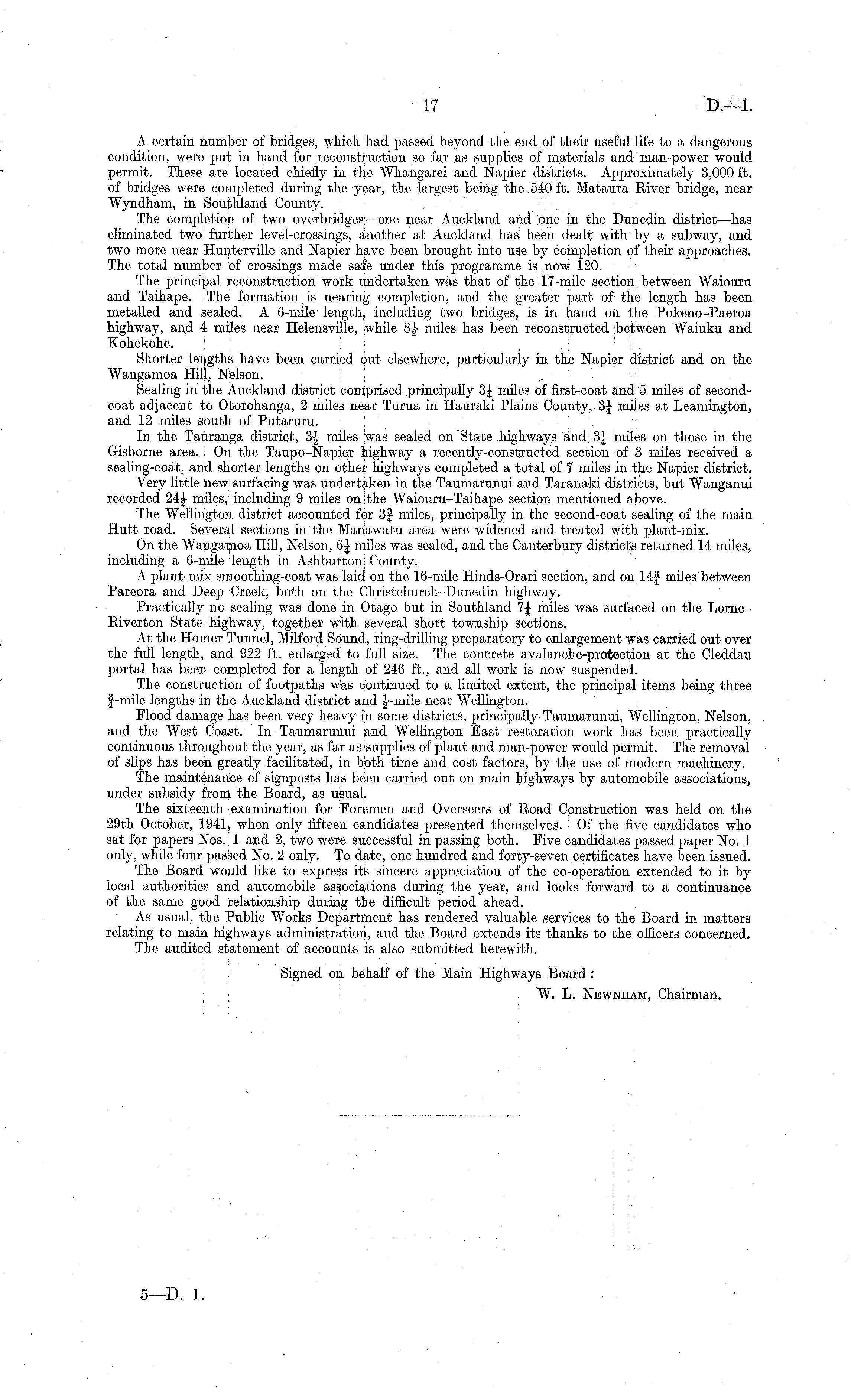 A certain number of bridges, which had passed beyond the end of their useful life to a dangerous condition, were put in hand for reconstruction so far as supplies of materials and man-power would permit. These are located chiefly in the Whangarei and Napier districts. Approximately 3,000 ft. of bridges were completed during the year, the largest being the 540 ft. Mataura River bridge, near Wyndham, in Southland County. The completion of two overbridges: —one near Auckland and one in the Dunedin district —has eliminated two further level-crossings, another at Auckland has been dealt with by a subway, and two more near Hunterville and Napier have been brought into use by completion of their approaches. The total number of crossings made safe under this programme is now 120. The principal reconstruction work undertaken was that of the 17-mile section between Waiouru and Taihape. The formation is nearing completion, and the greater part of the length has been metalled and sealed. A 6-mile length, including two bridges, is in hand on the Pokeno-Paeroa highway, and 4 miles near Helensville, while 8| miles has been reconstructed between Waiuku and Kohekohe. Shorter leijgths have been carried out elsewhere, particularly in the Napier district and on the Wangainoa Hill, Nelson. Sealing in the Auckland district comprised principally 3f miles of first-coat and 5 miles of secondcoat adjacent to Otorohanga, 2 miles near Turua in Hauraki Plains County, 3J- miles at Leamington, and 12 miles south of Putaruru. In the Tauranga district, 3| miles was sealed on State highways and 3J miles on those in the Gisborne area. On the Taupo-Napier highway a recently-constructed section of 3 miles received a sealing-coat, and shorter lengths on other highways completed a total of 7 miles in the Napier district. Very little new surfacing was undertaken in the Taumarunui and Taranaki districts, but Wanganui recorded 24| miles; including 9 miles on the Waiouru-Taihape section mentioned above. The Wellington district accounted for 3§ miles, principally in the second-coat sealing of the main Hutt road. Several sections in the Mariawatu area were widened and treated with plant-mix. On the Wangamoa Hill, Nelson, 6J miles was sealed, and the Canterbury districts returned 14 miles, including a 6-mile length in Ashburton: County. A plant-mix smoothing-coat waslaid on the 16-mile Hinds-Orari section, and on 14| miles between Pareora and Deep Creek, both on the Christchurch-Dunedin highway. Practically no sealing was done in Otago but in Southland 1\ miles was surfaced on the LorneRiverton State highway, together with several short township sections. At the Homer Tunnel, Milford Sound, ring-drilling preparatory to enlargement was carried out over the full length, and 922 ft. enlarged to full size. The concrete avalanche-protection at the Cleddau portal has been completed for a length of 246 ft., and all work is now suspended. The construction of footpaths was continued to a limited extent, the principal items being three f-mile lengths in the Auckland district and J-mile near Wellington. Flood damage has been very heavy in some districts, principally Taumarunui, Wellington, Nelson, and the West Coast. In Taumarunui and Wellington East restoration work has been practically continuous throughout the year, as far as supplies of plant and man-power would permit. The removal of slips has been greatly facilitated, in both time and cost factors, by the use of modern machinery. The maintenance of signposts has been carried out on main highways by automobile associations, under subsidy from the Board, as usual. The sixteenth examination for Foremen and Overseers of Road Construction was held on the 29th October, 1941, when only fifteen candidates presented themselves. Of the five candidates who sat for papers Nos. 1 and 2, two were successful in passing both. Five candidates passed paper No. 1 only, while four passed No. 2 only. To date, one hundred and forty-seven certificates have been issued. The Board, would like to express its sincere appreciation of the co-operation extended to it by local authorities and automobile associations during the year, and looks forward to a continuance of the same good relationship during the difficult period ahead. As usual, the Public Works Department has rendered valuable services to the Board in matters relating to main highways administration, and the Board extends its thanks to the officers concerned. The audited statement of accounts is also submitted herewith. Signed on behalf of the Main Highways Board: W. L. Newniiam, Chairman.