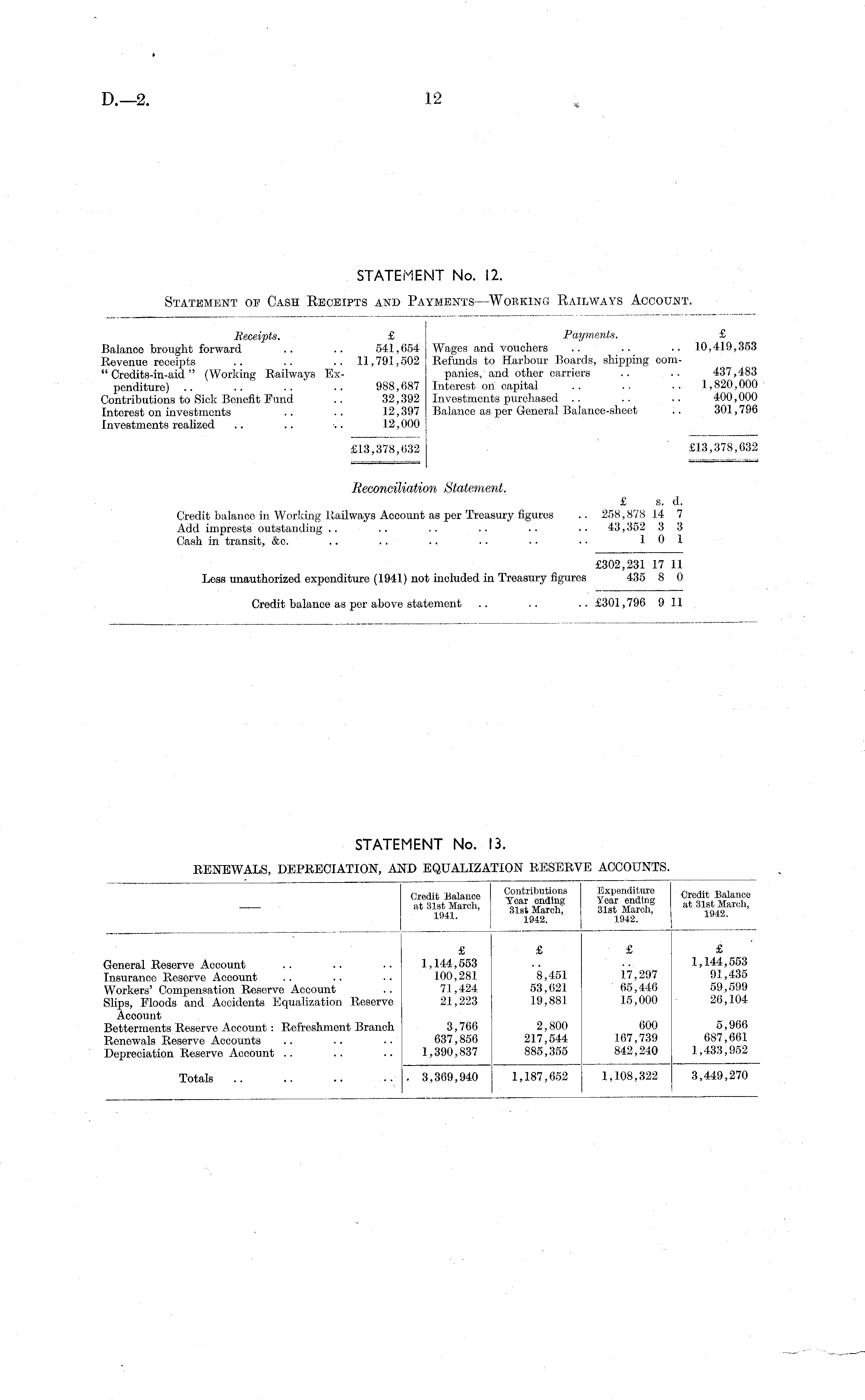 STATEMENT No. 12. Statement of Cash Receipts and Payments—Working Railways Account.