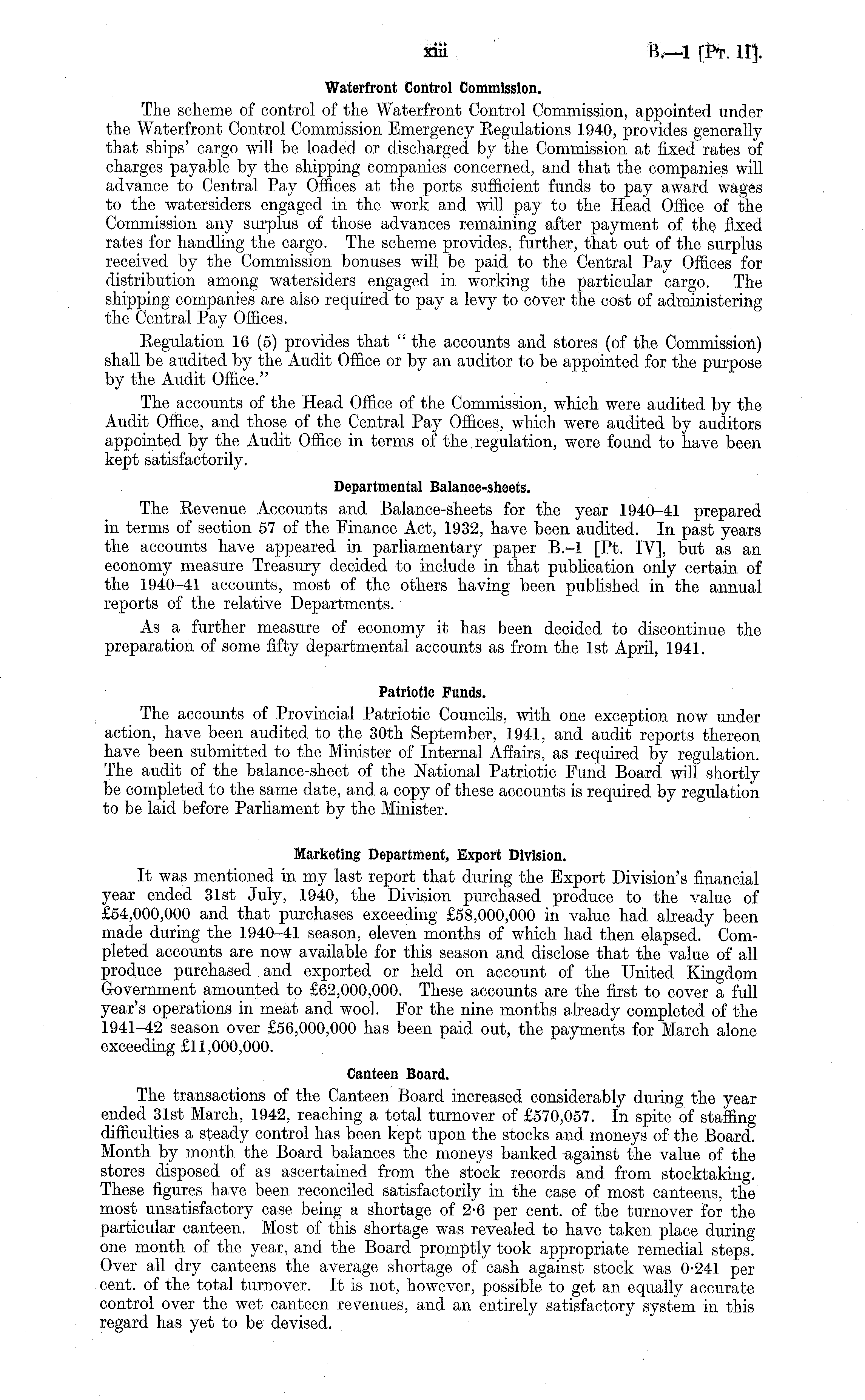 Waterfront Control Commission. The scheme of control of the Waterfront Control Commission, appointed under the Waterfront Control Commission Emergency Regulations 1940, provides generally that ships' cargo will be loaded or discharged by the Commission at fixed rates of charges payable by the shipping companies concerned, and that the companies will advance to Central Pay Offices at the ports sufficient funds to pay award wages to the watersiders engaged in the work and will pay to the Head Office of the Commission any surplus of those advances remaining after payment of the fixed rates for handling the cargo. The scheme provides, further, that out of the surplus received by the Commission bonuses will be paid to the Central Pay Offices for distribution among watersiders engaged in working the particular cargo. The shipping companies are also required to pay a levy to cover the cost of administering the Central Pay Offices. Regulation 16 (5) provides that " the accounts and stores (of the Commission) shall be audited by the Audit Office or by an auditor to be appointed for the purpose by the Audit Office." The accounts of the Head Office of the Commission, which were audited by the Audit Office, and those of the Central Pay Offices, which were audited by auditors appointed by the Audit Office in terms of the regulation, were found to have been kept satisfactorily. Departmental Balance-sheets. The Revenue Accounts and Balance-sheets for the year 1940-41 prepared in terms of section 57 of the Finance Act, 1932, have been audited. In past years the accounts have appeared in parliamentary paper 8.-l [Pt. IV], but as an economy measure Treasury decided to include in that publication only certain of the 1940-41 accounts, most of the others having been published in the annual reports of the relative Departments. As a further measure of economy it has been decided to discontinue the preparation of some fifty departmental accounts as from the Ist April, 1941. Patriotic Funds. The accounts of Provincial Patriotic Councils, with one exception now under action, have been audited to the 30th September, 1941, and audit reports thereon have been submitted to the Minister of Internal Affairs, as required by regulation. The audit of the balance-sheet of the National Patriotic Fund Board will shortly be completed to the same date, and a copy of these accounts is required by regulation to be laid before Parliament by the Minister. Marketing Department, Export Division. It was mentioned in my last report that during the Export Division's financial year ended 31st July, 1940, the Division purchased produce to the value of £54,000,000 and that purchases exceeding £58,000,000 in value had already been made during the 1940-41 season, eleven months of which had then elapsed. Completed accounts are now available for this season and disclose that the value of all produce purchased and exported or held on account of the United Kingdom Government amounted to £62,000,000. These accounts are the first to cover a full year's operations in meat and wool. For the nine months already completed of the 1941-42 season over £56,000,000 has been paid out, the payments for March alone exceeding £11,000,000. Canteen Board. The transactions of the Canteen Board increased considerably during the year ended 31st March, 1942, reaching a total turnover of £570,057. In spite of staffing difficulties a steady control has been kept upon the stocks and moneys of the Board. Month by month the Board balances the moneys banked against the value of the stores disposed of as ascertained from the stock records and from stocktaking. These figures have been reconciled satisfactorily in the case of most canteens, the most unsatisfactory case being a shortage of 2-6 per cent, of the turnover for the particular canteen. Most of this shortage was revealed to have taken place during one month of the year, and the Board promptly took appropriate remedial steps. Over all dry canteens the average shortage of cash against stock was 0-241 per cent, of the total turnover. It is not, however, possible to get an equally accurate control over the wet canteen revenues, and an entirely satisfactory system in this regard has yet to be devised.