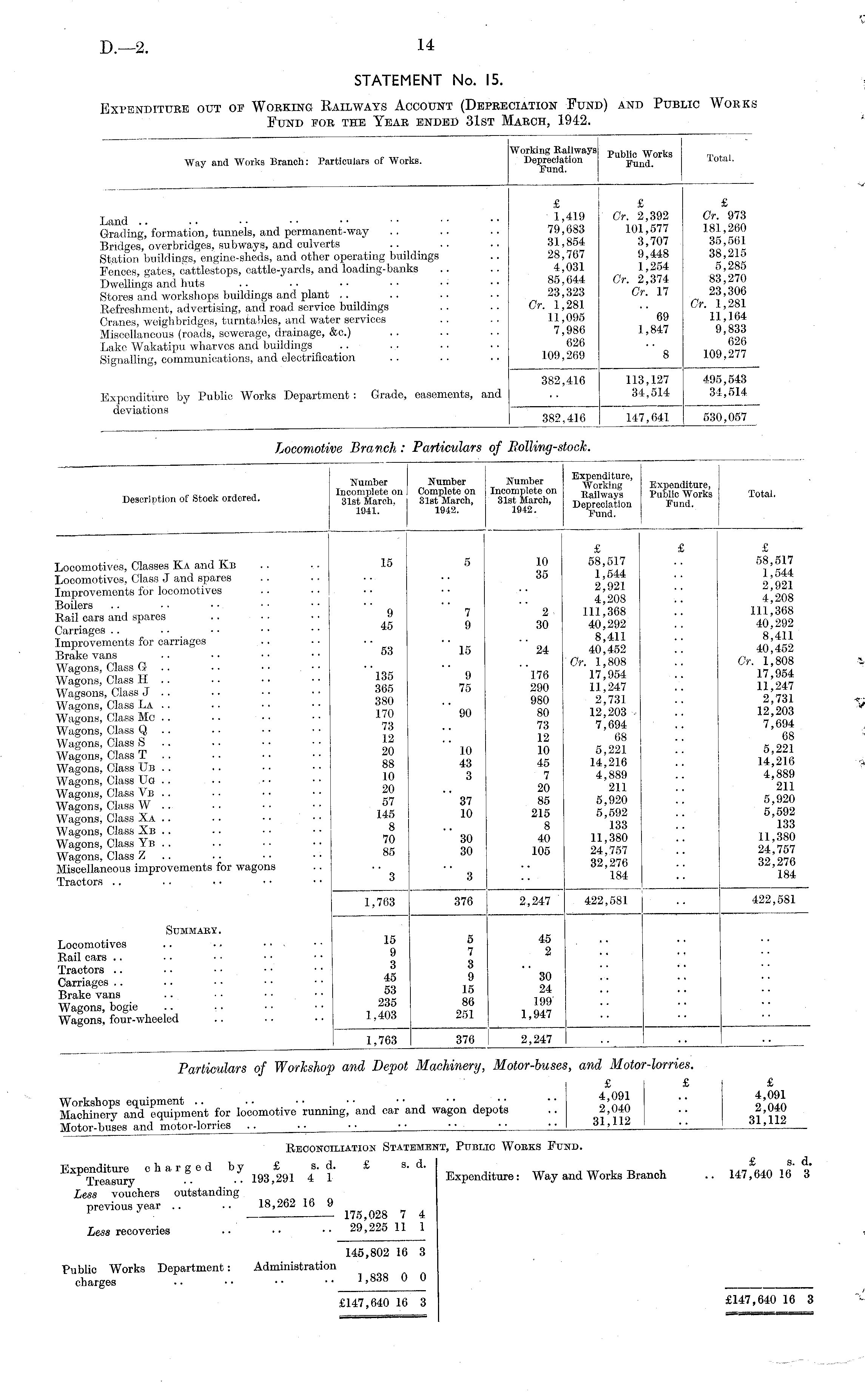 STATEMENT No. 15. Expenditure out of Working Railways Account (Depreciation Fund) and Public Works Fund for the Year ended 31st March, 1942.